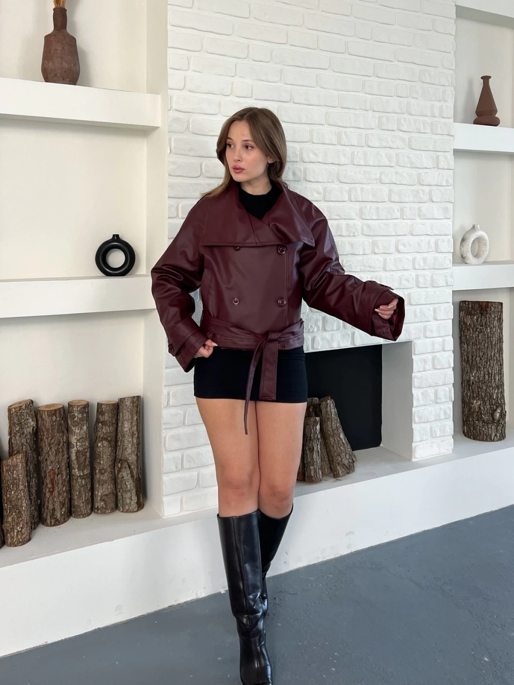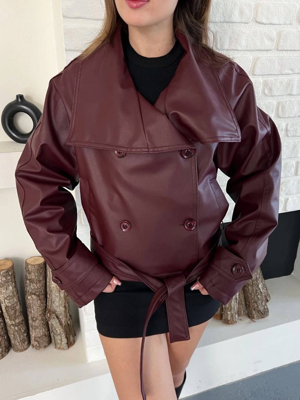 Bel Kuşaklı Kol Detaylı Deri Ceket Bordo