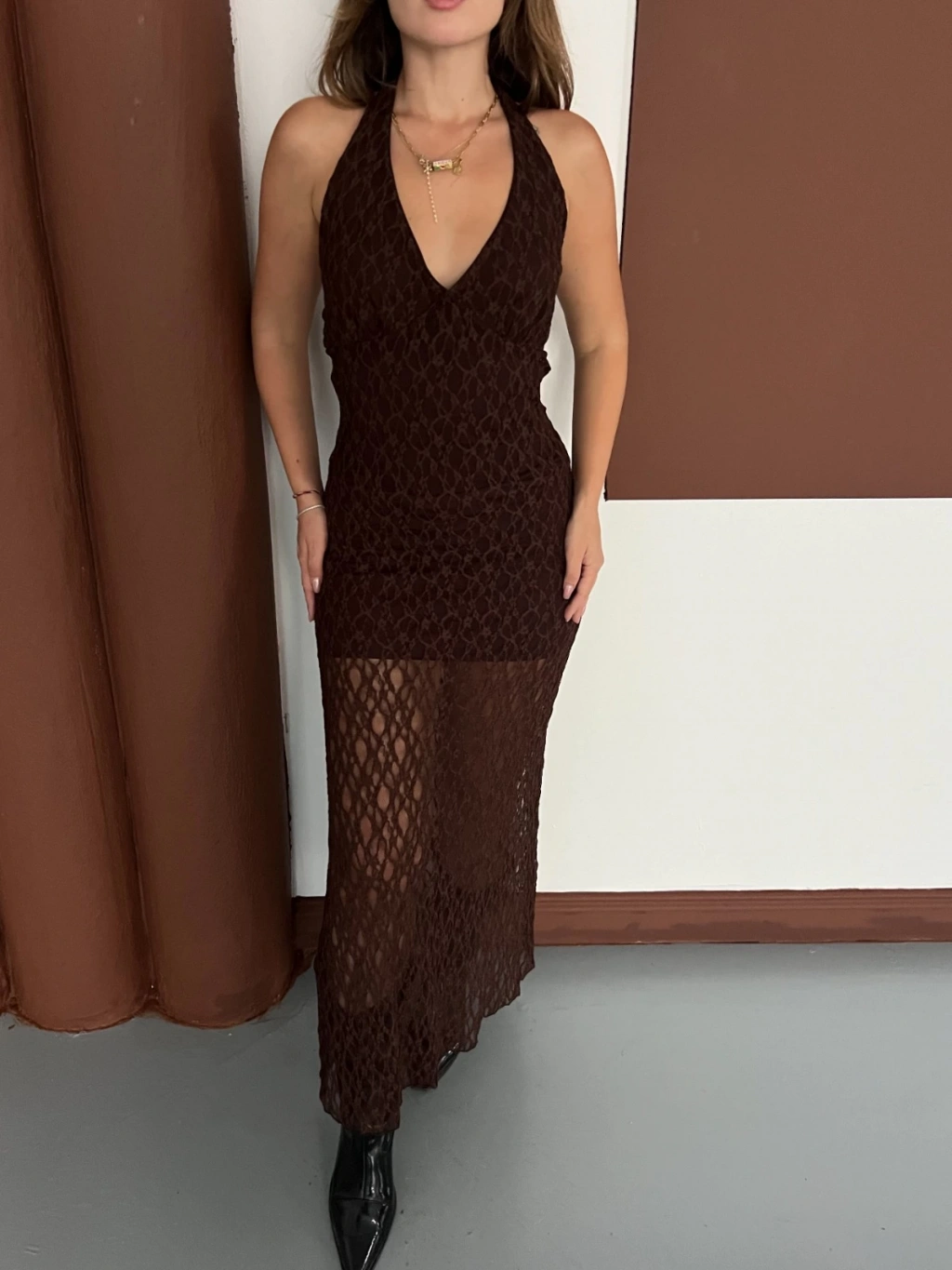 Boyundan Bağlamalı Örgü Detaylı Uzun Elbise Kahverengi