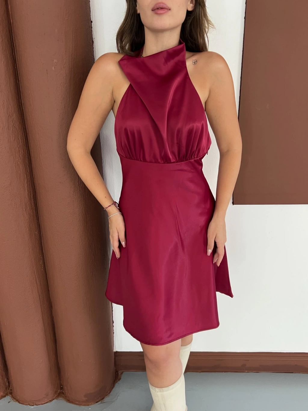 Boyundan Bağlamalı Saten Mini Elbise Bordo