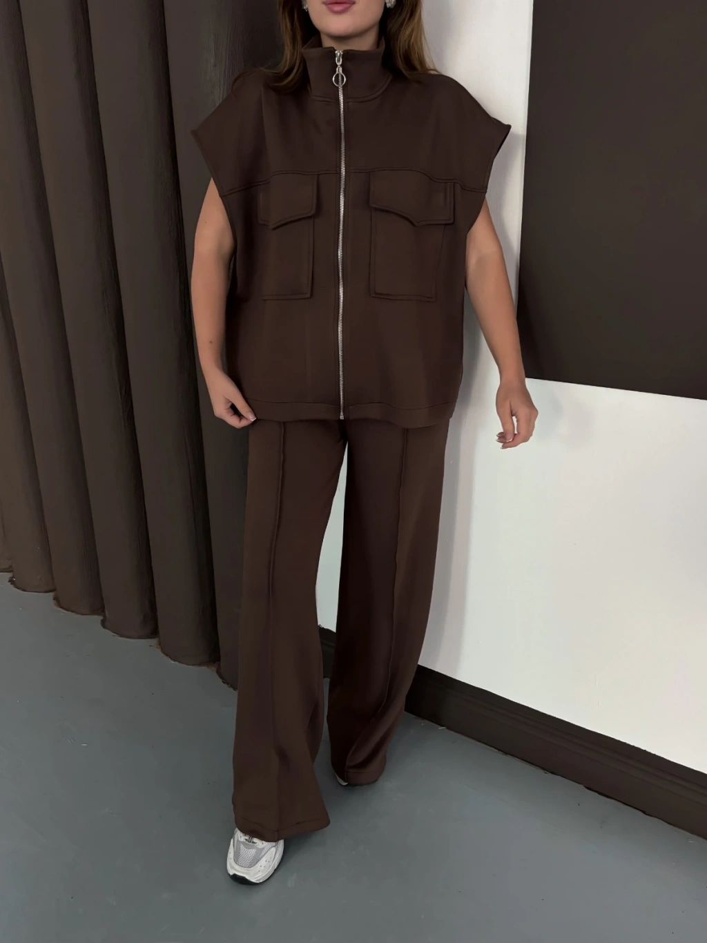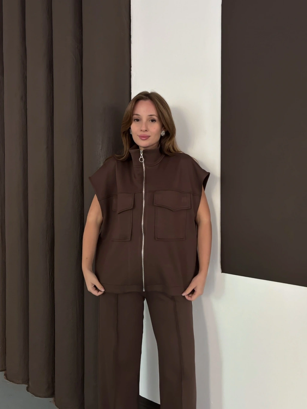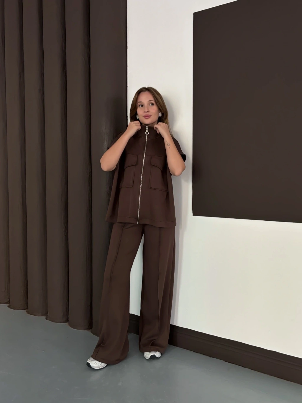 Cep Detaylı Fermuarlı Yarasa Kol Takım Acı Kahve