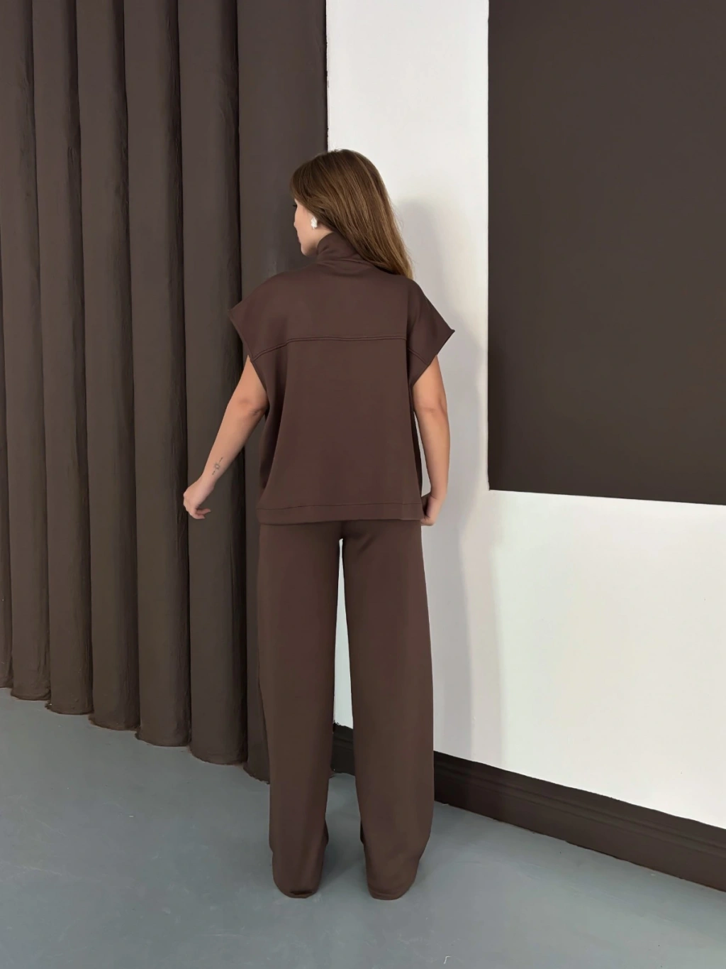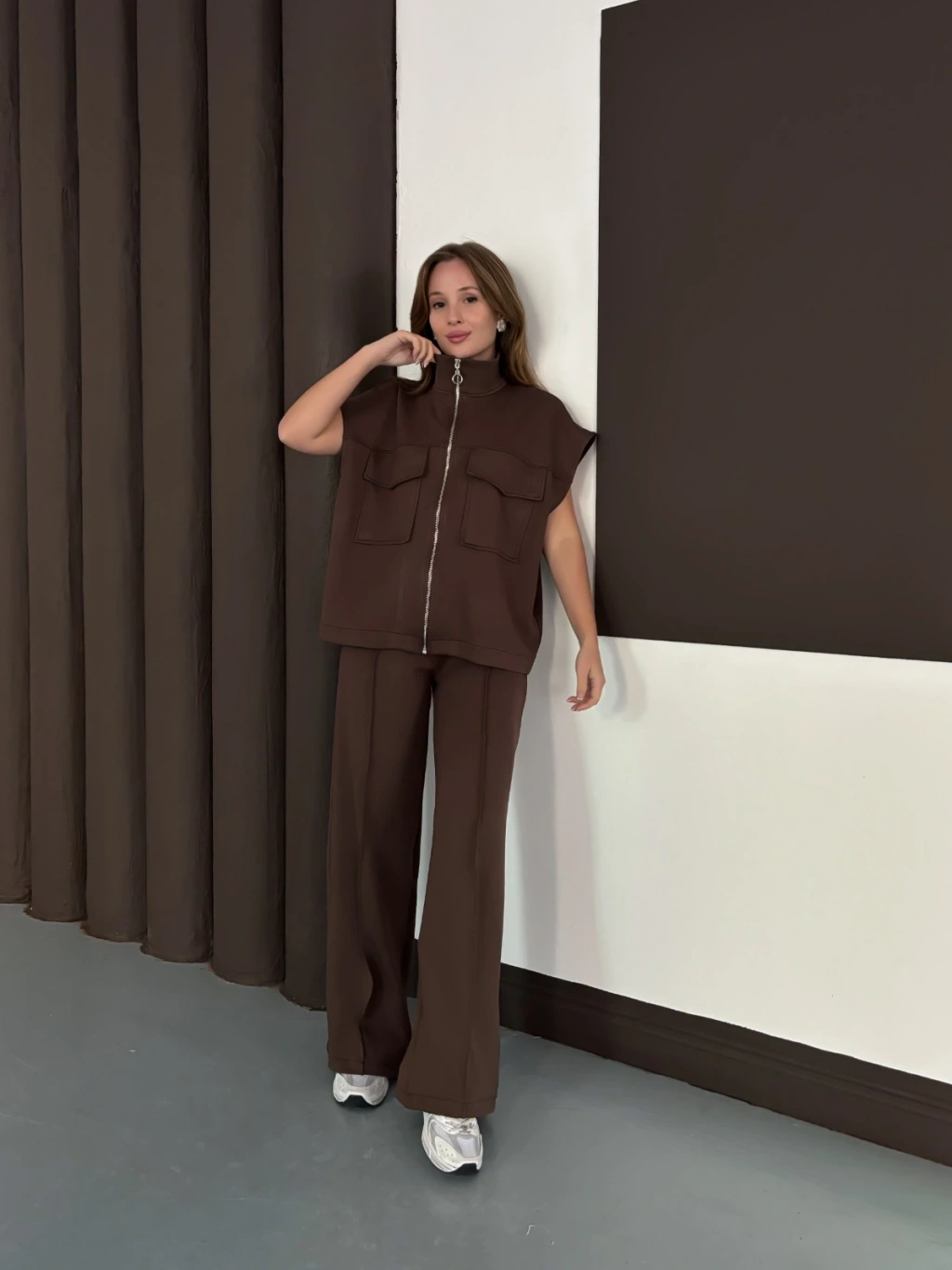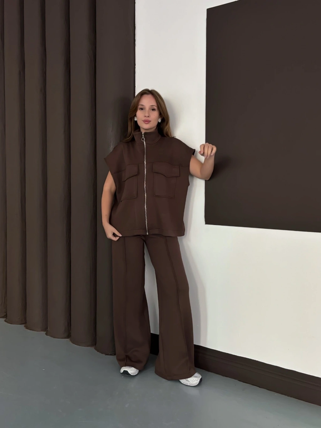 Cep Detaylı Fermuarlı Yarasa Kol Takım Acı Kahve
