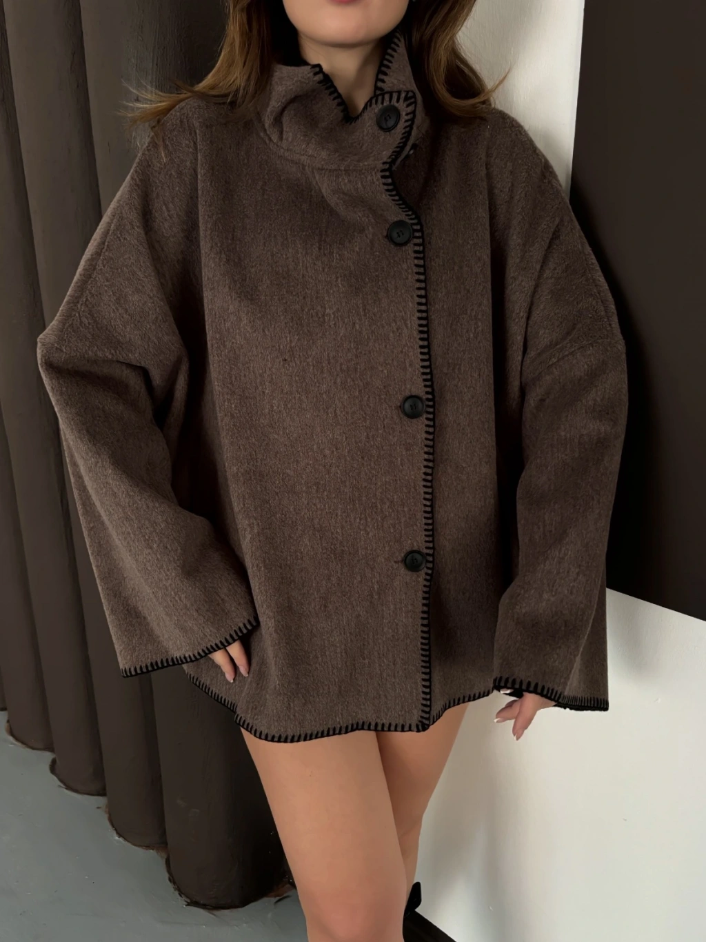 Çoban Dikiş Detaylı Boğazlı Kaşe Kaban Kahve