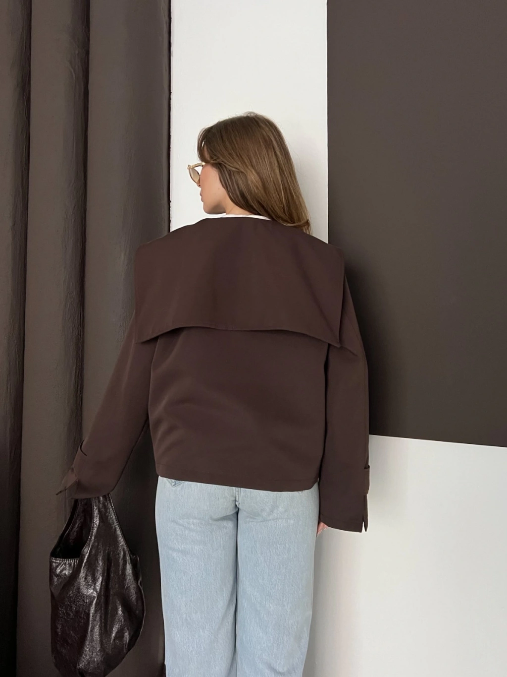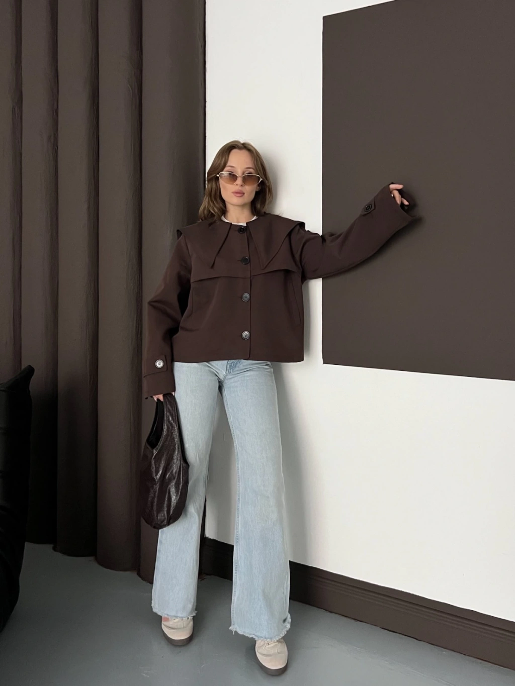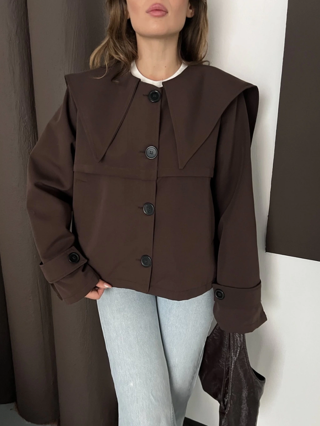 Düğme Detay Bebe Yaka Kısa Ceket Kahverengi