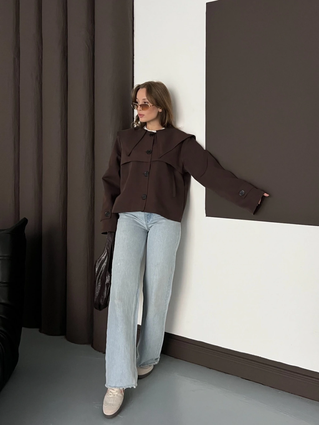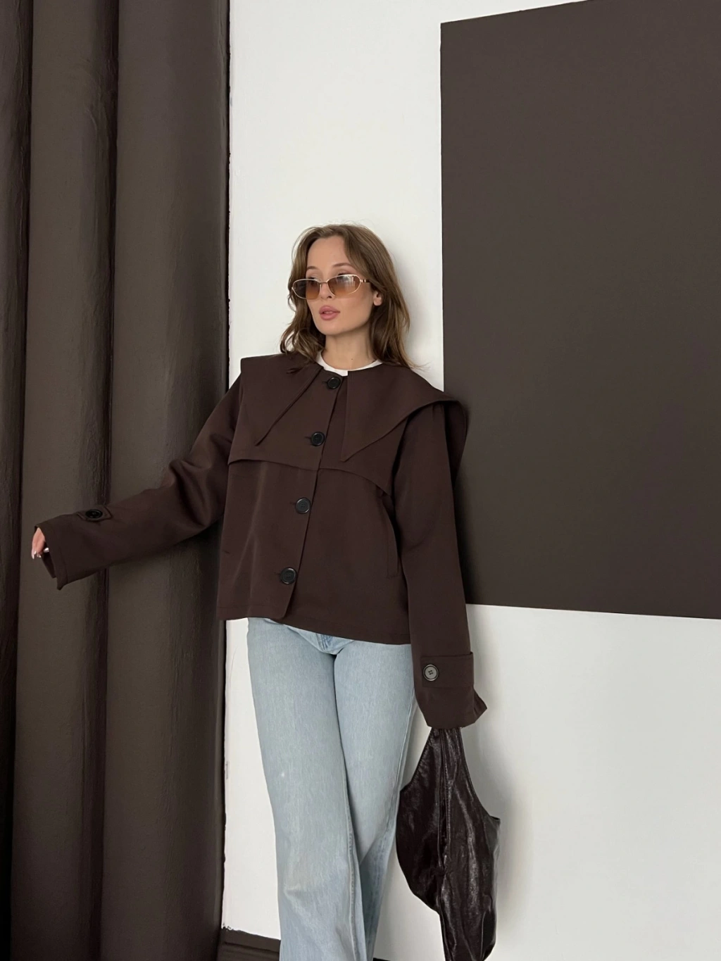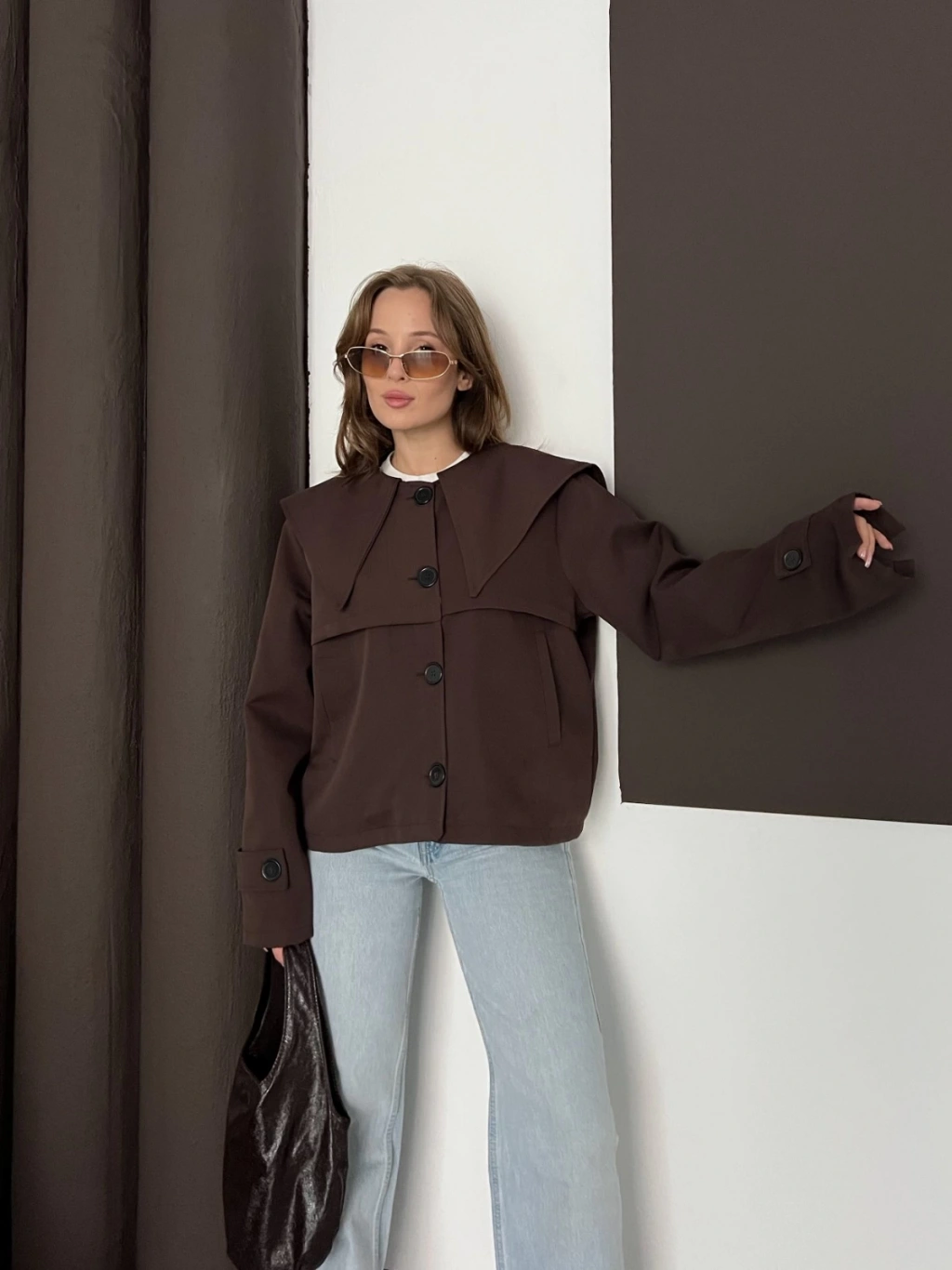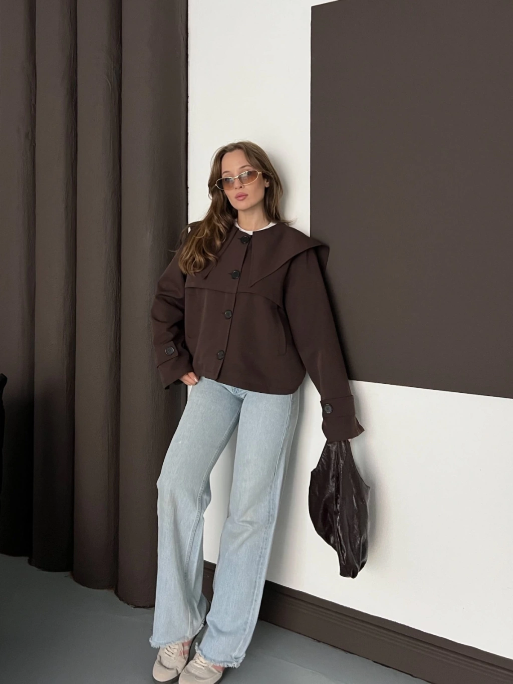 Düğme Detay Bebe Yaka Kısa Ceket Kahverengi
