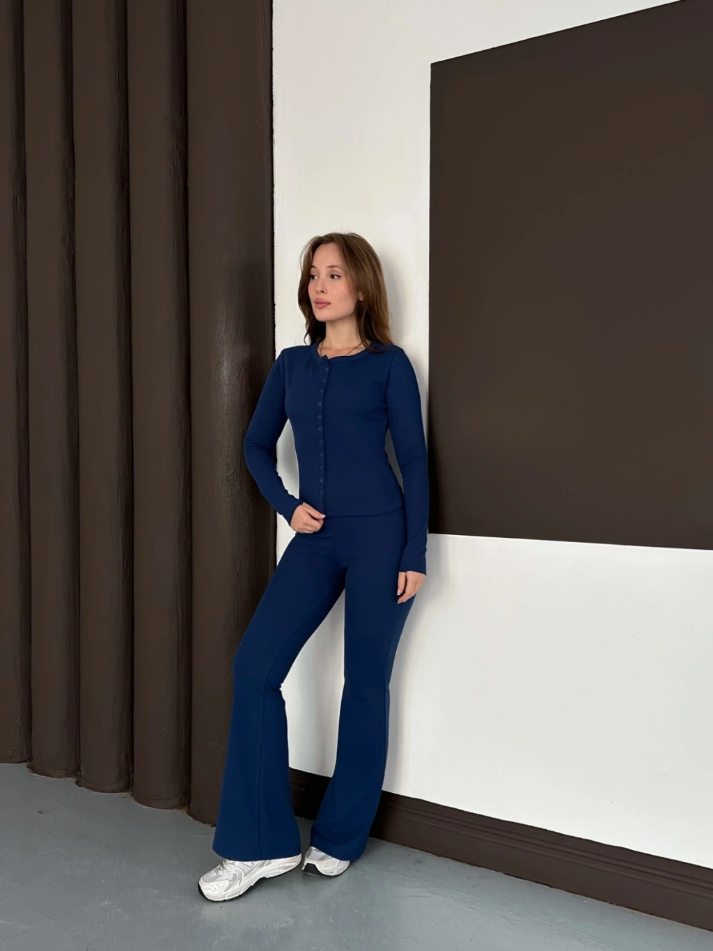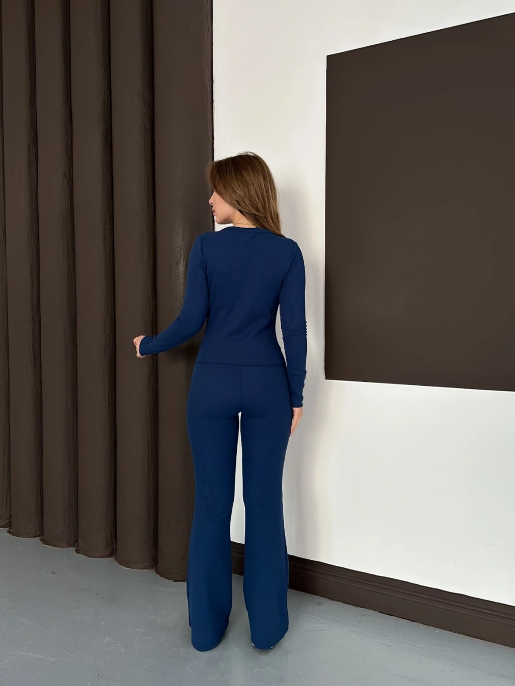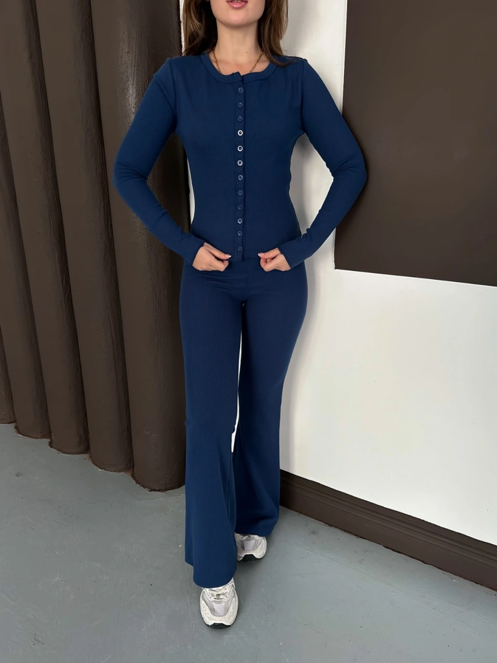 Düğme Detaylı İspanyol Paça İkili Set Lacivert