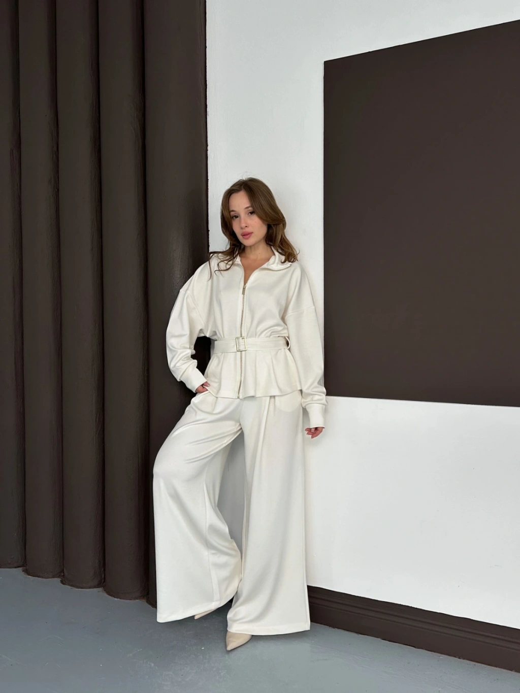 Fermuarlı Kemer Detaylı İkili Takım Beyaz