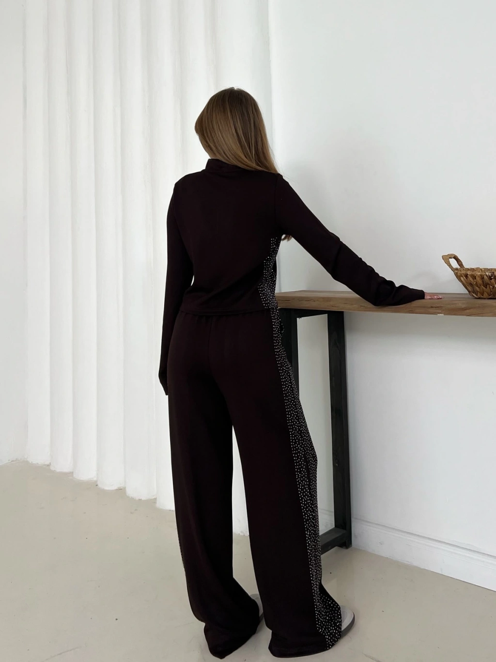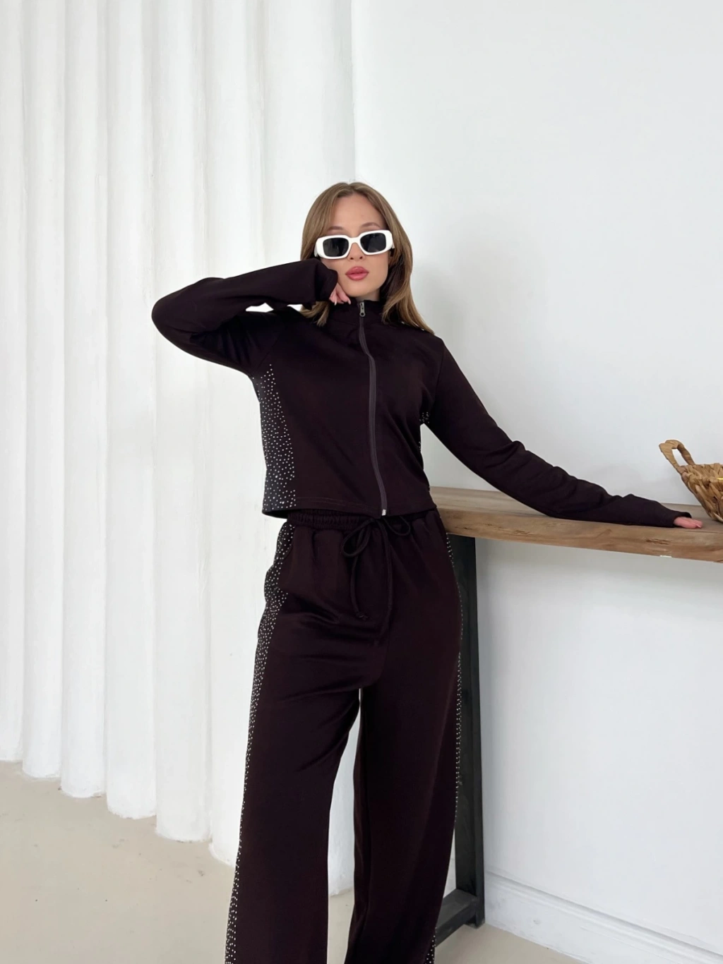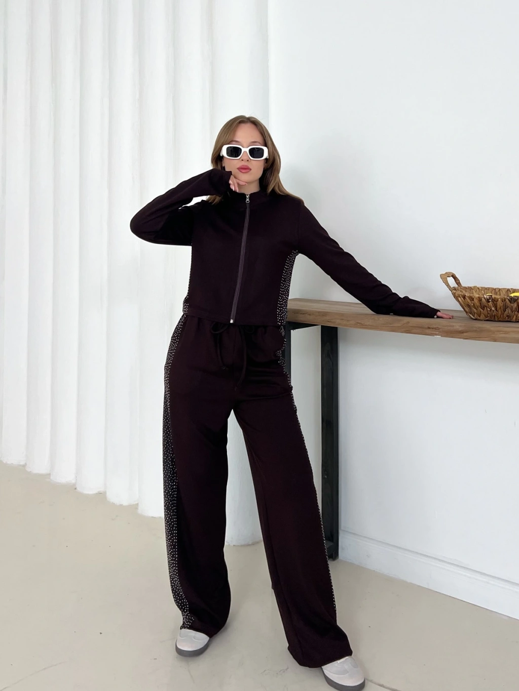 Fermuarlı Taş İşleme Detaylı Takım Acı Kahve