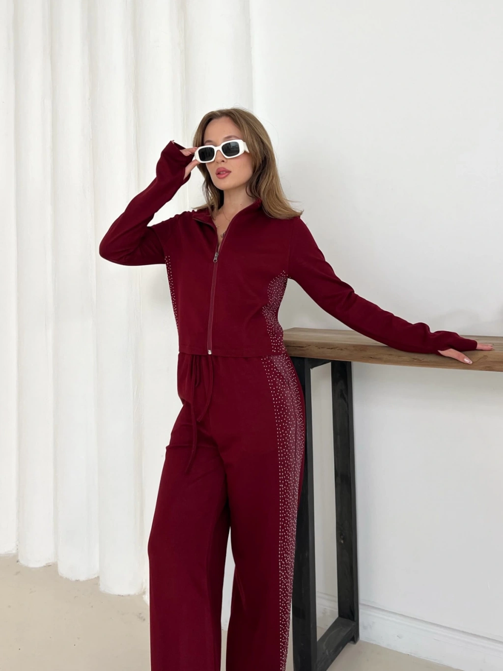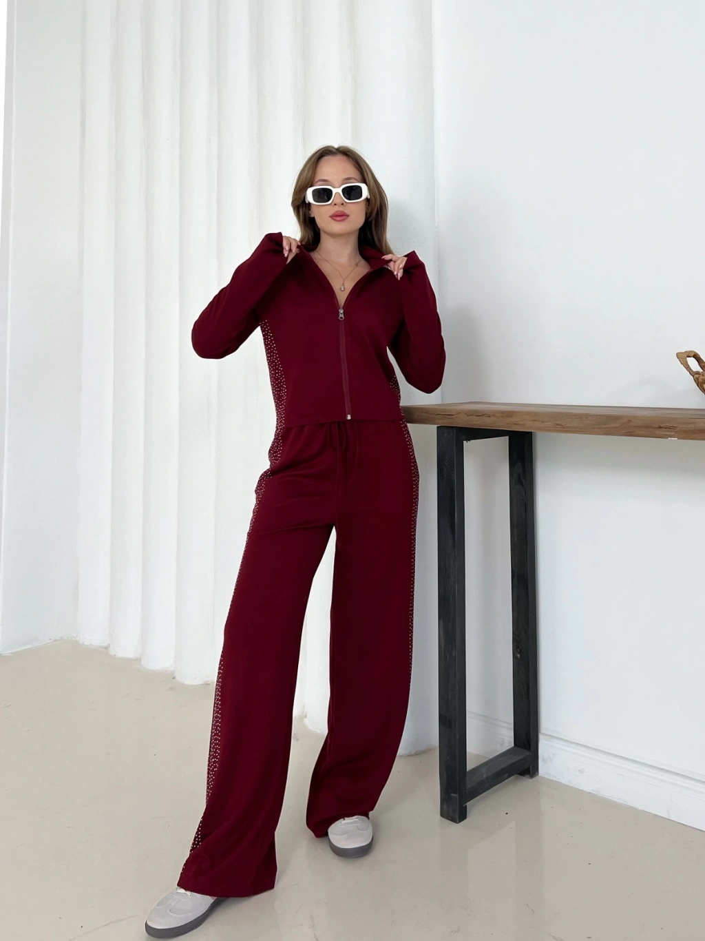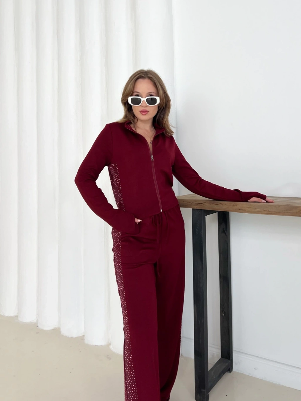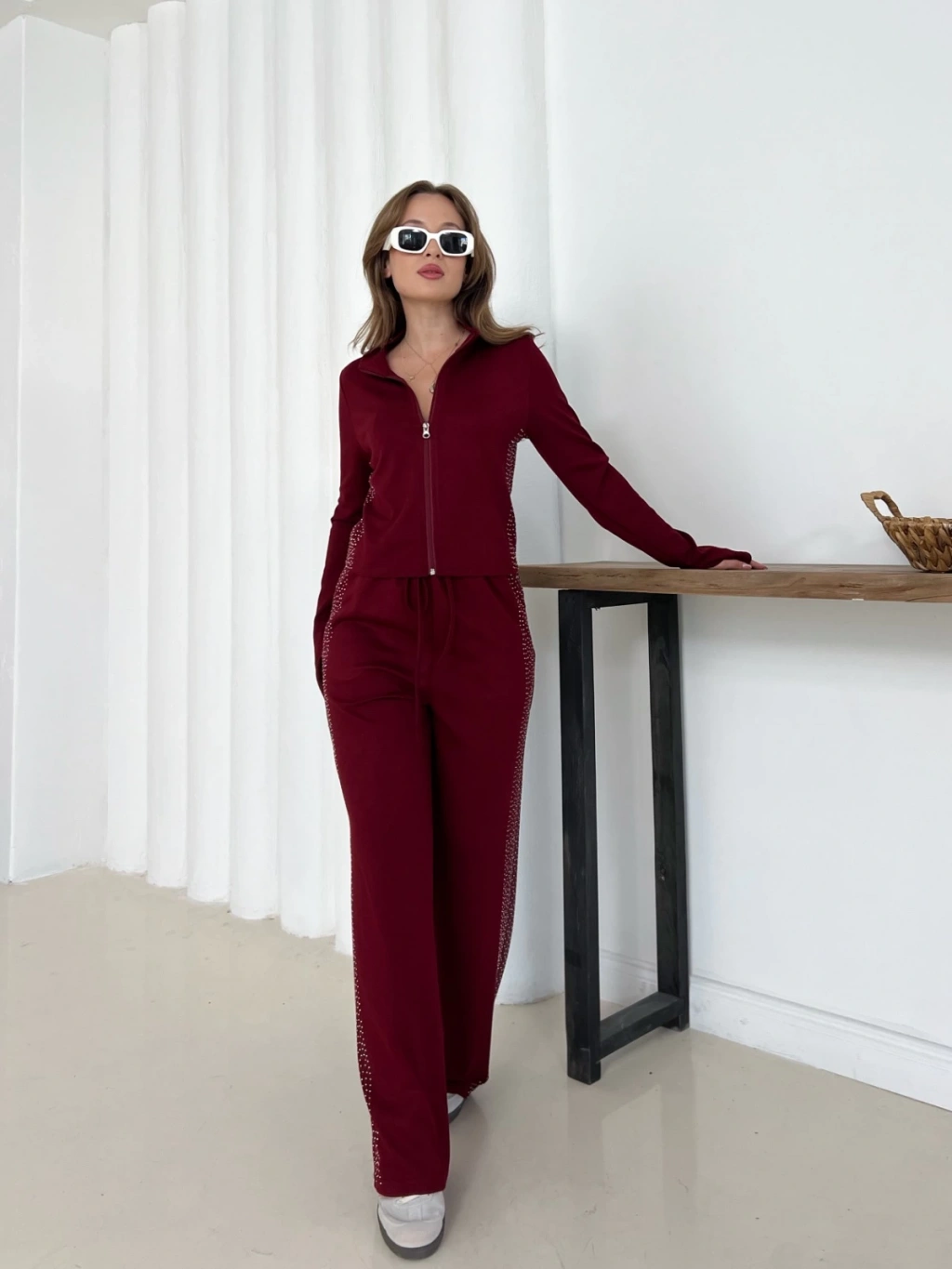 Fermuarlı Taş İşleme Detaylı Takım Bordo