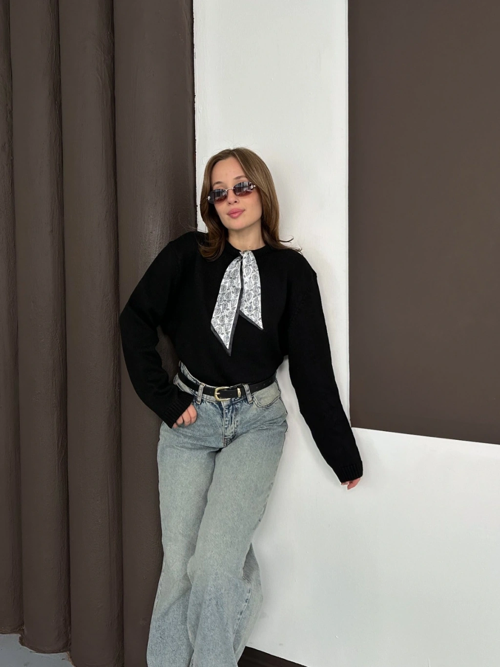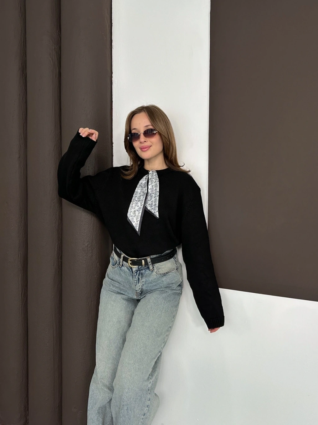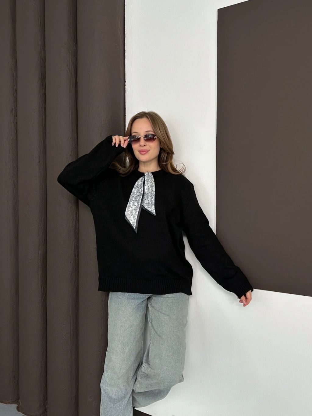 Fular Detaylı Triko Kazak Siyah