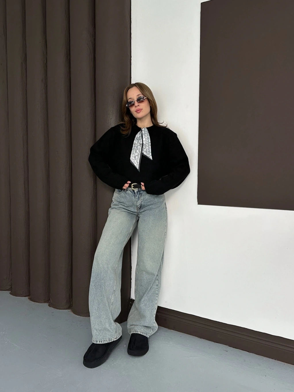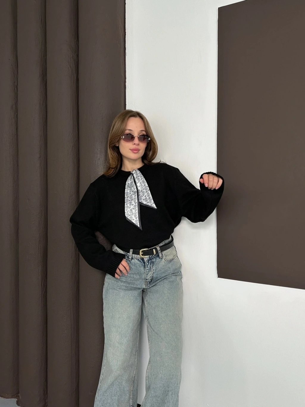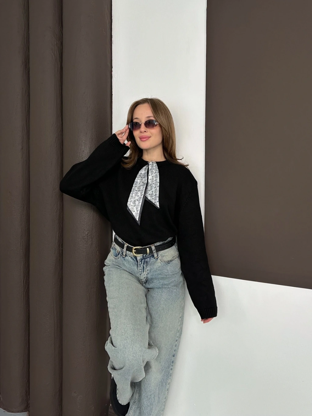 Fular Detaylı Triko Kazak Siyah