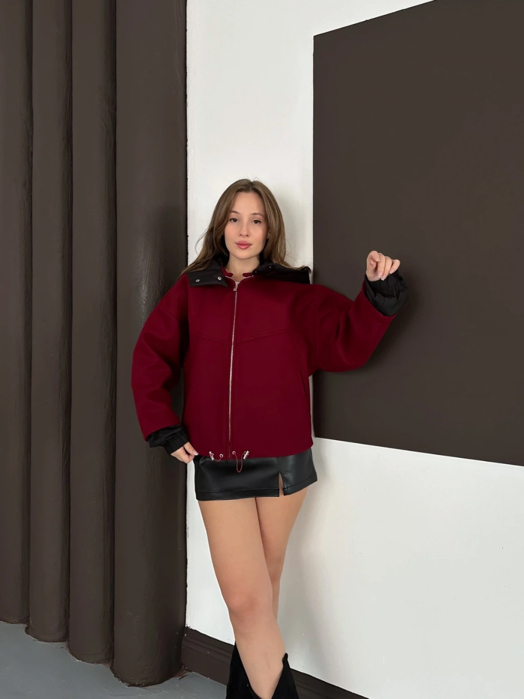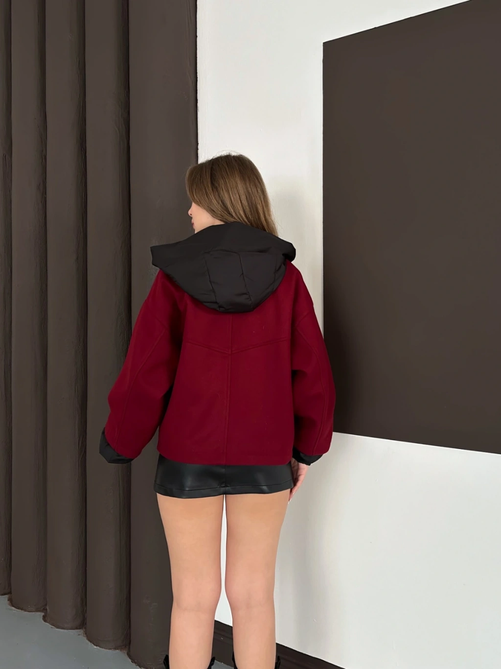 Kapüşon Detaylı Kaşe Ceket Bordo