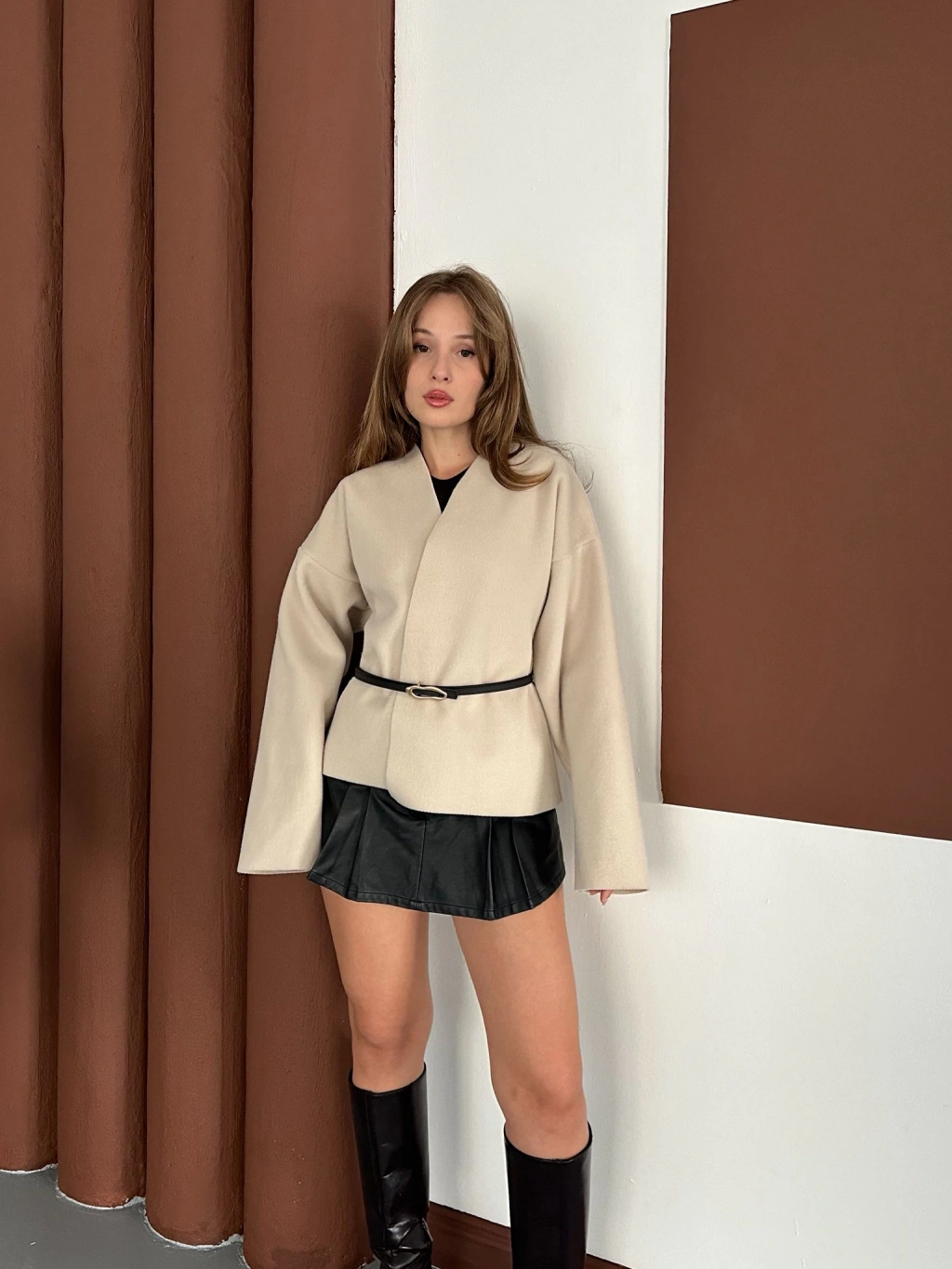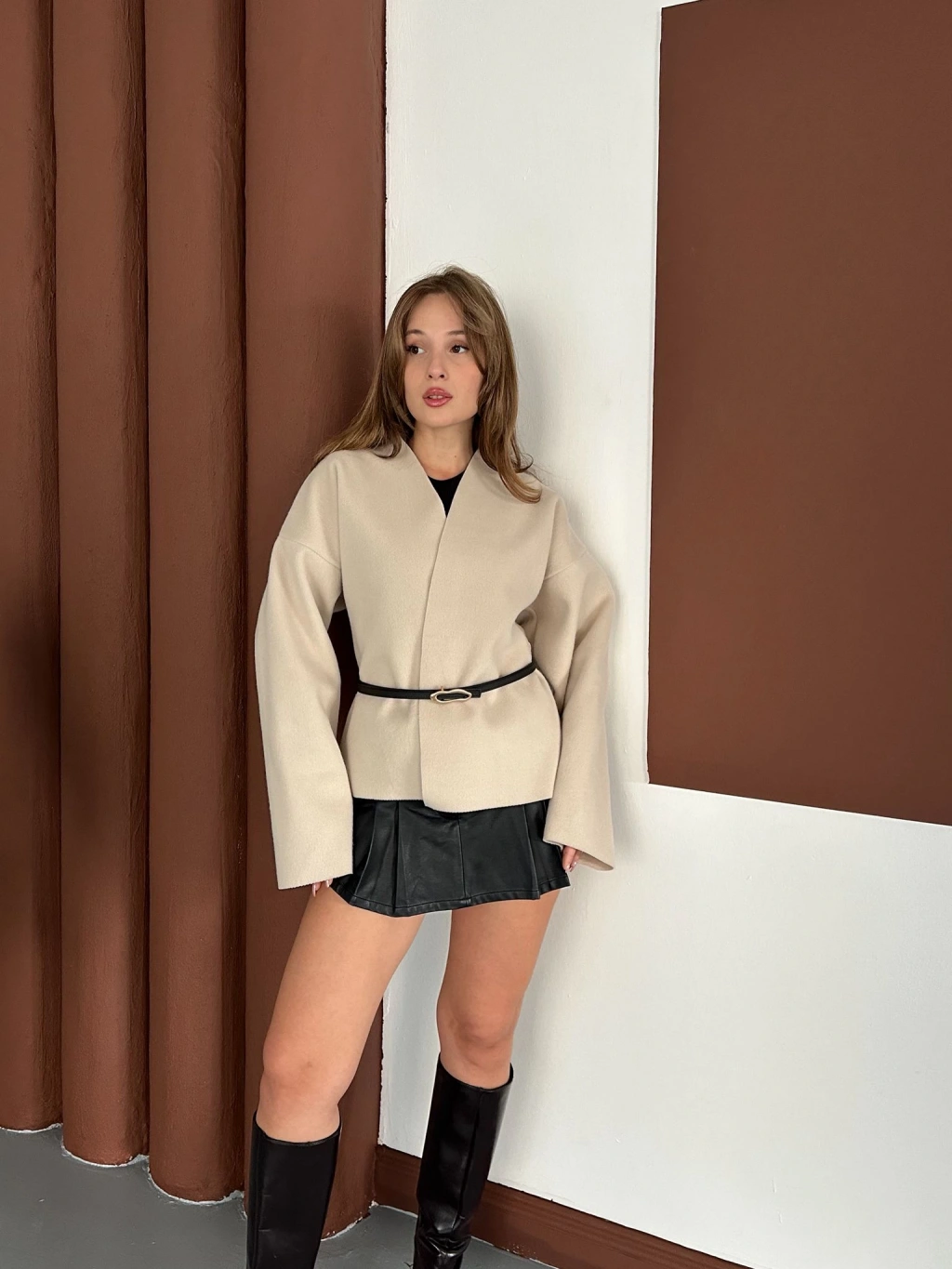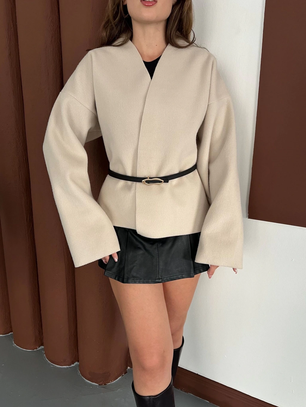 Kemer Detaylı Kaşe Kısa Ceket Bej