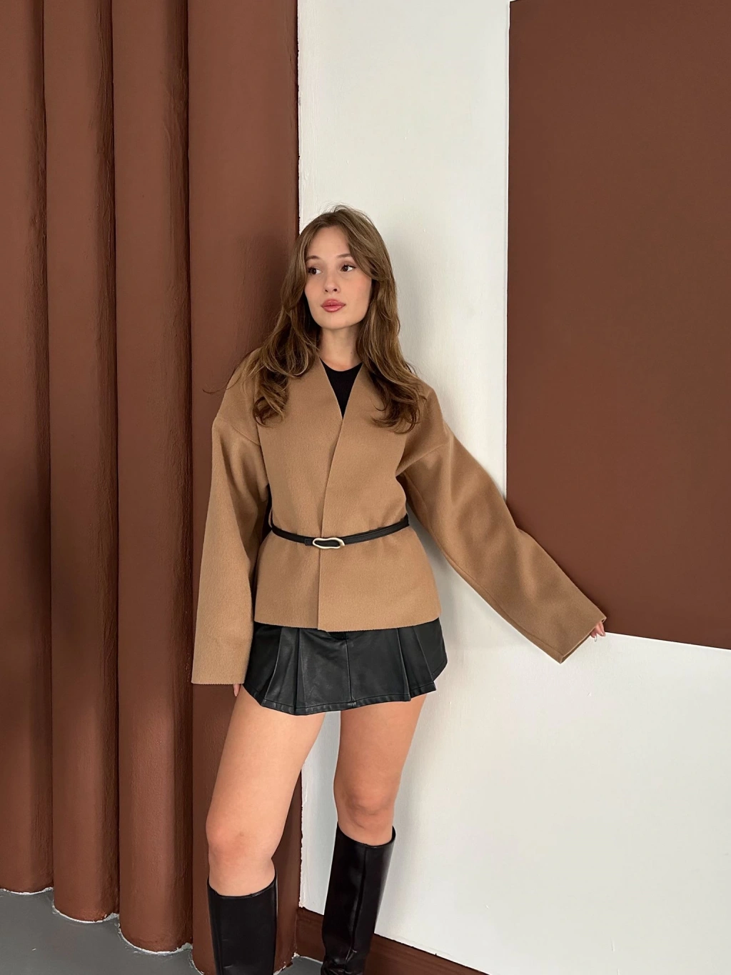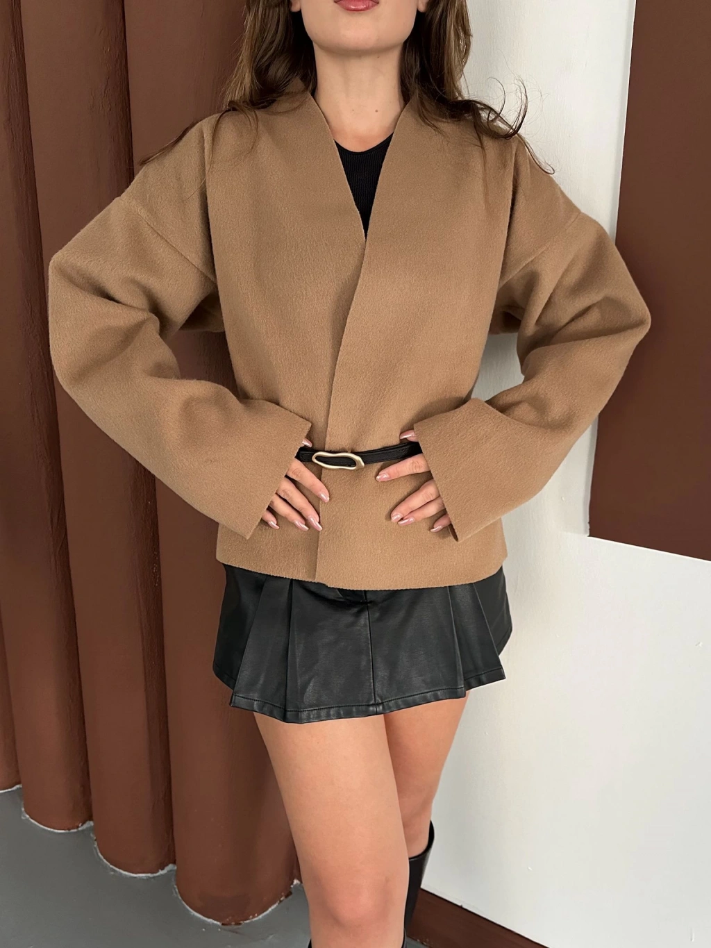 Kemer Detaylı Kaşe Kısa Ceket Taba