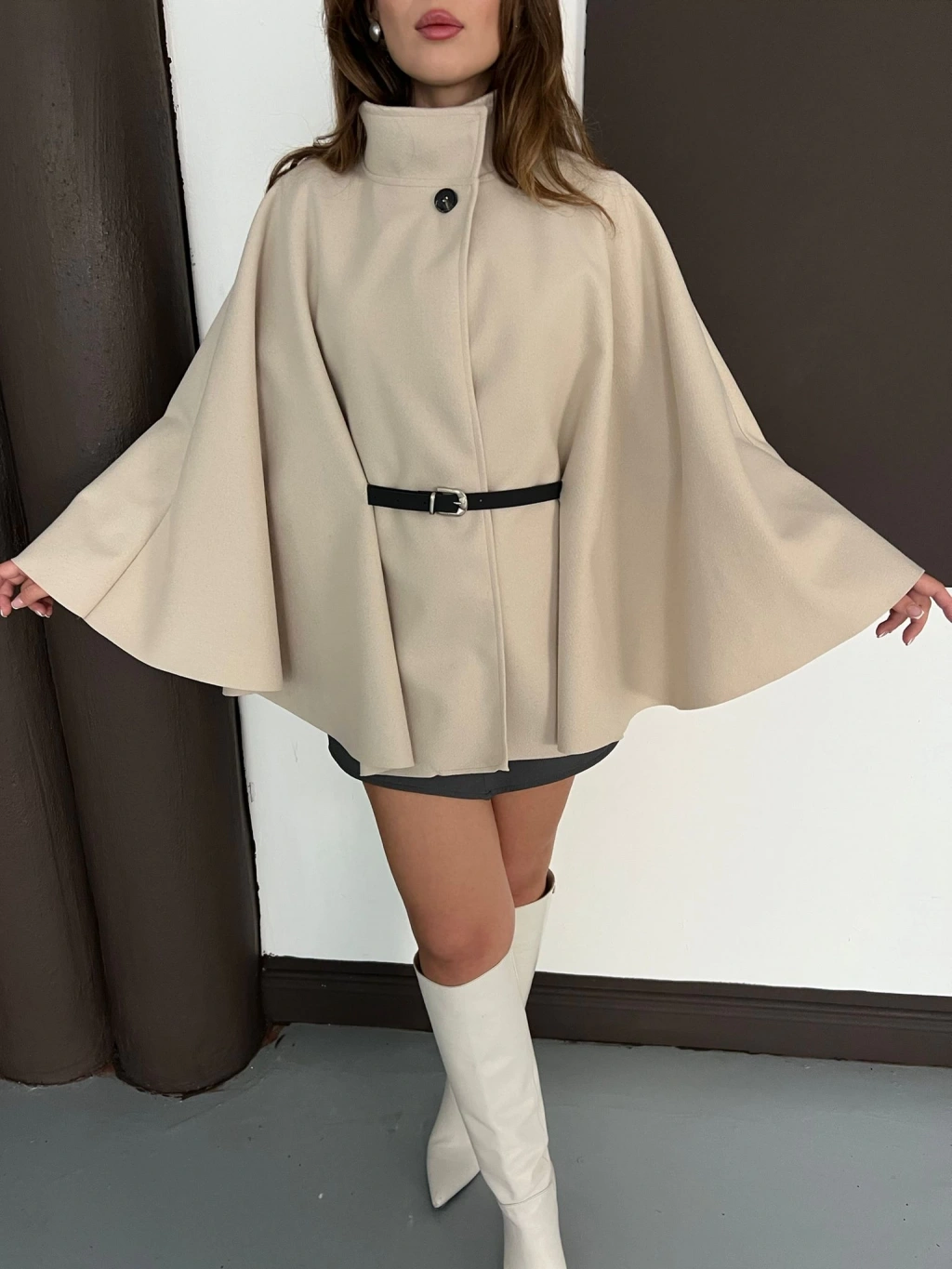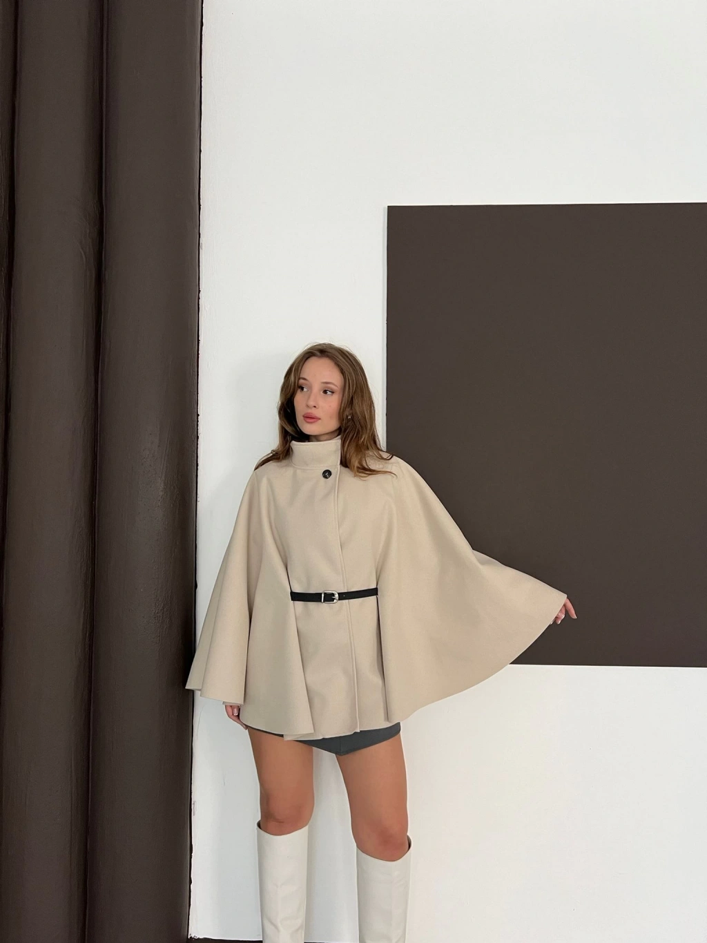 Kemer Detaylı Yarasa Kol Panço Pudra