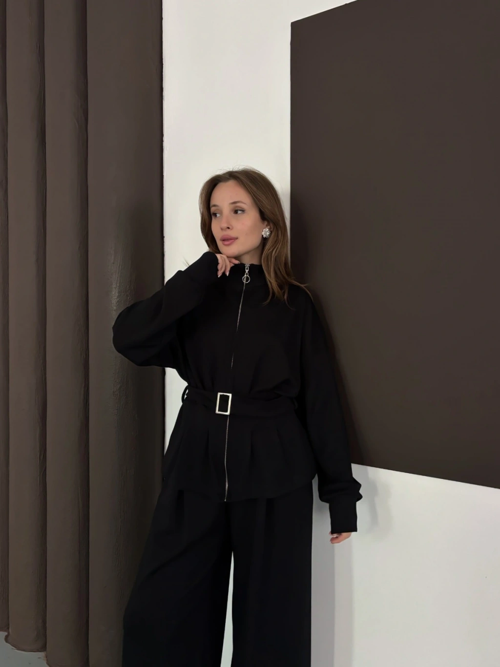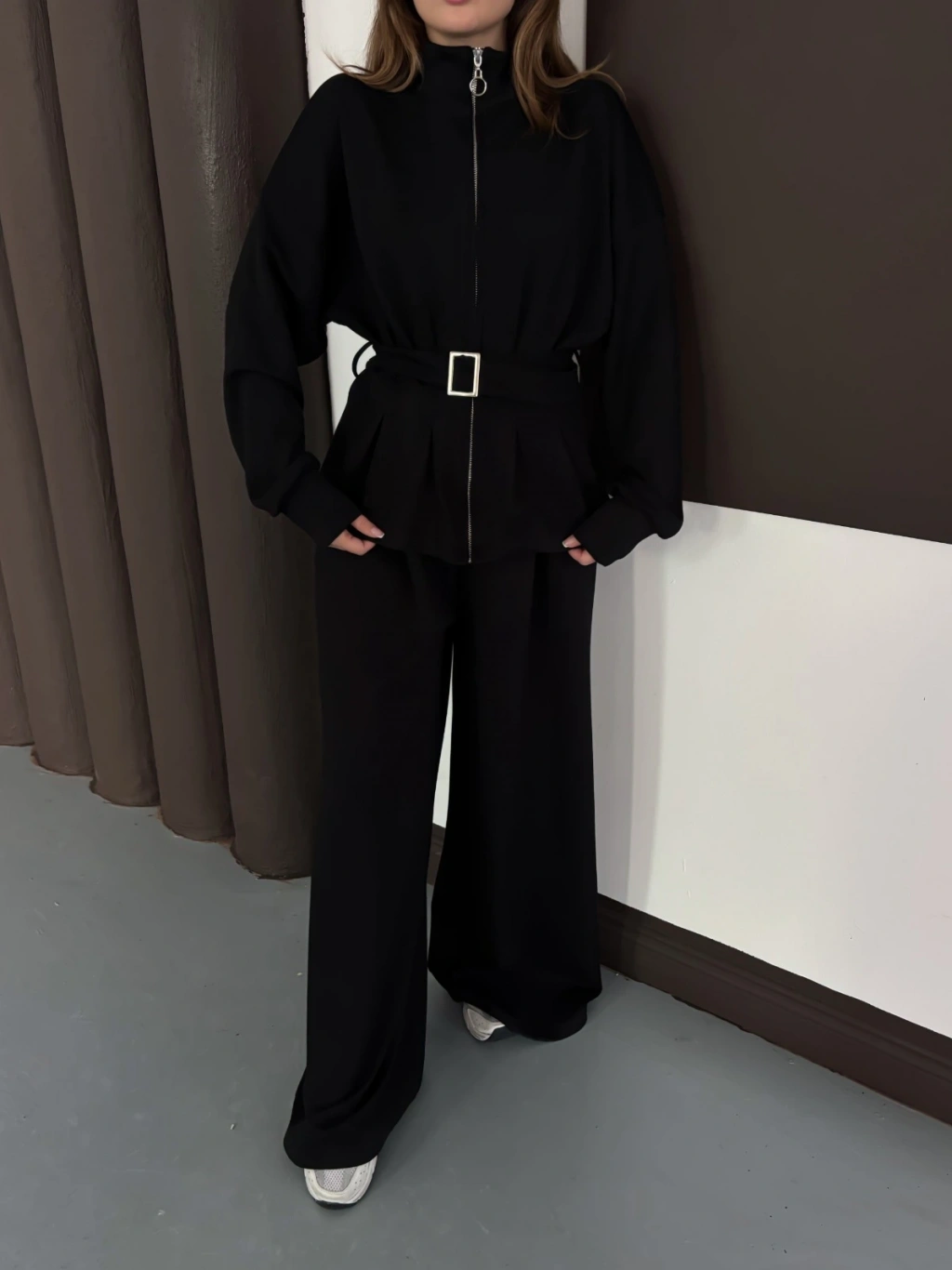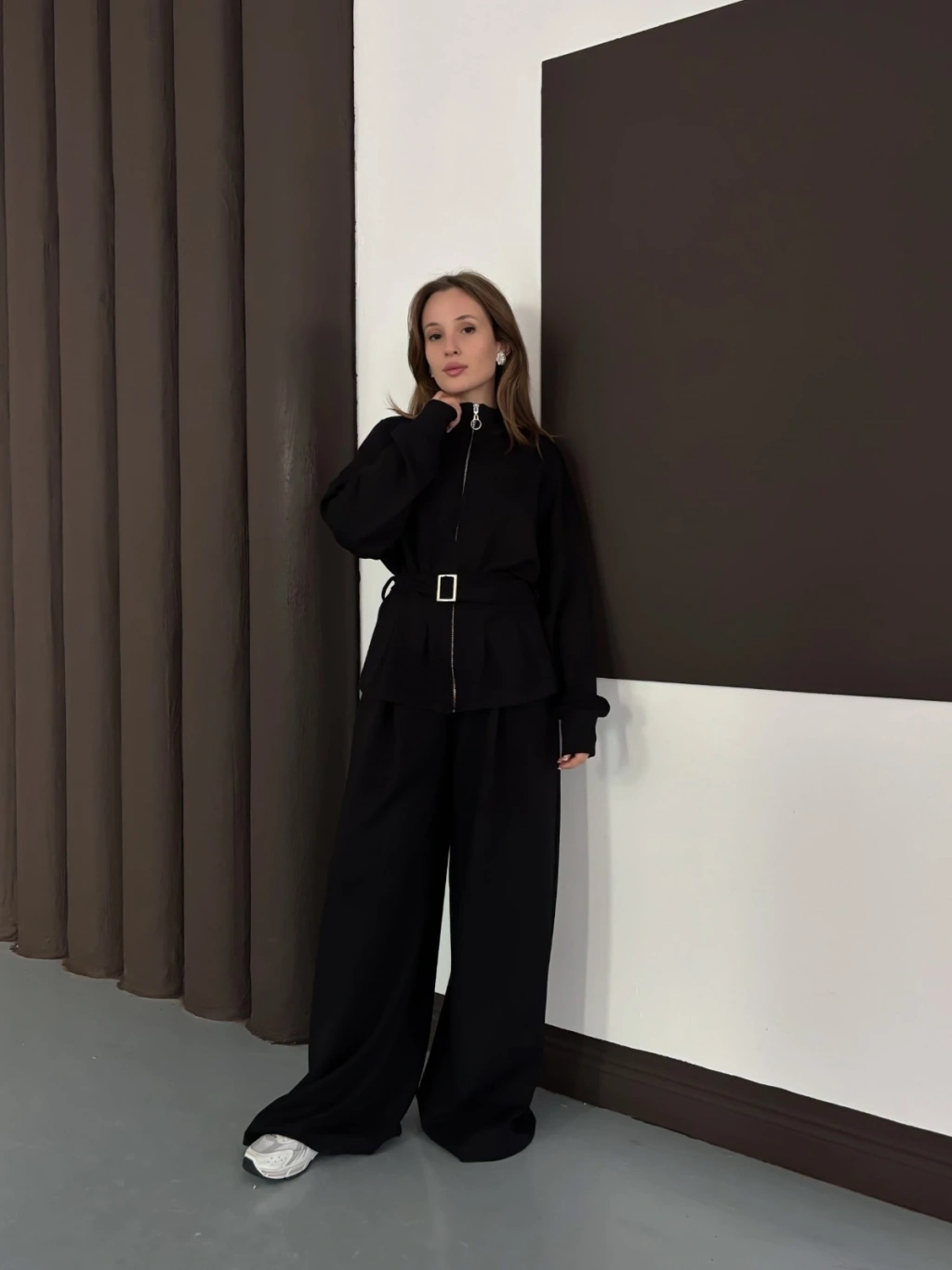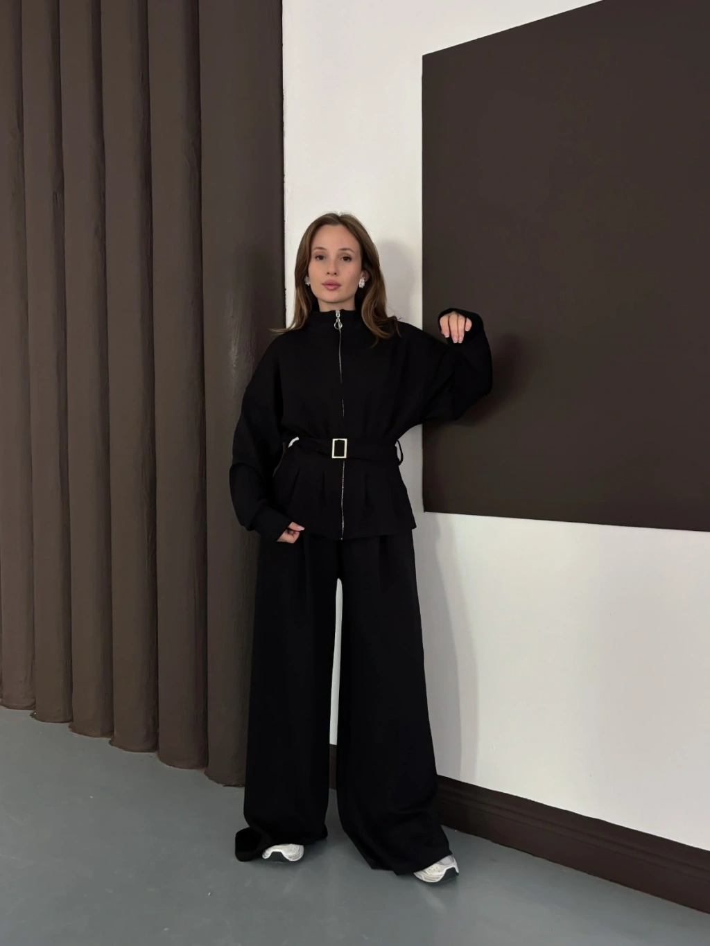 Kemer Detaylı Pantolonlu İkili Takım Siyah