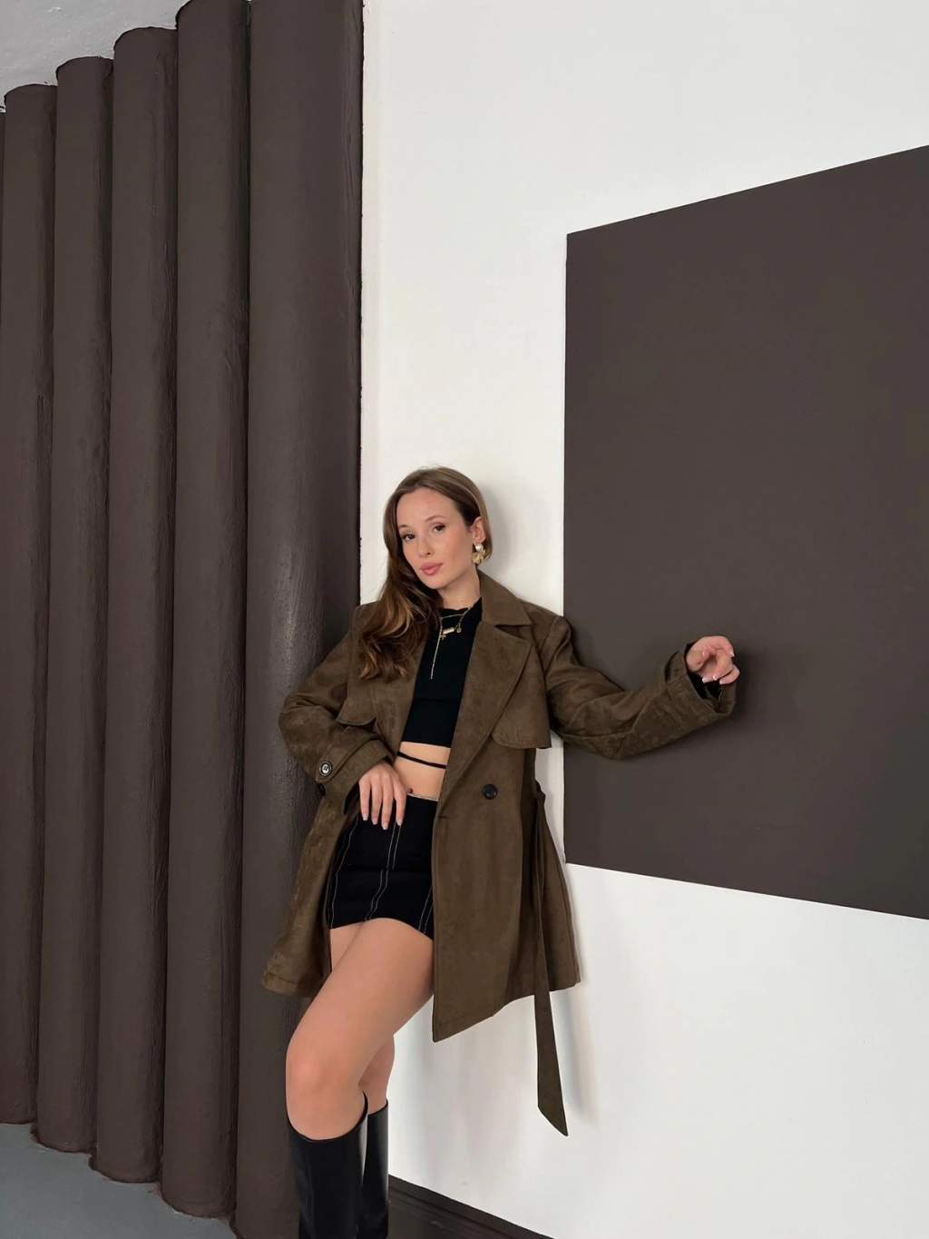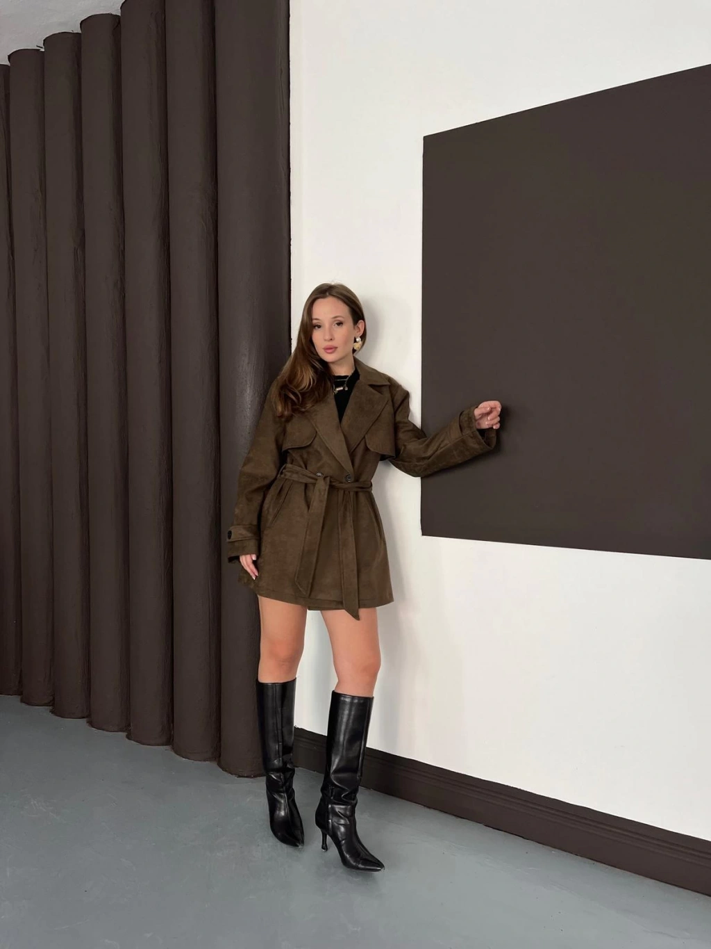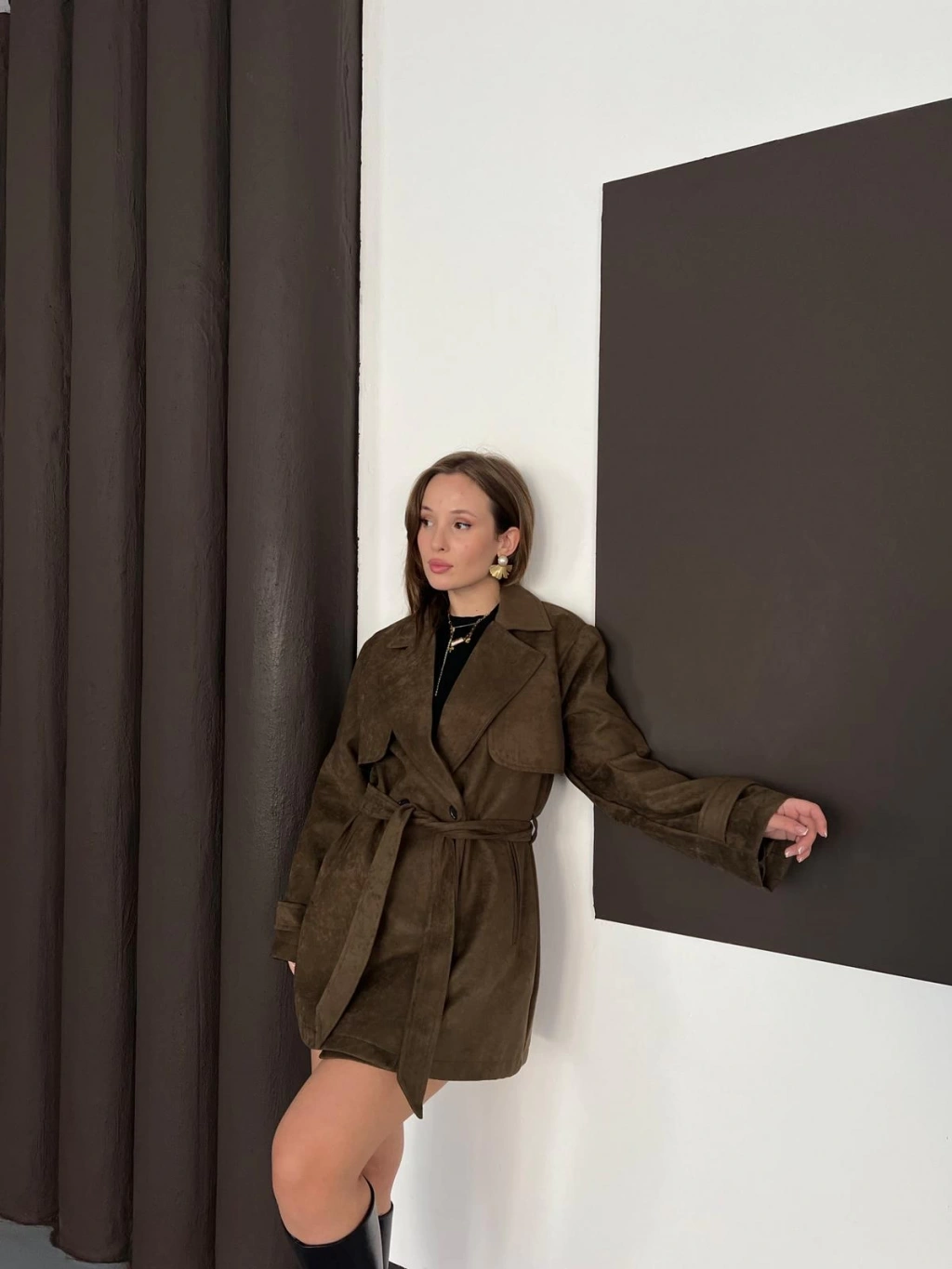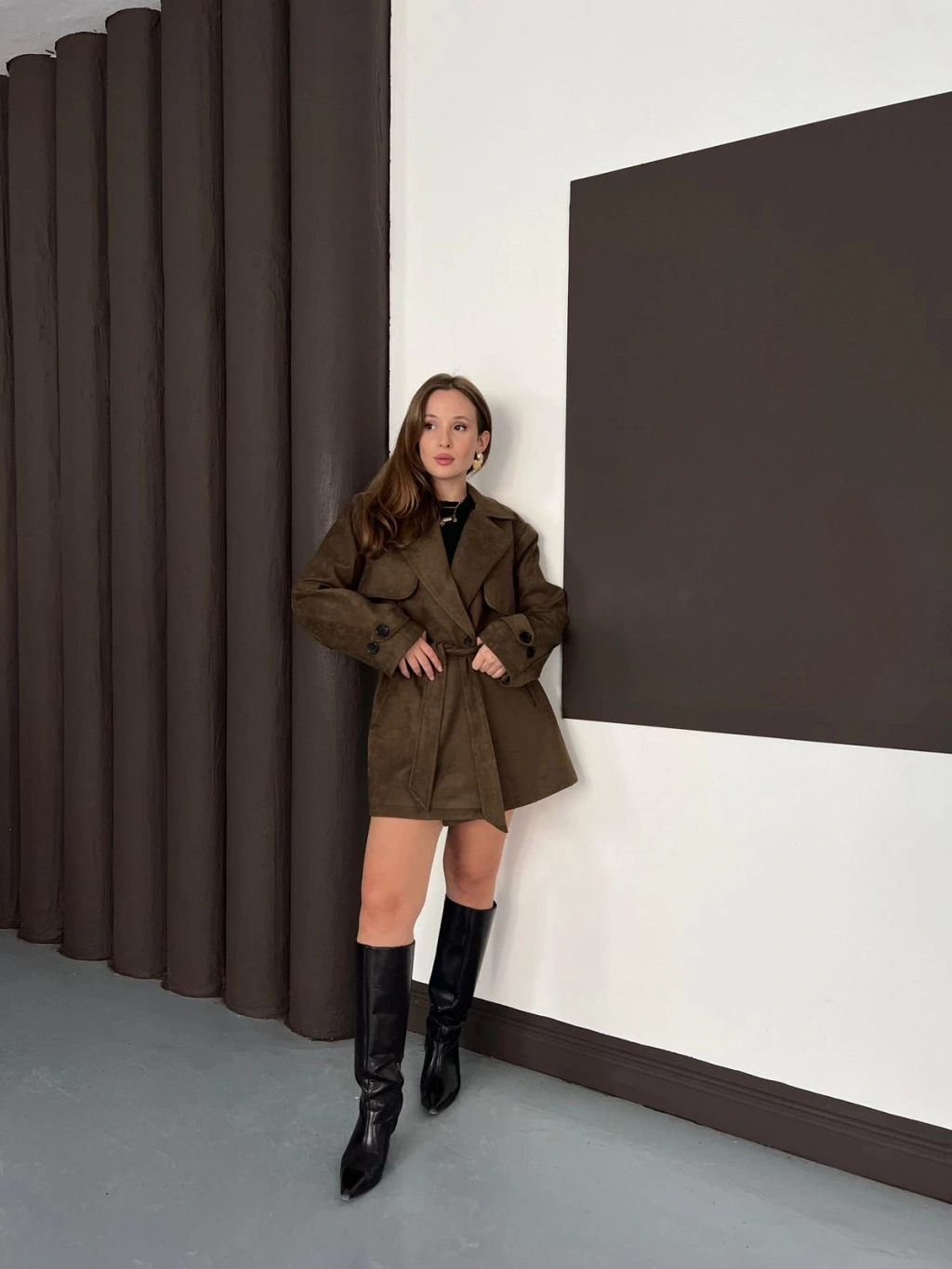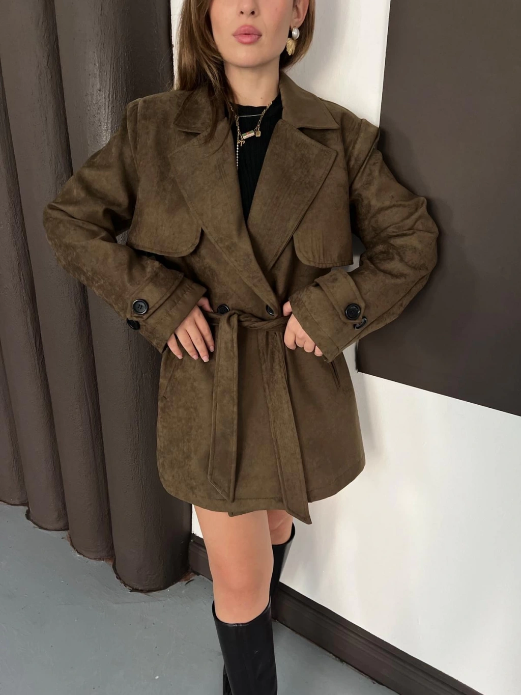 Kruvaze Yaka Cepli Kısa Kaşe Ceket Kahve