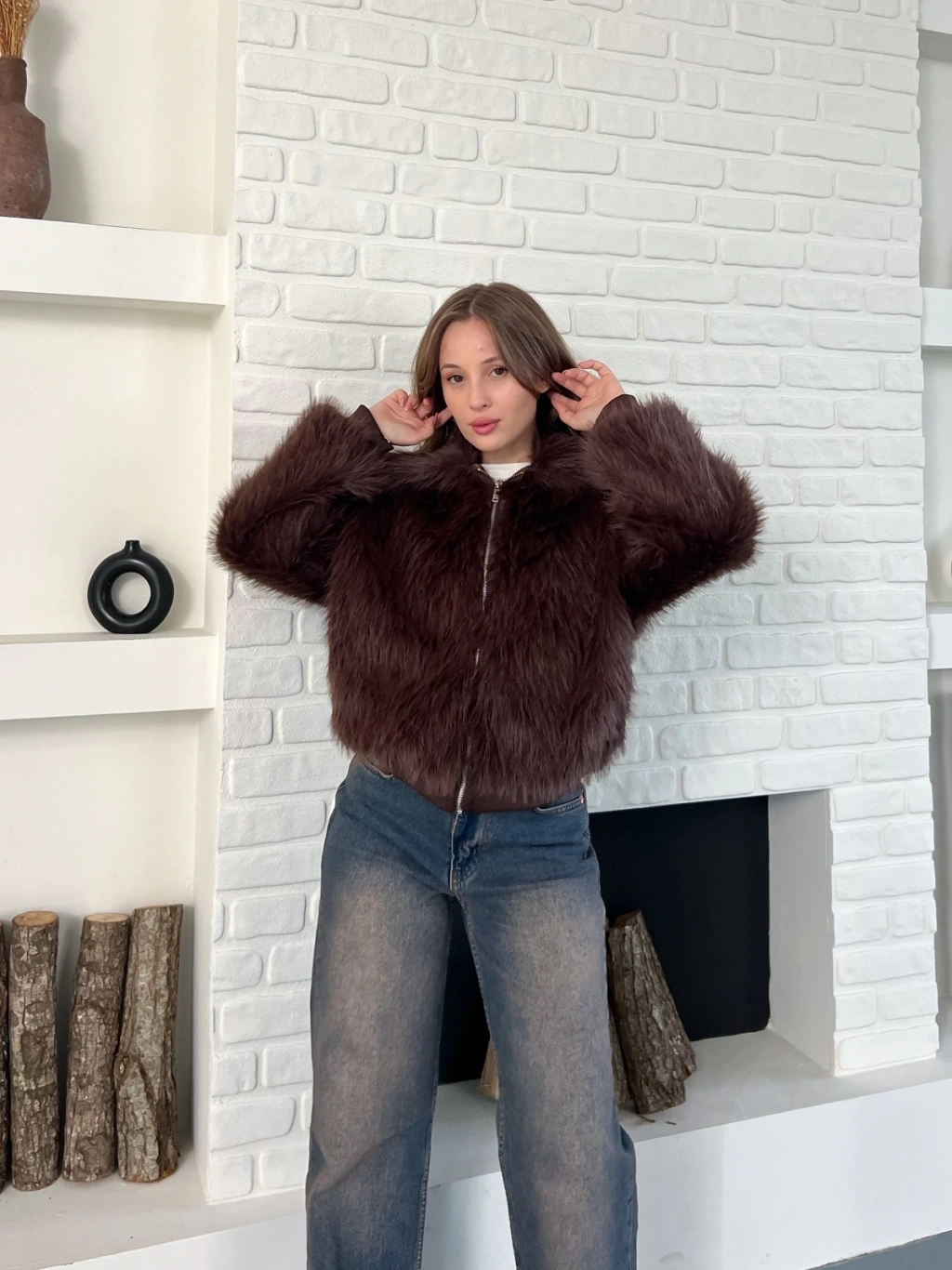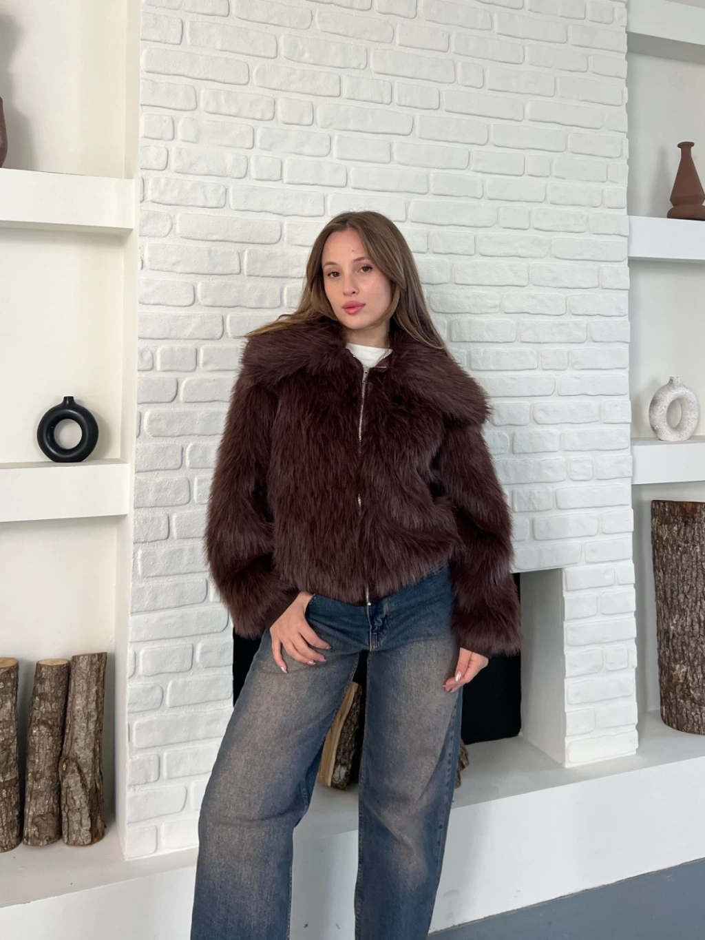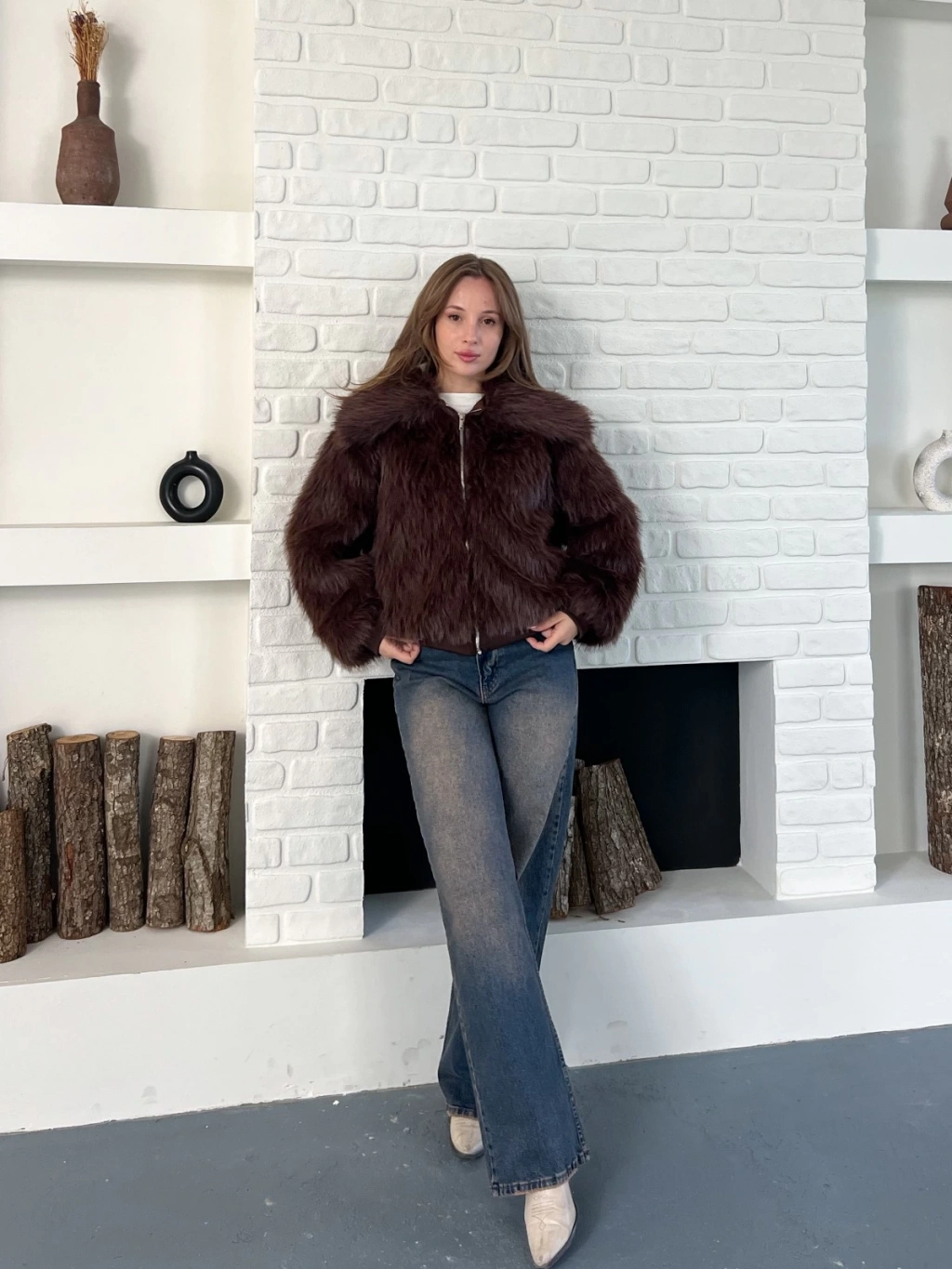 Kol Ribanalı Fermuarlı Kürk Kahve