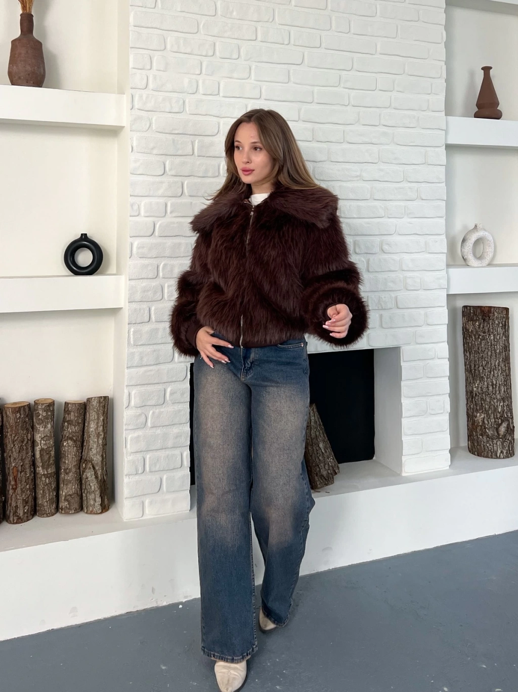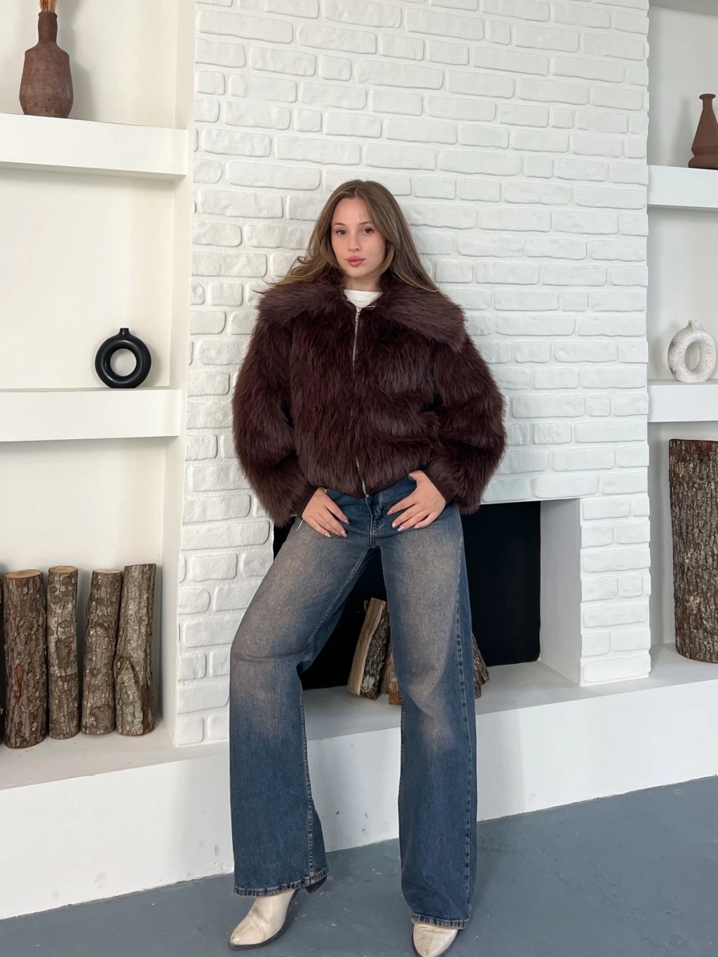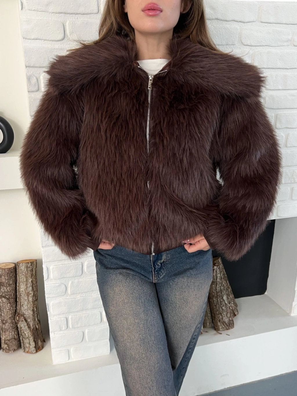 Kol Ribanalı Fermuarlı Kürk Kahve