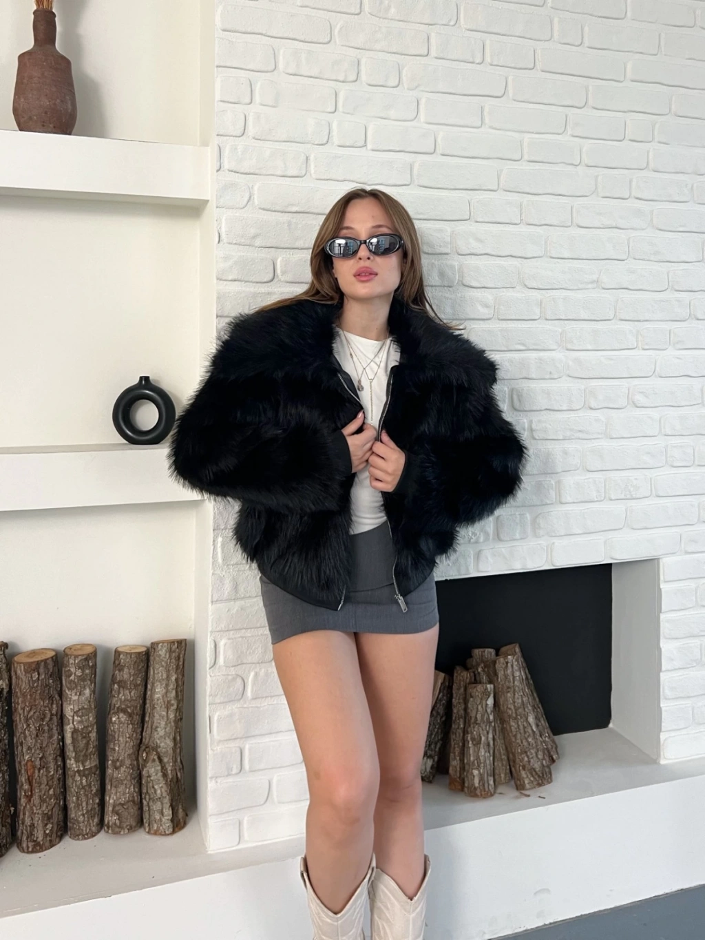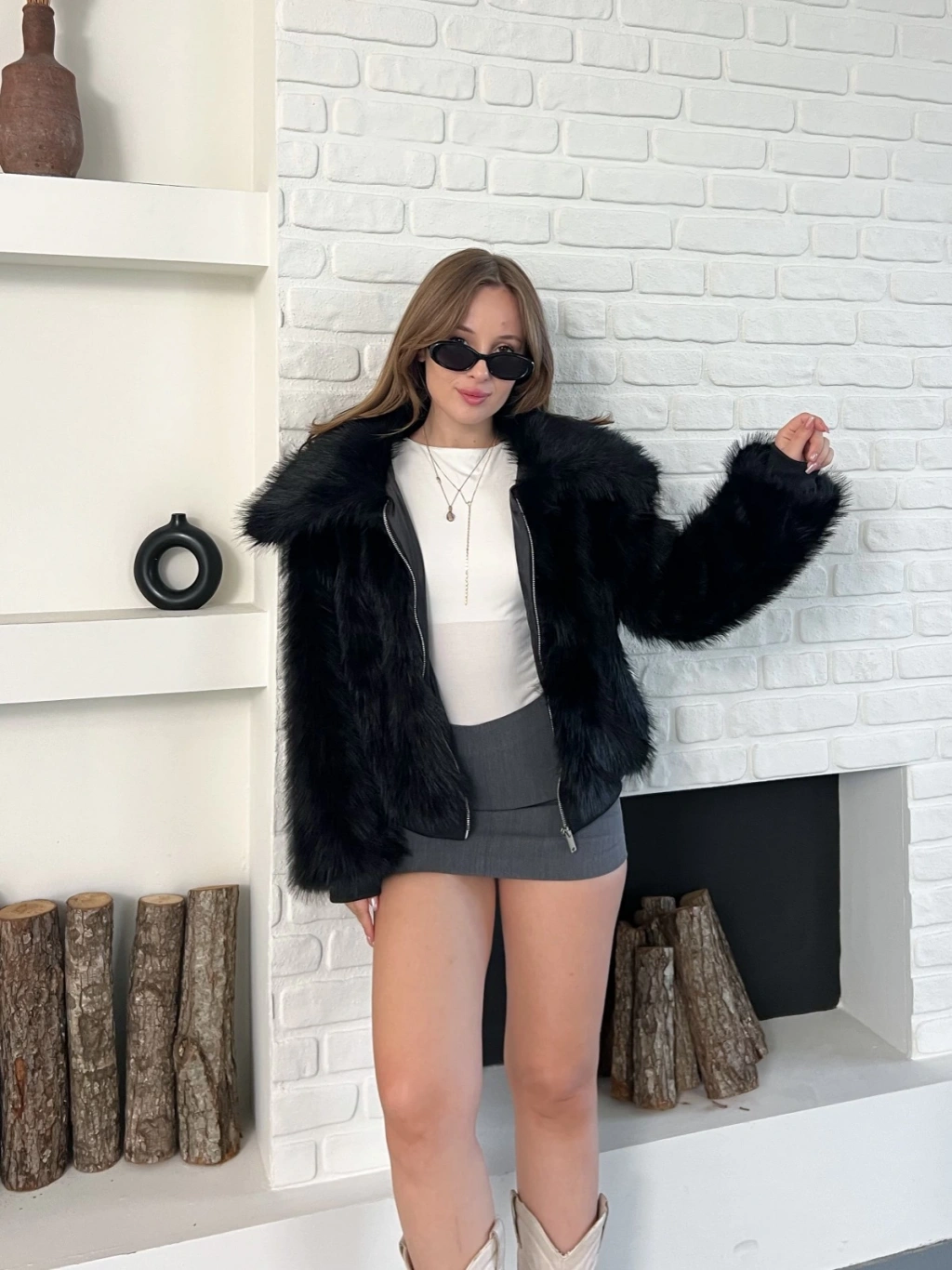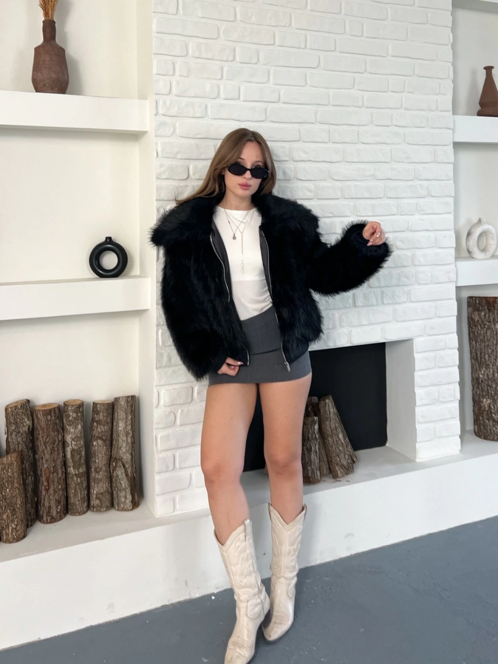 Kol Ribanalı Fermuarlı Kürk Siyah