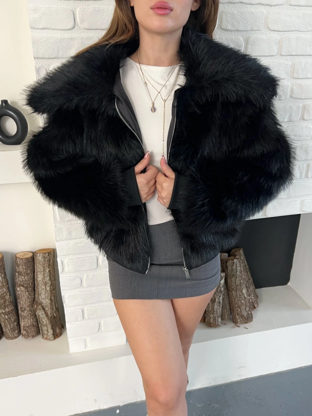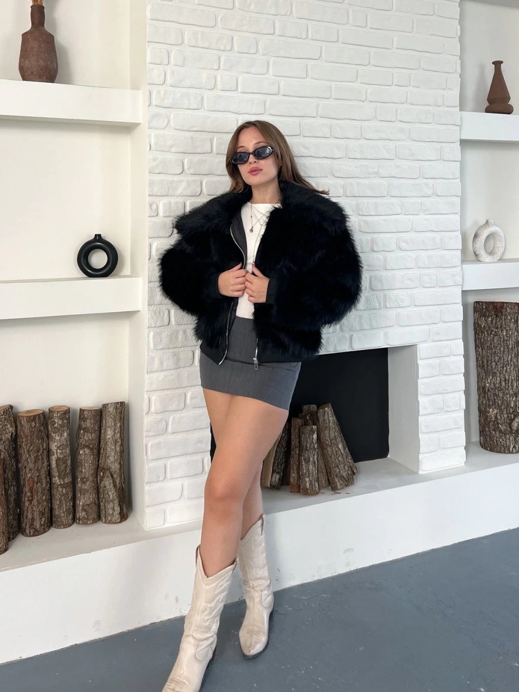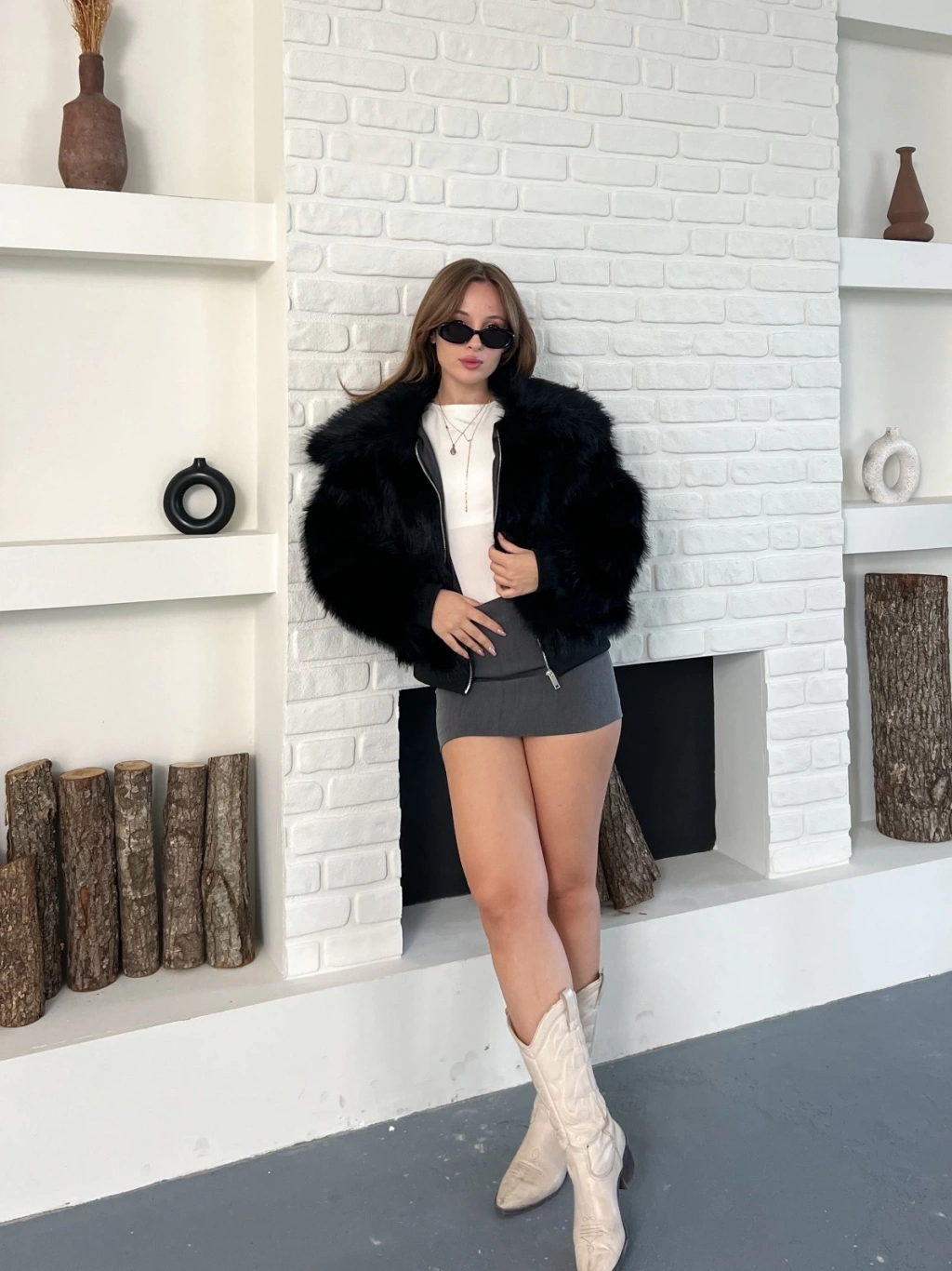 Kol Ribanalı Fermuarlı Kürk Siyah