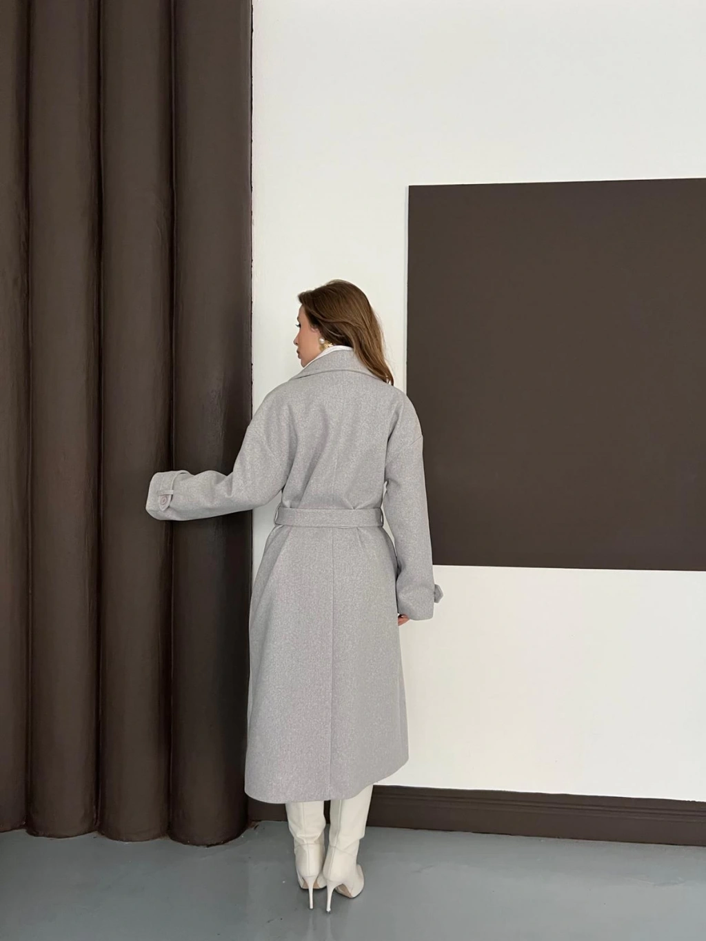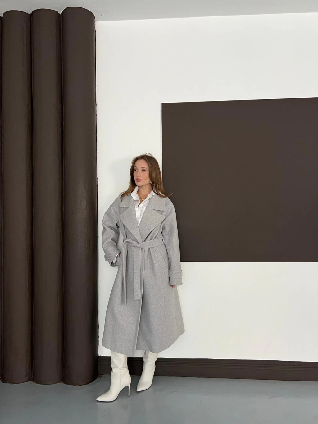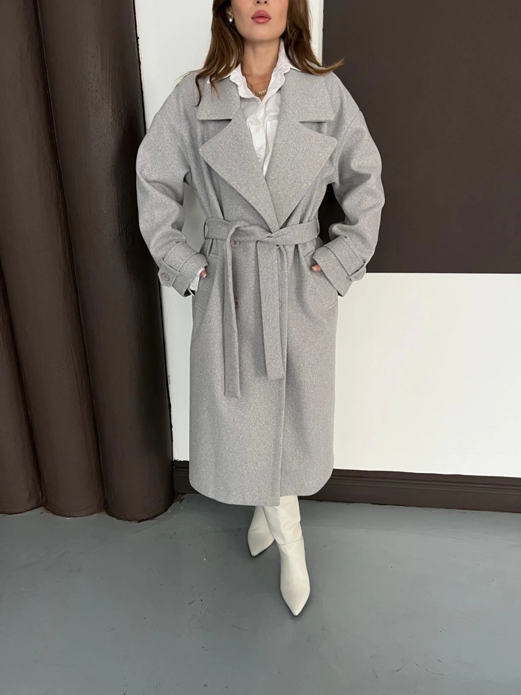 Kuşaklı Kol Manşetli Kaşe Kaban Gri