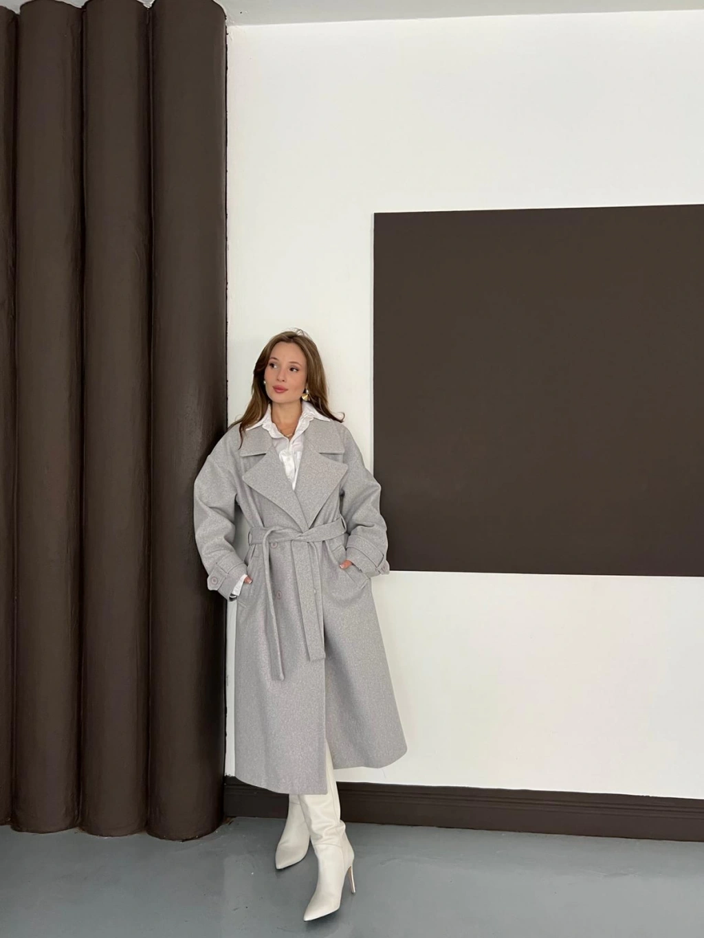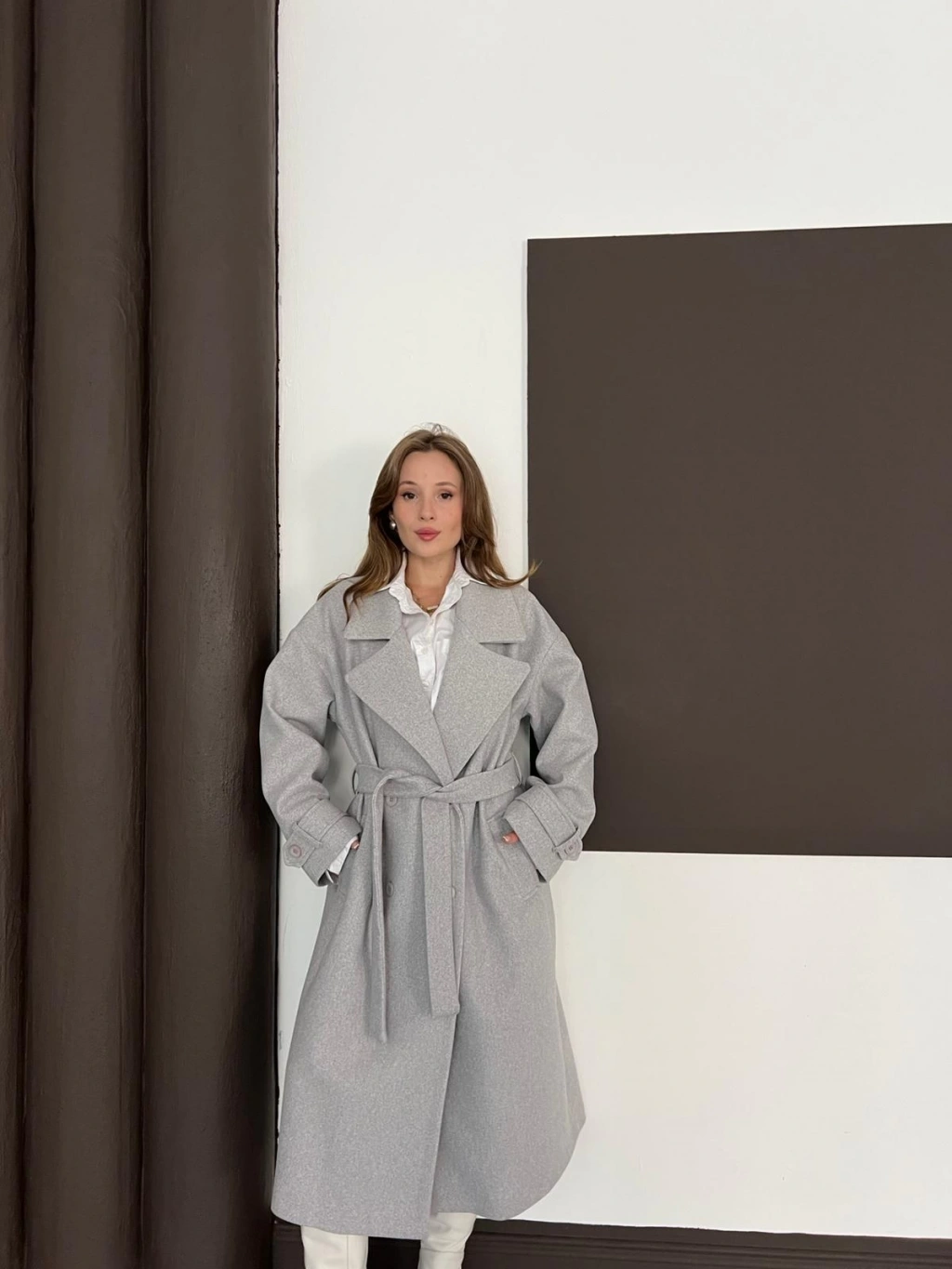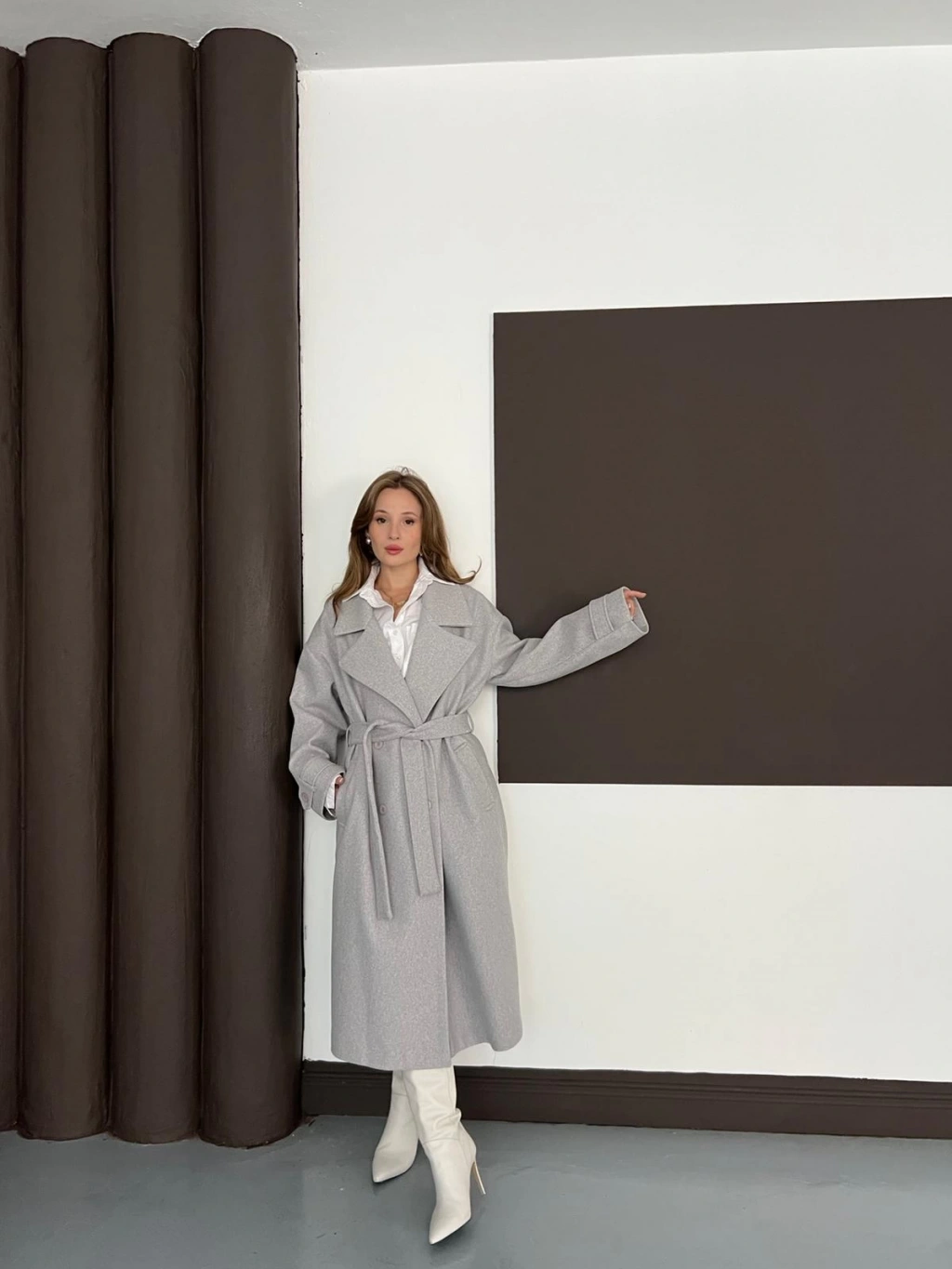 Kuşaklı Kol Manşetli Kaşe Kaban Gri