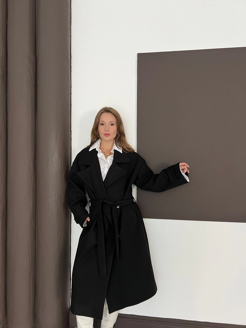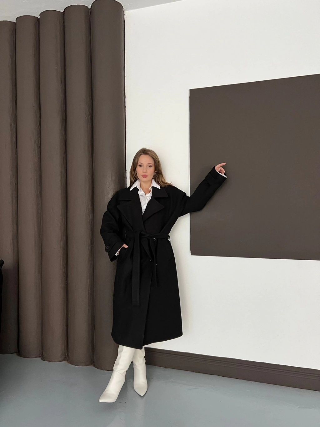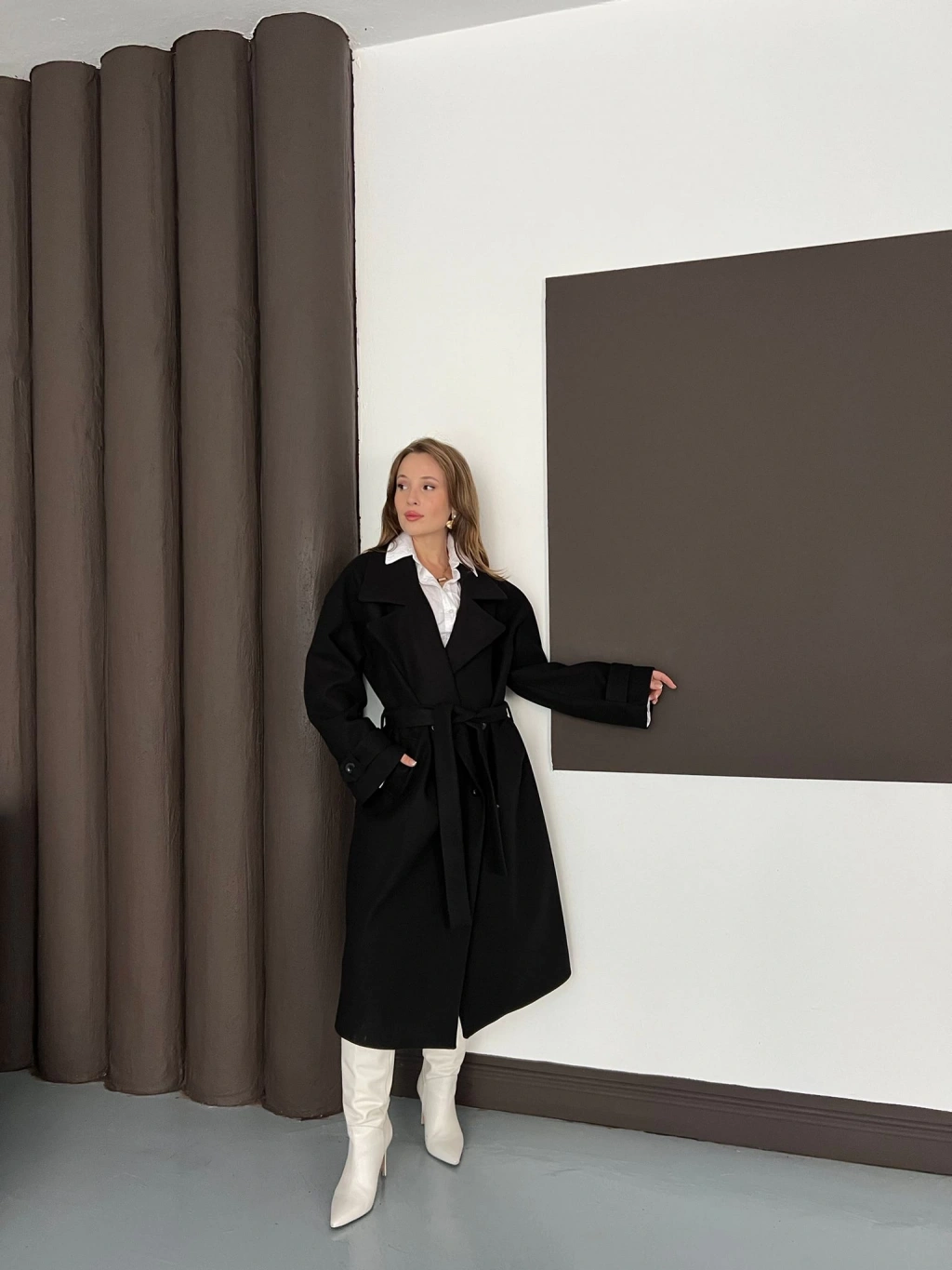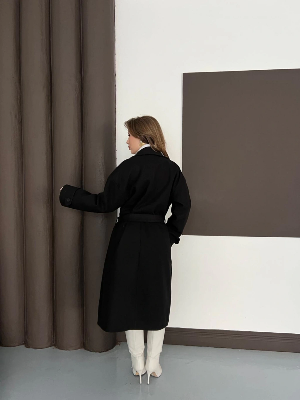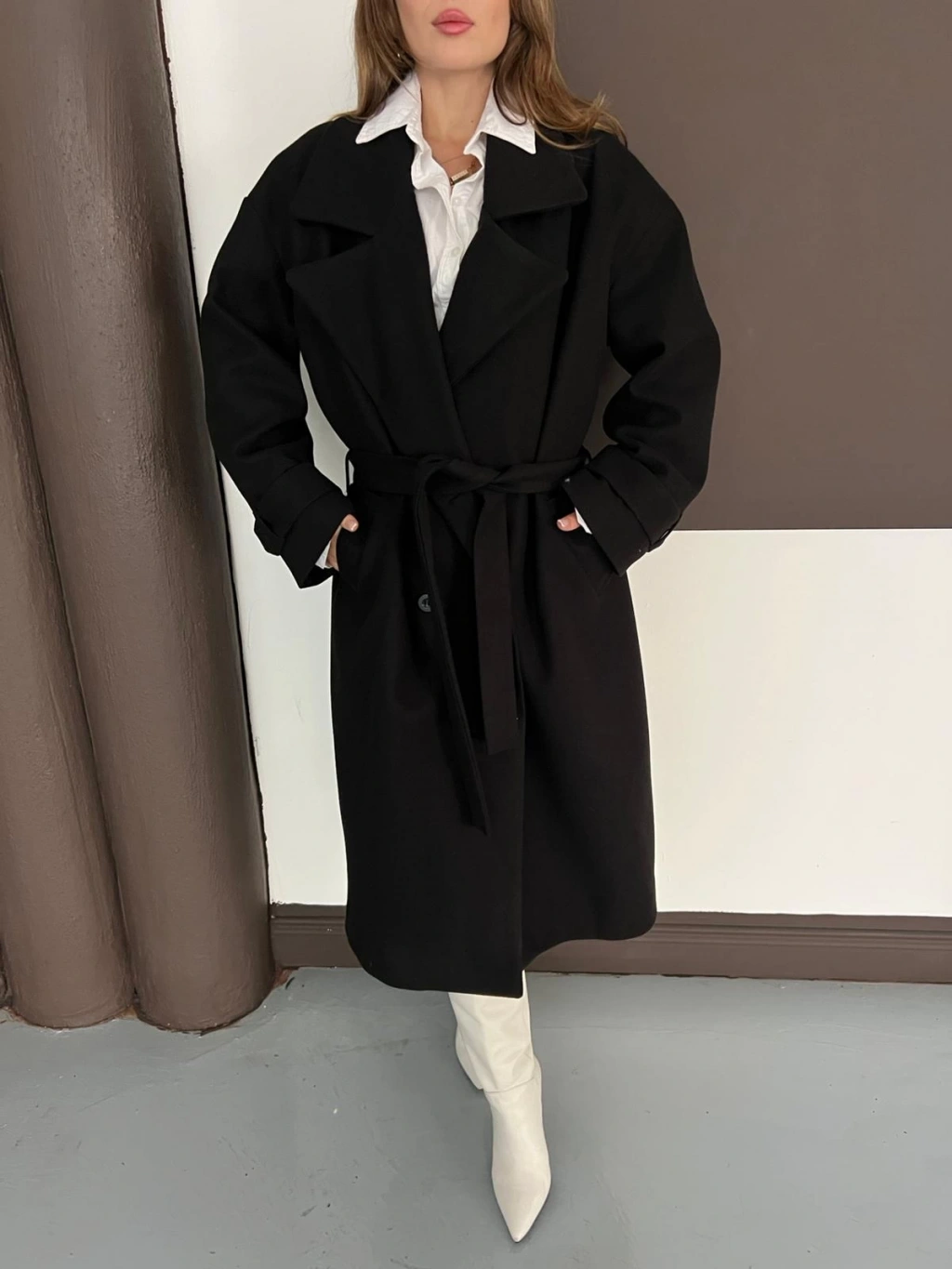 Kuşaklı Kol Manşetli Kaşe Kaban Siyah