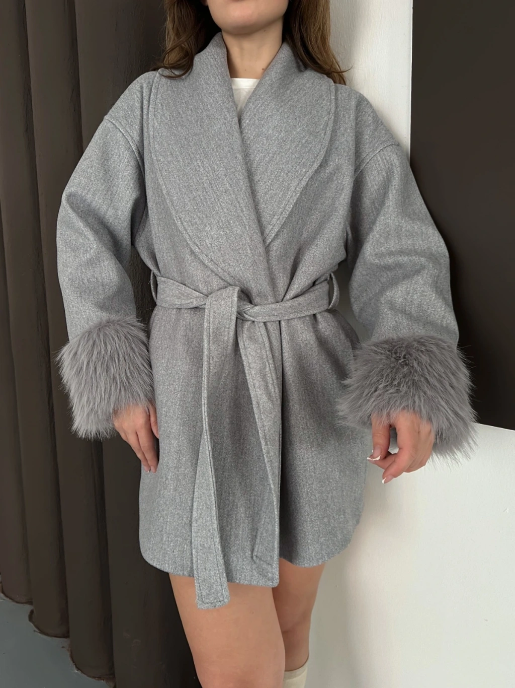Kuşaklı Peluş Detay Kaşe Kaban Gri