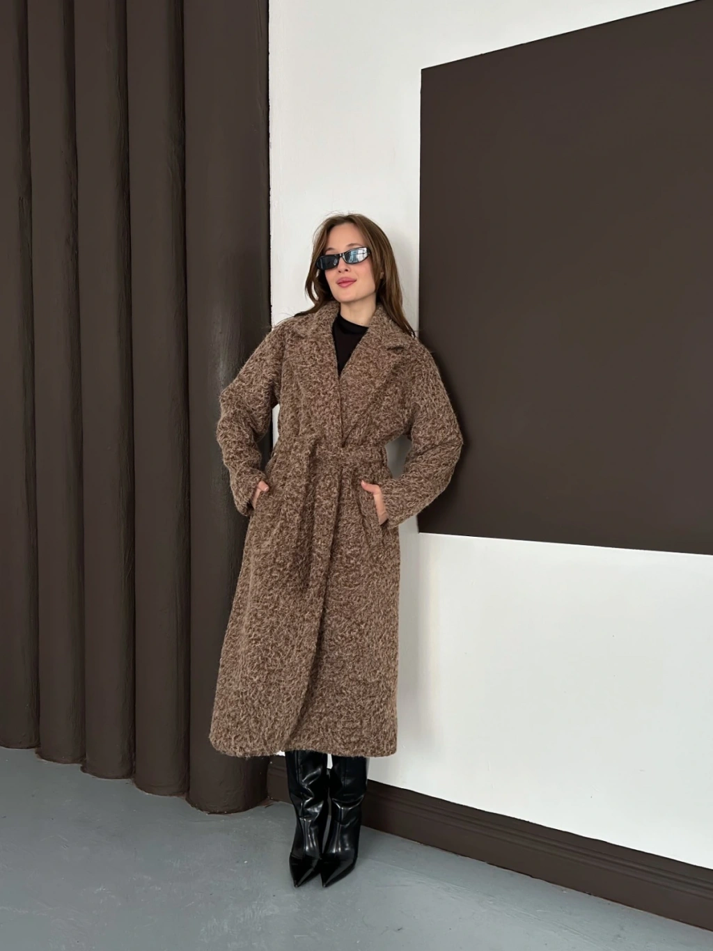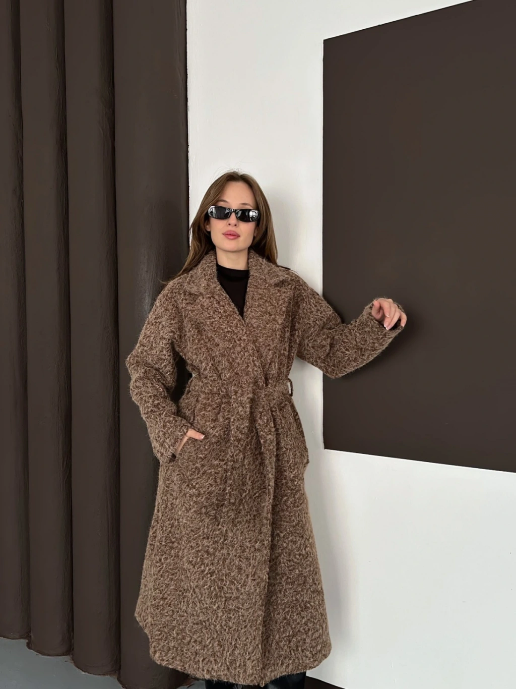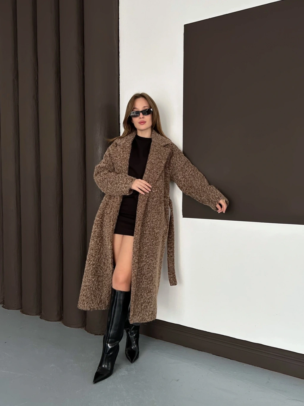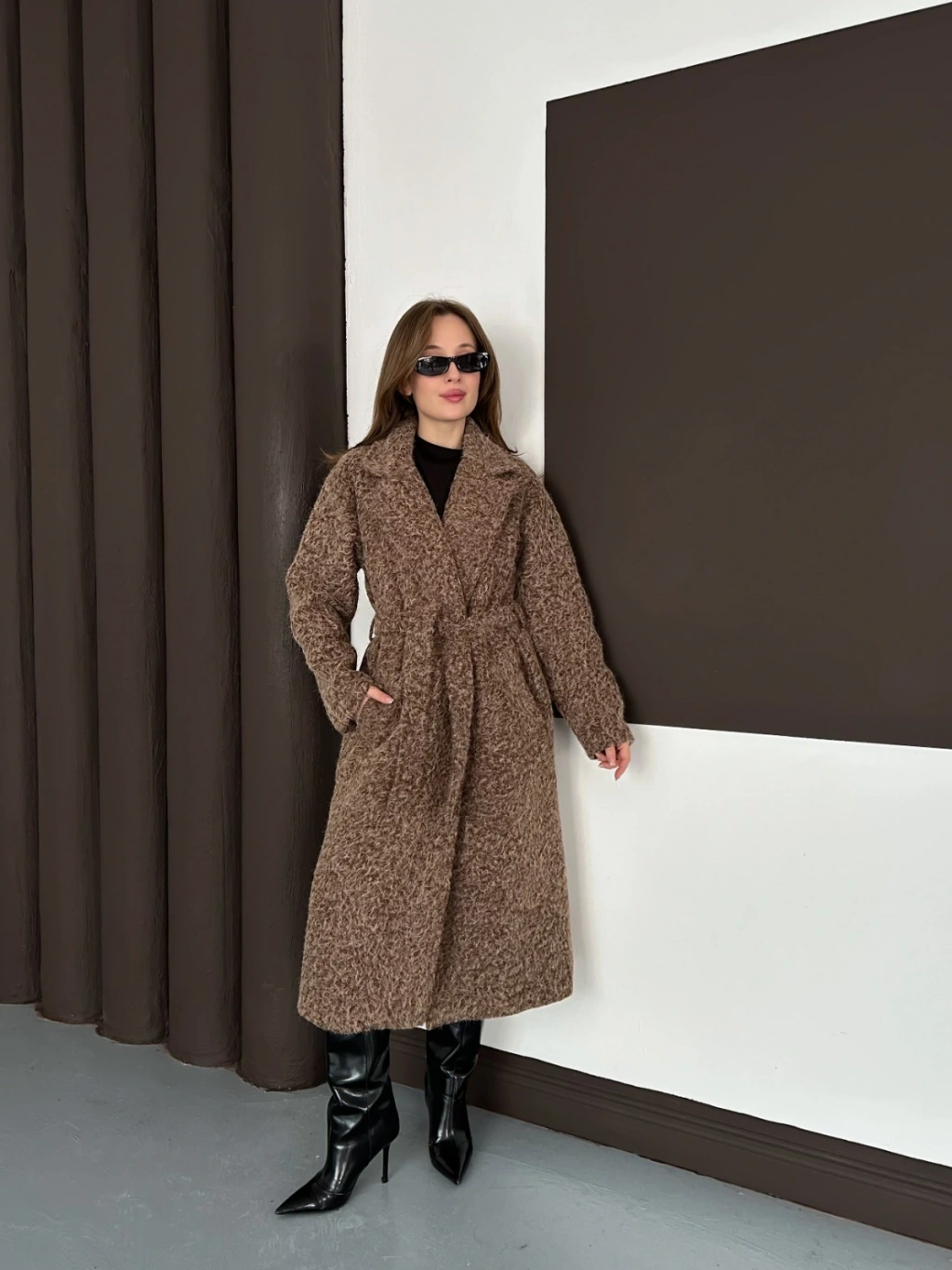 Kuşaklı Uzun Buklet Tüylü Kaban Kahve