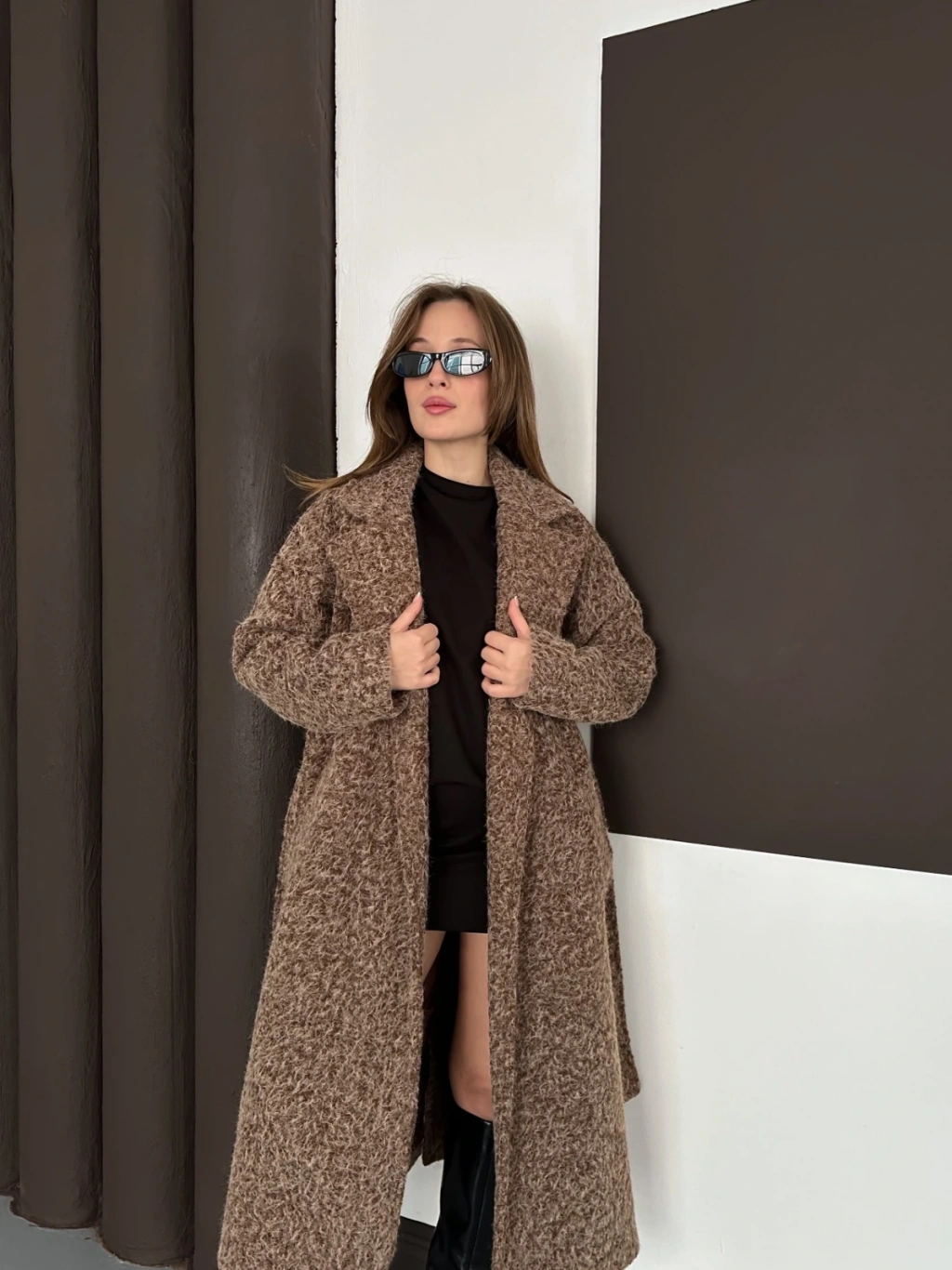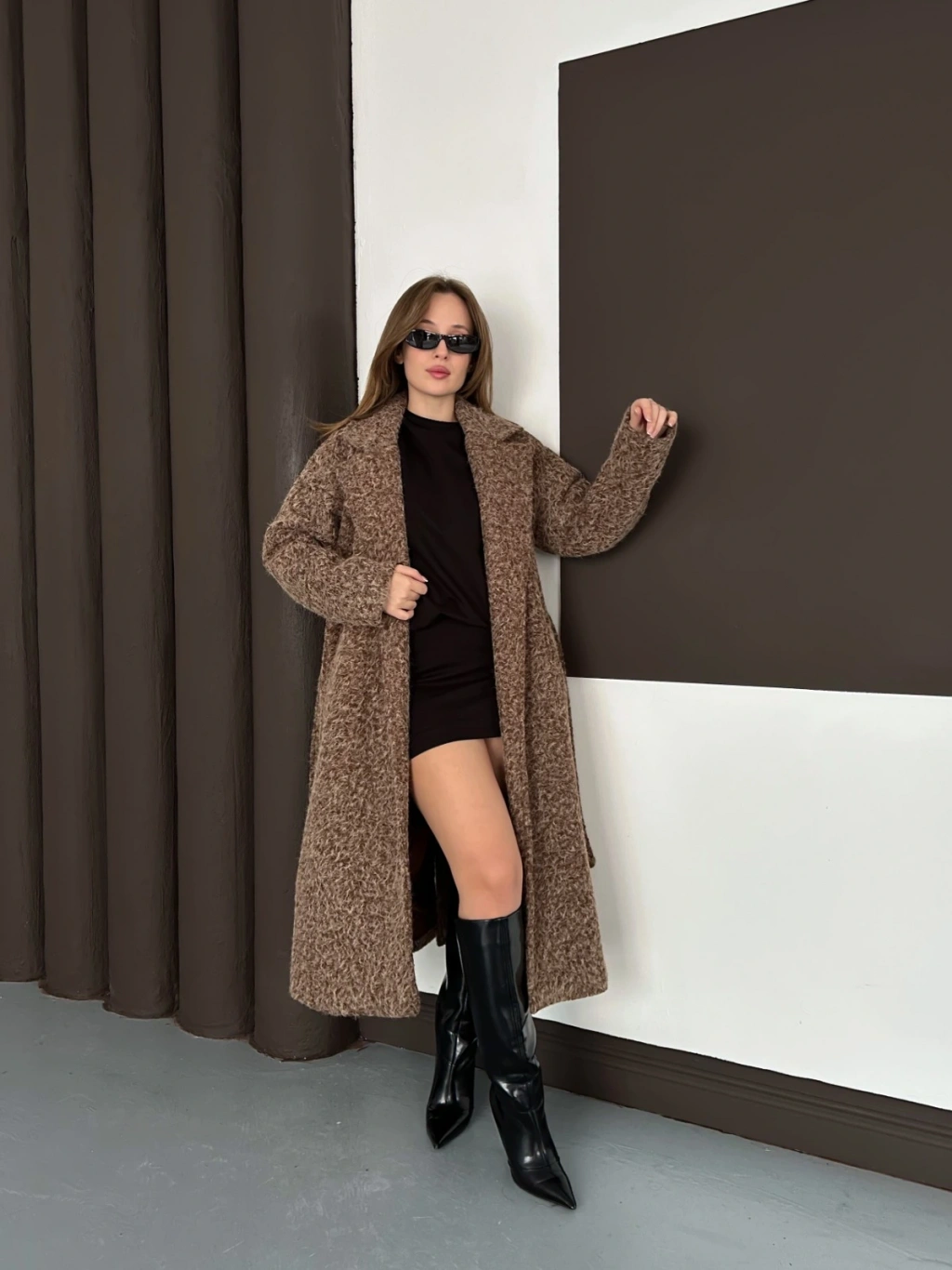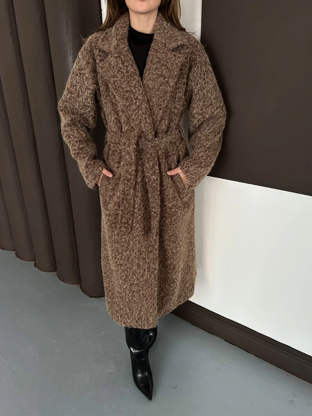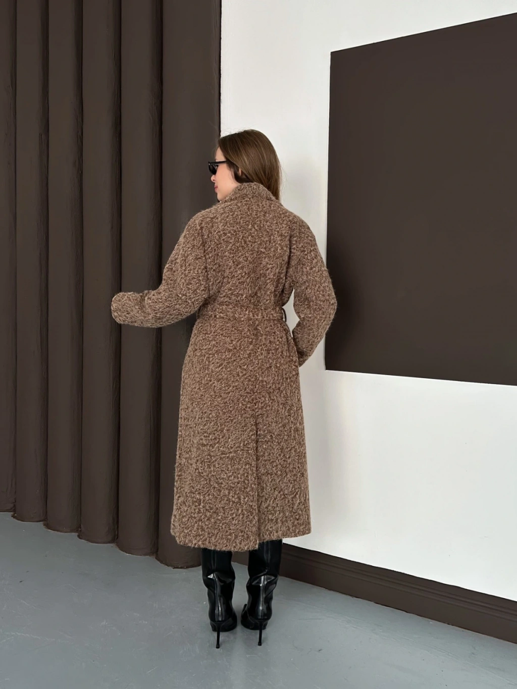Kuşaklı Uzun Buklet Tüylü Kaban Kahve