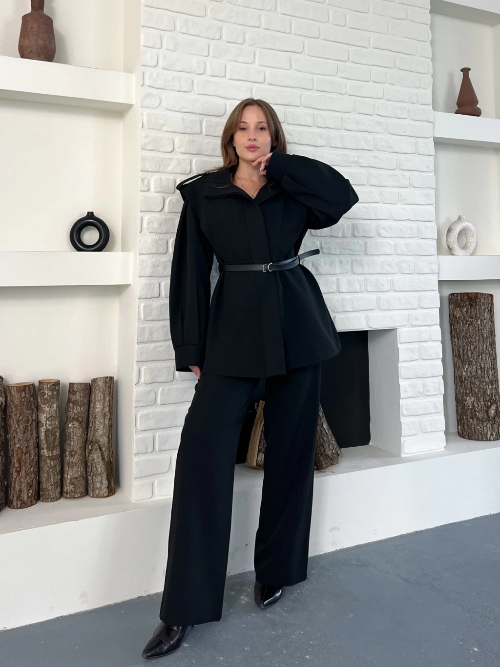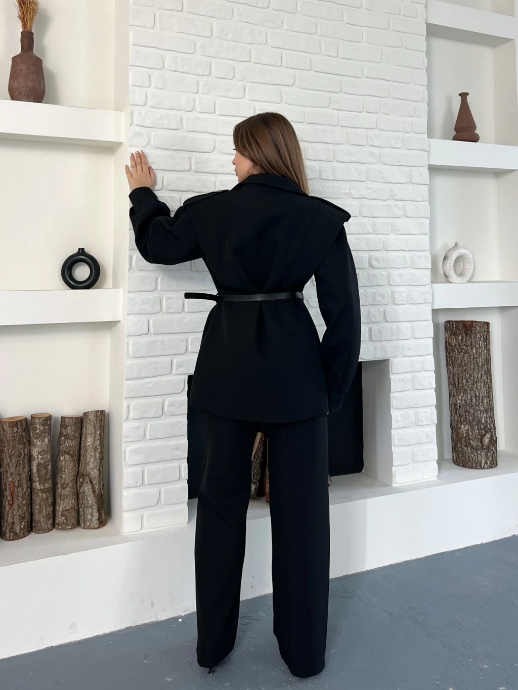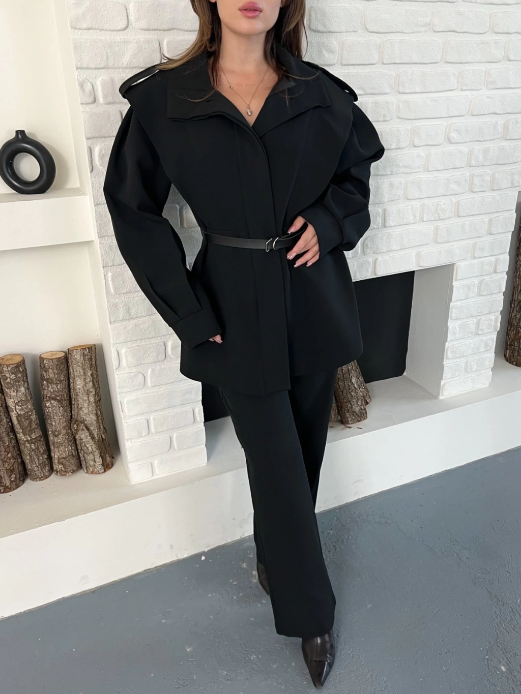 Omuz Vatkalı Kemerli İki Takım Siyah