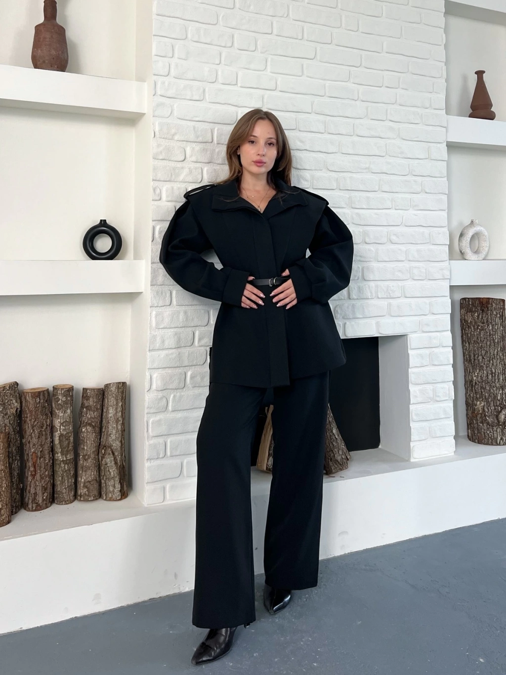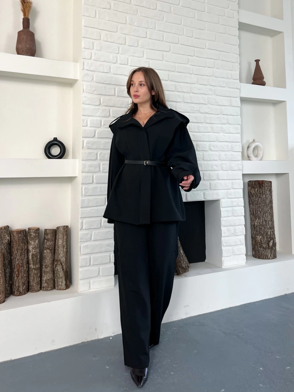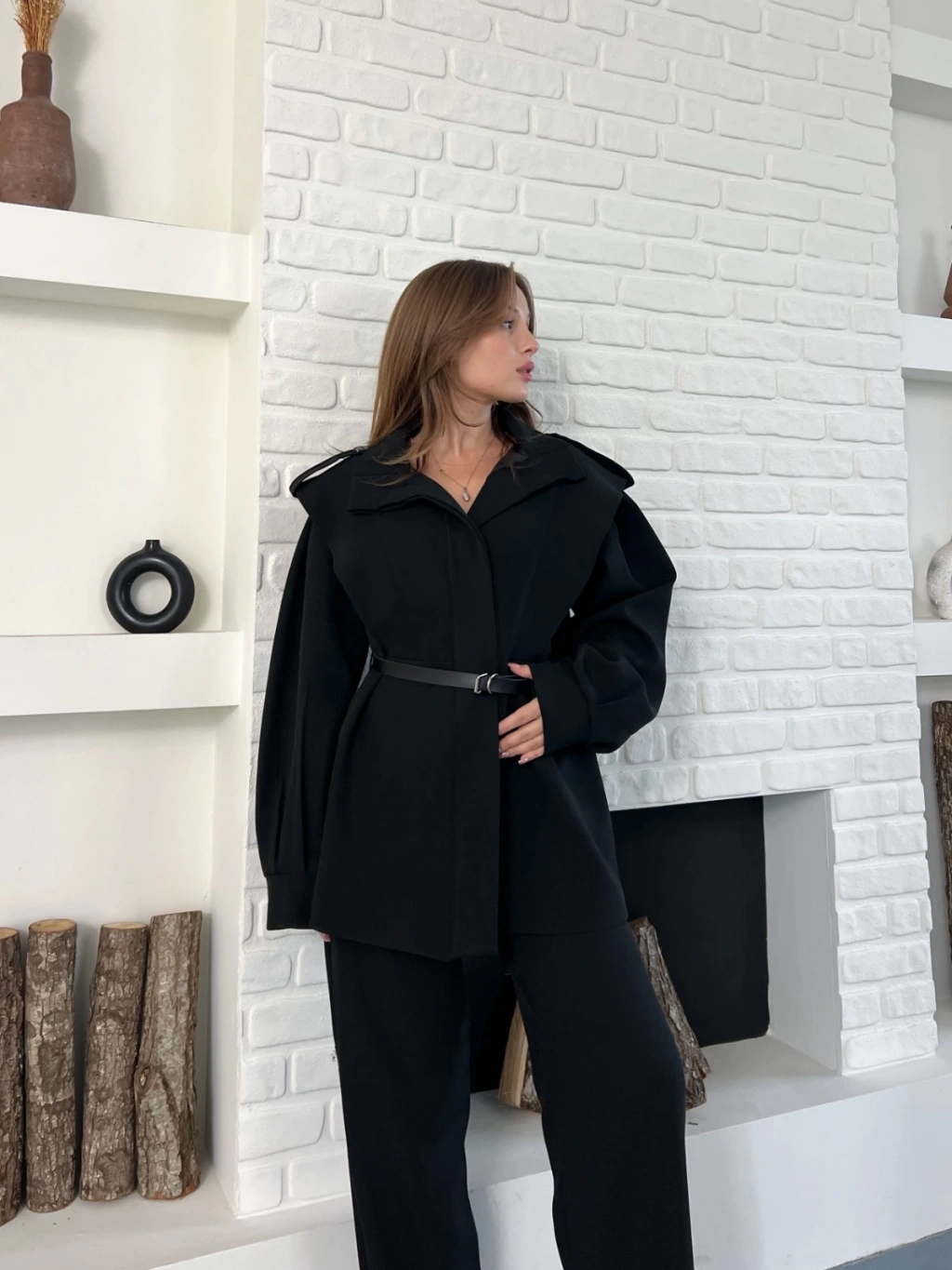 Omuz Vatkalı Kemerli İki Takım Siyah