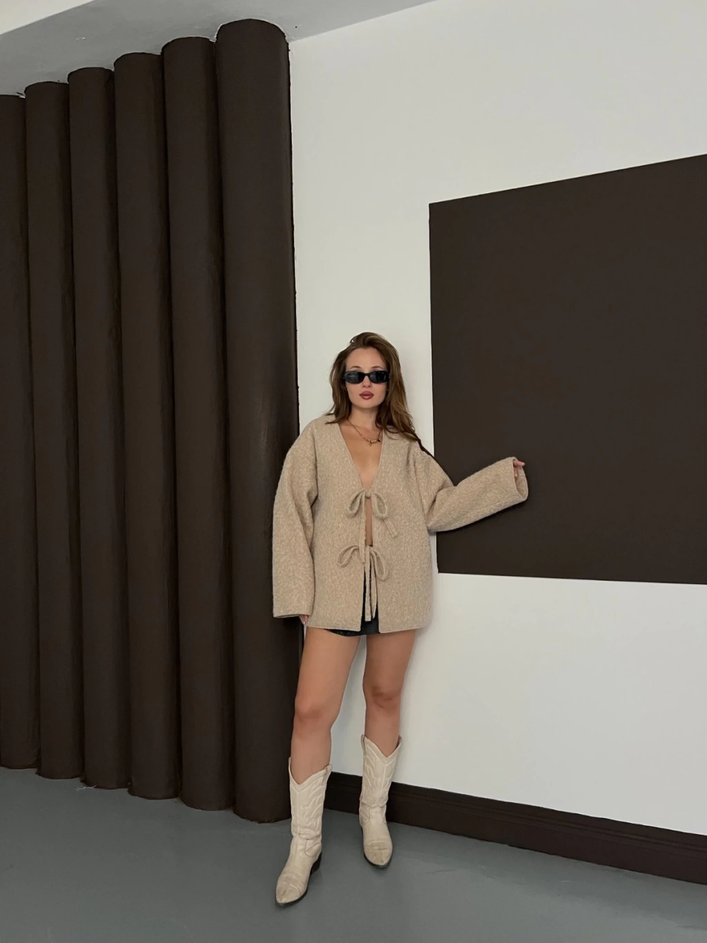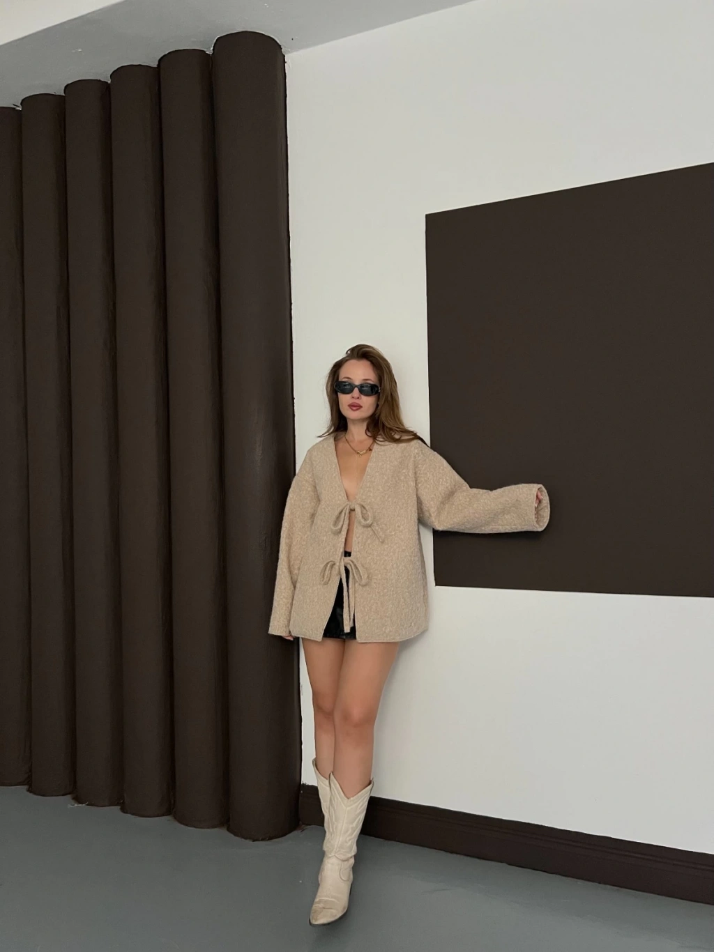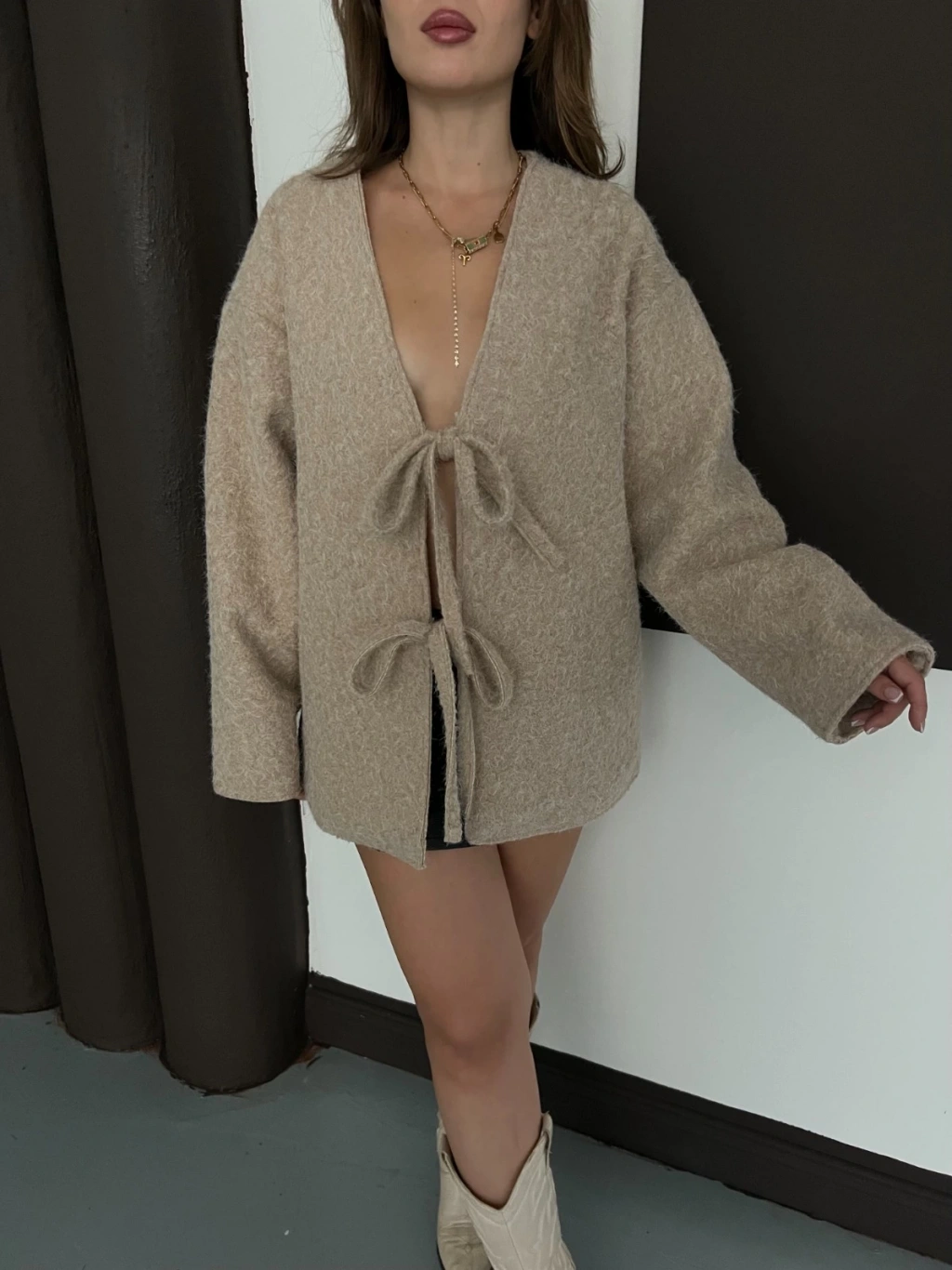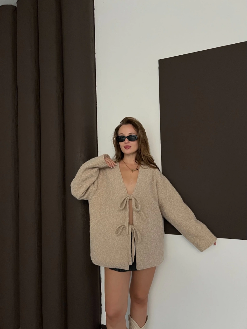 Ön Bağlama Detaylı Kaşe Ceket Bej