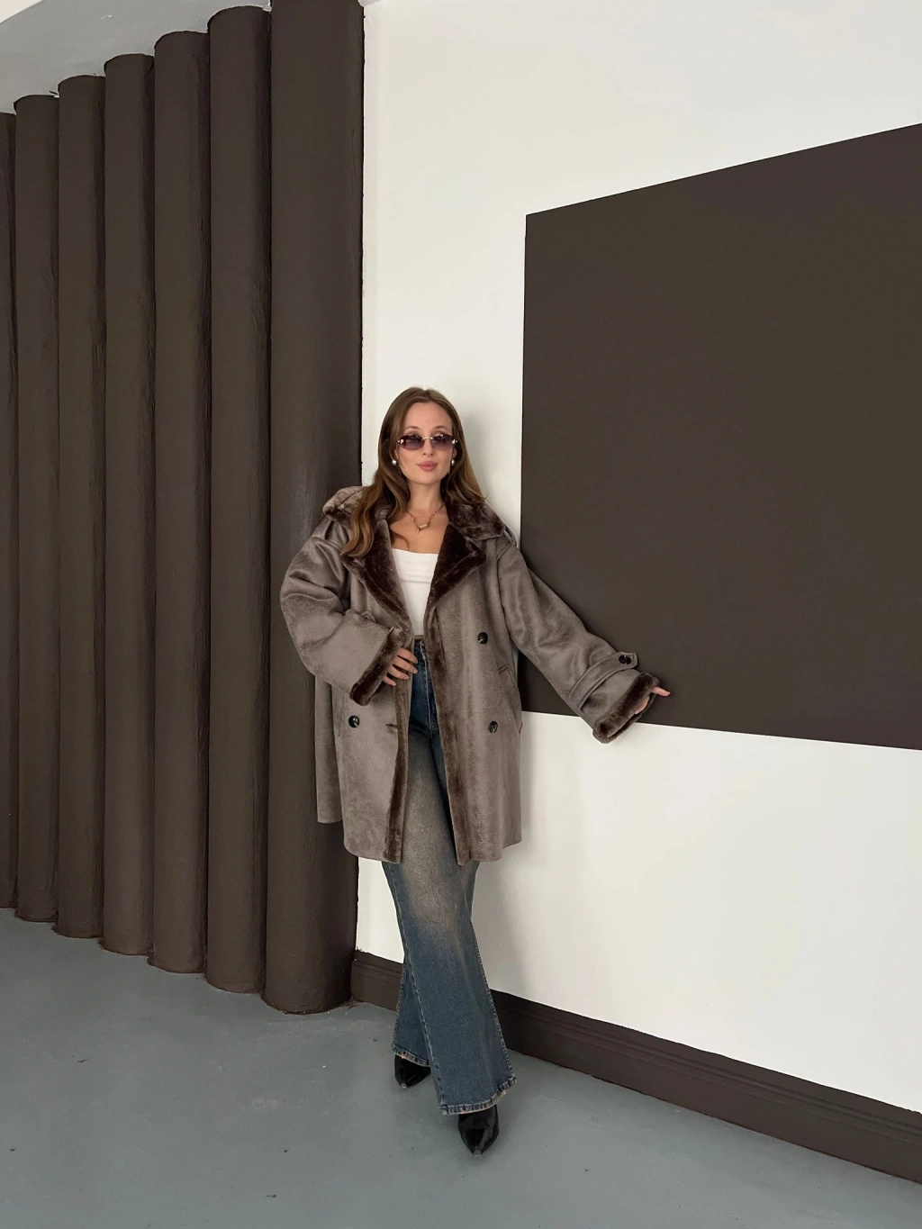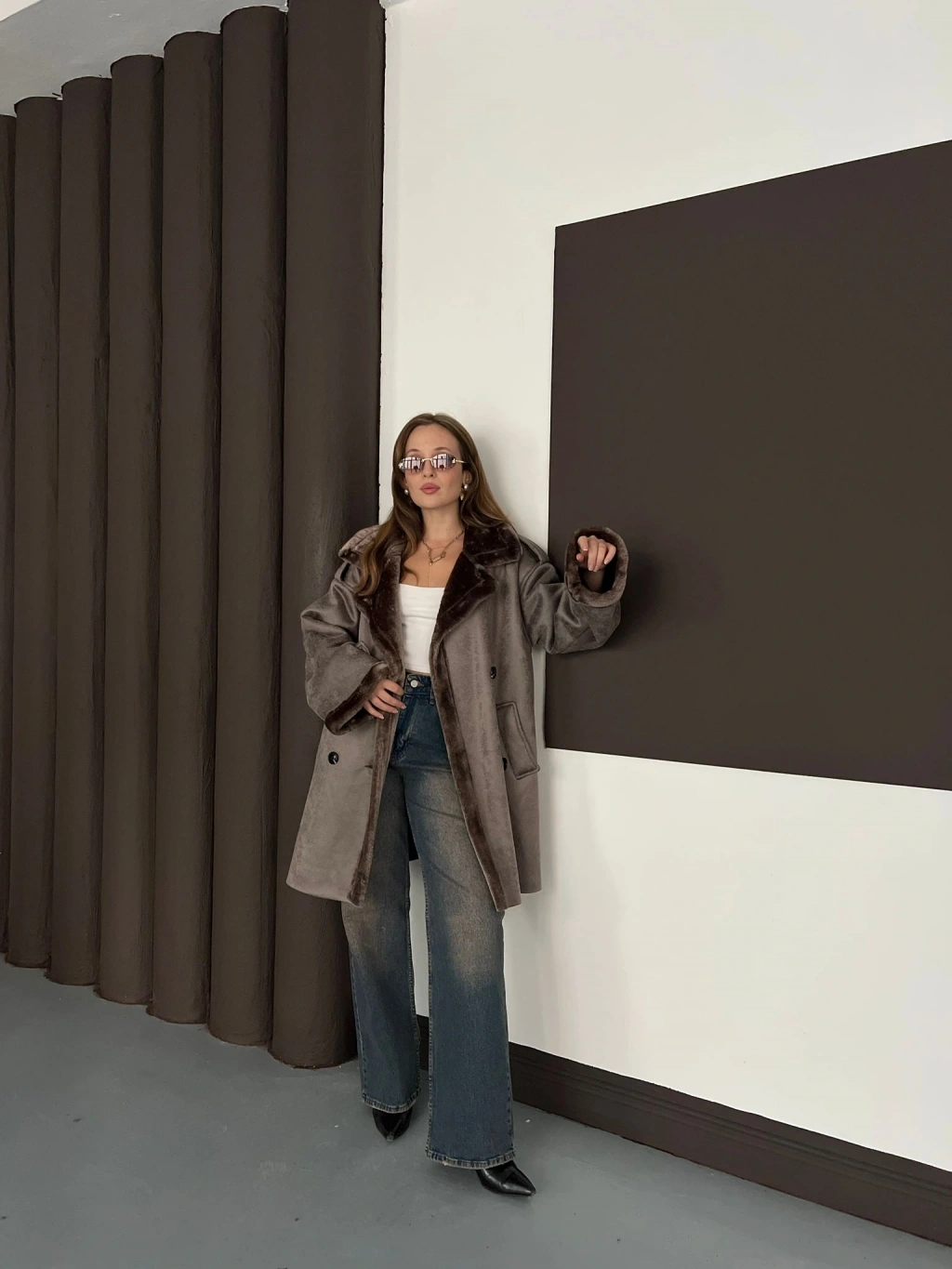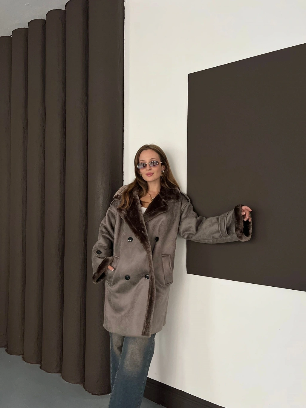 Peluş Detaylı Uzun Lamine Kaban Kahve