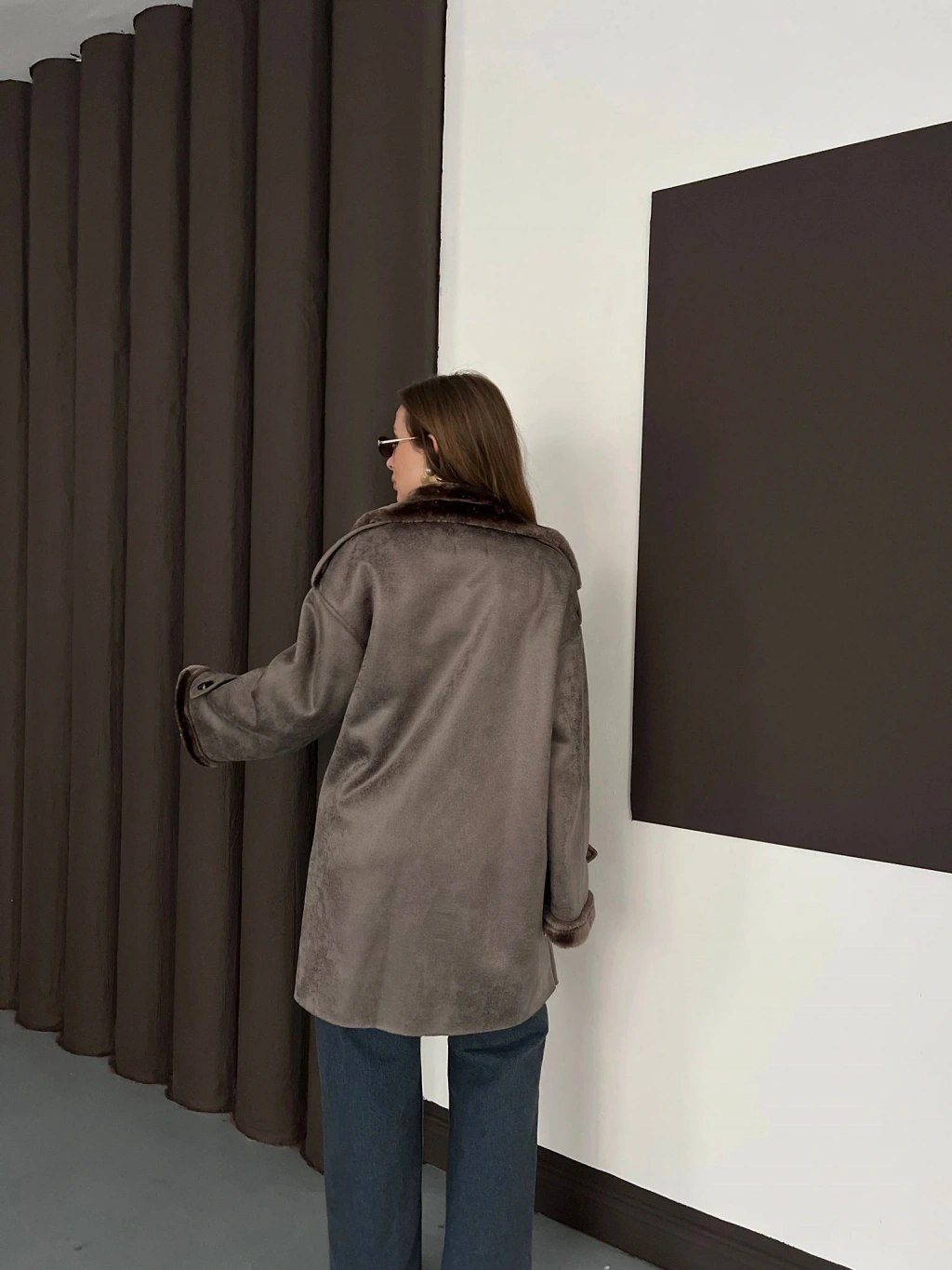 Kuşaklı Uzun Buklet Tüylü Kaban Antrasit