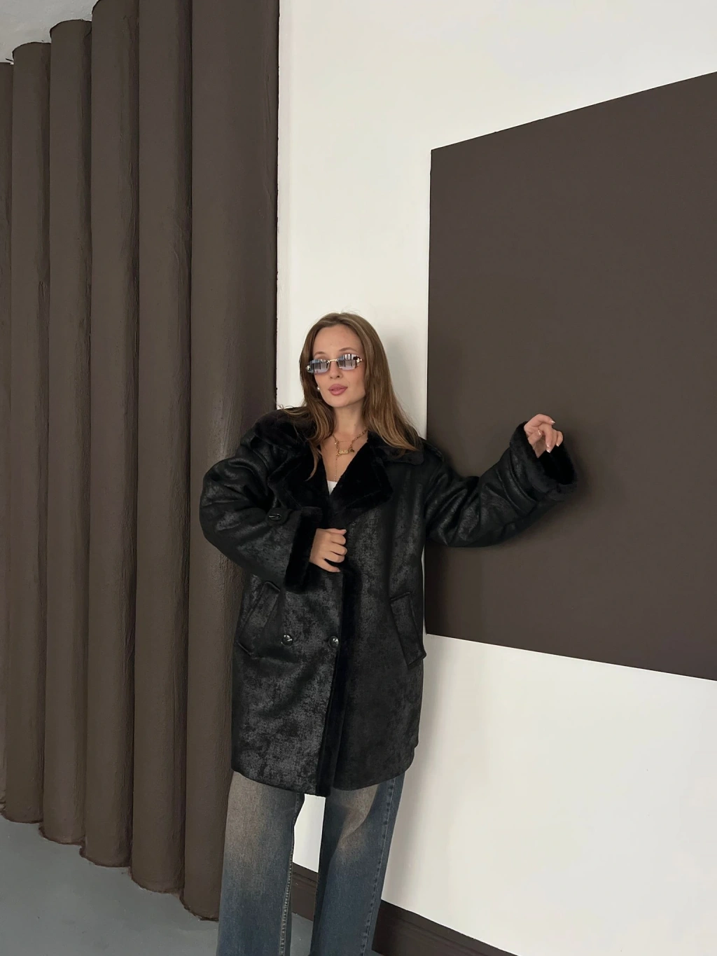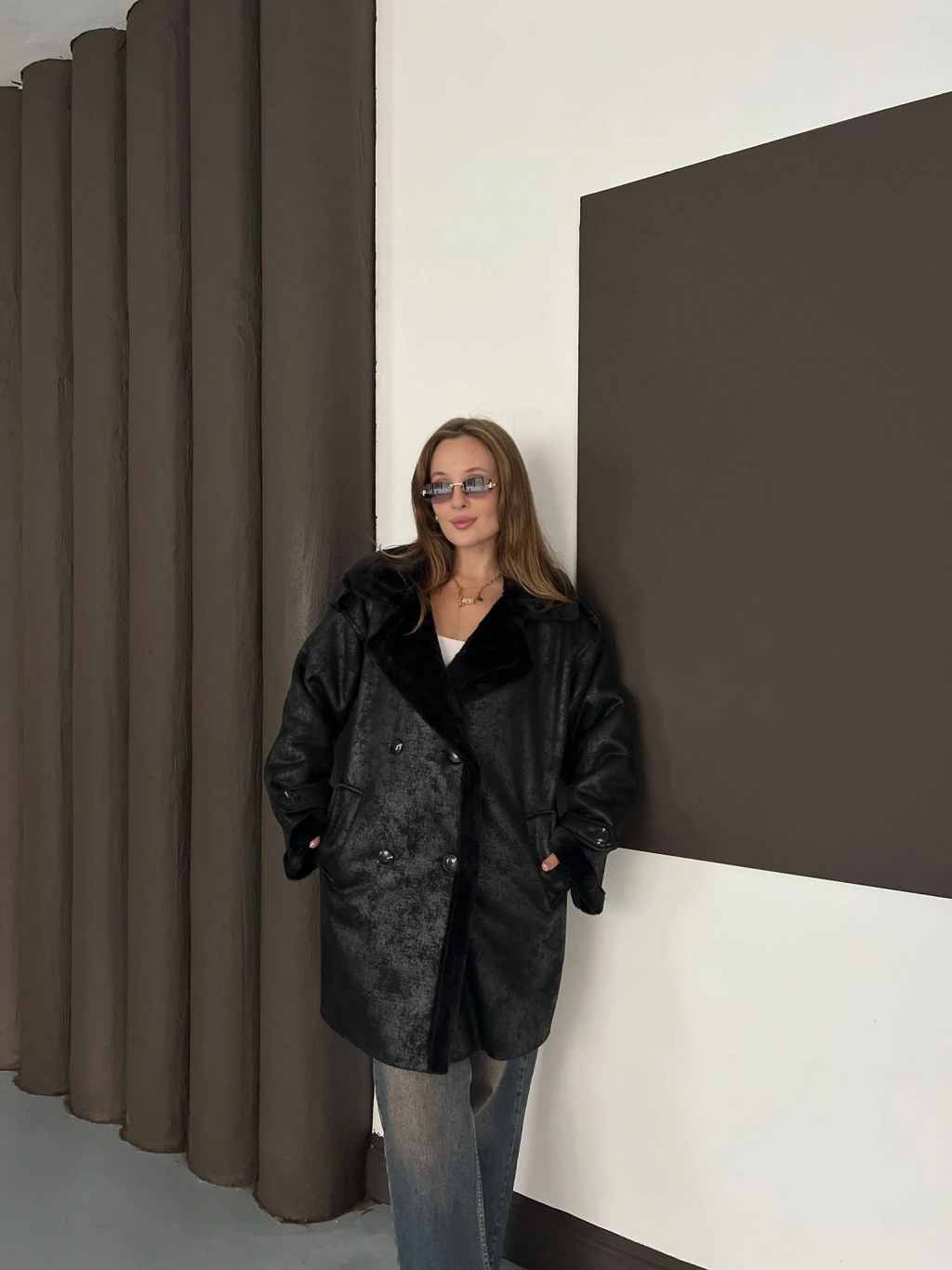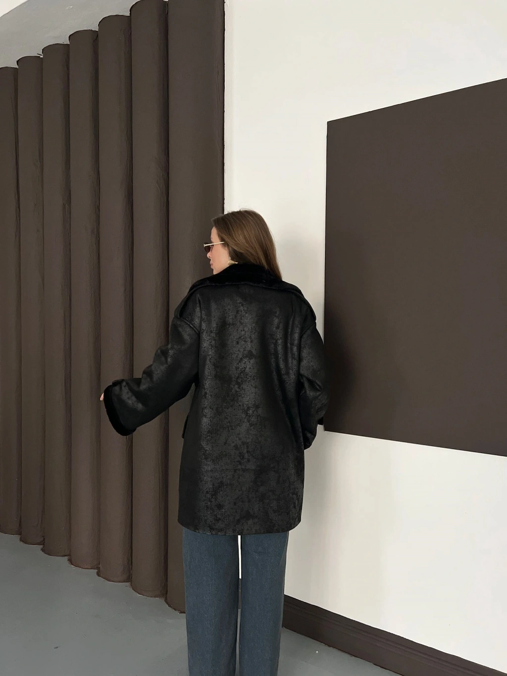 Peluş Detaylı Uzun Lamine Kaban Siyah
