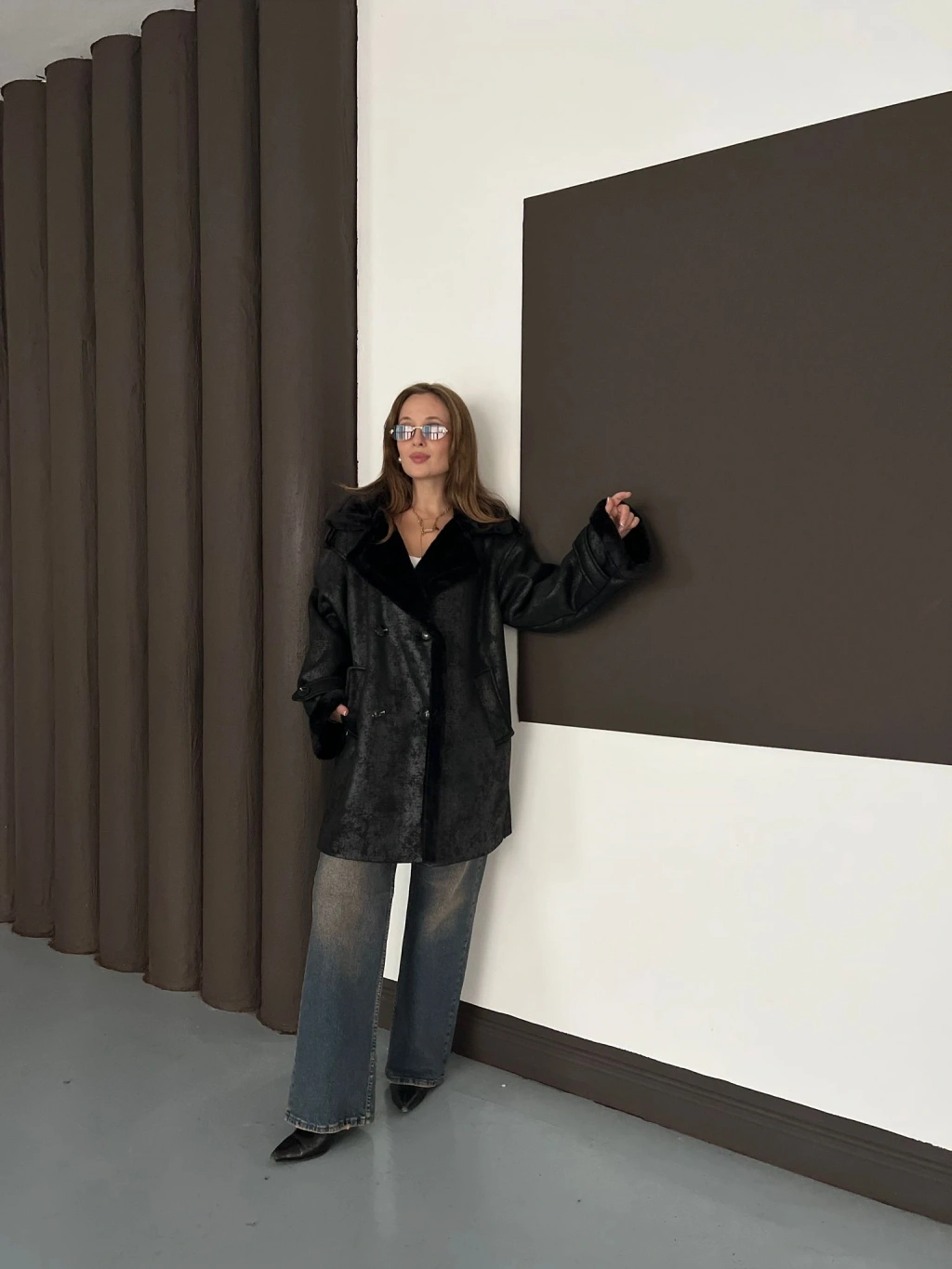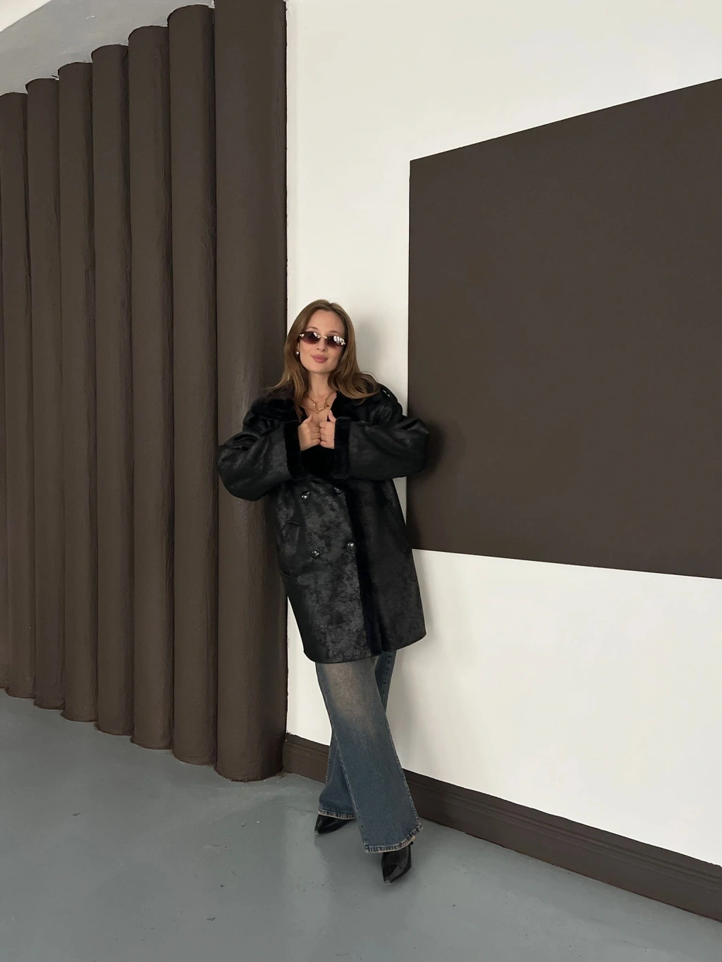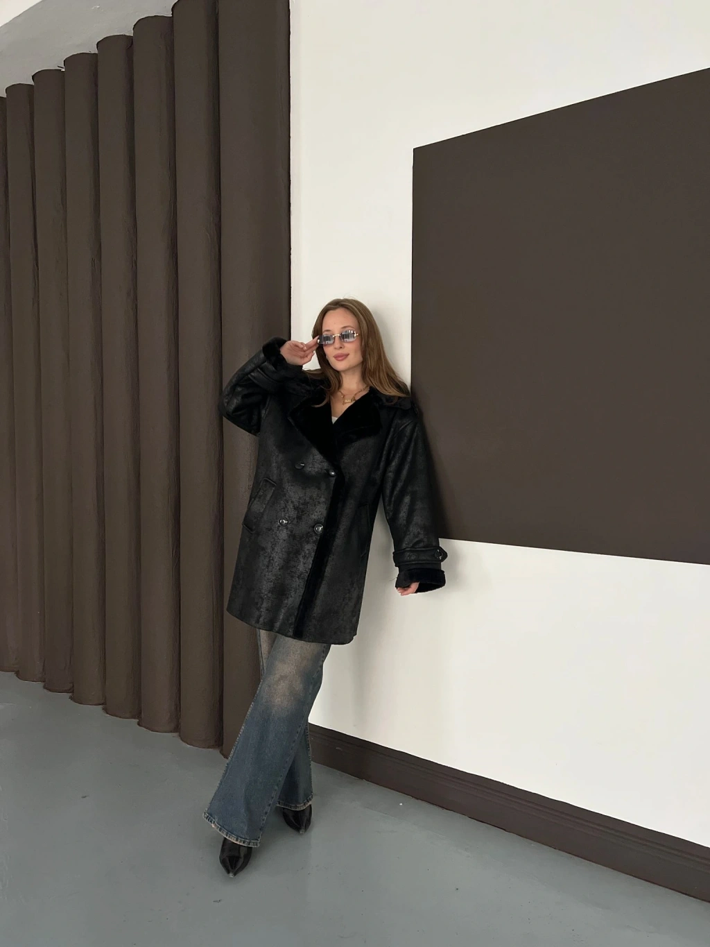 Peluş Detaylı Uzun Lamine Kaban Siyah
