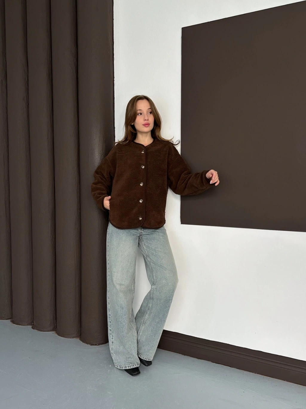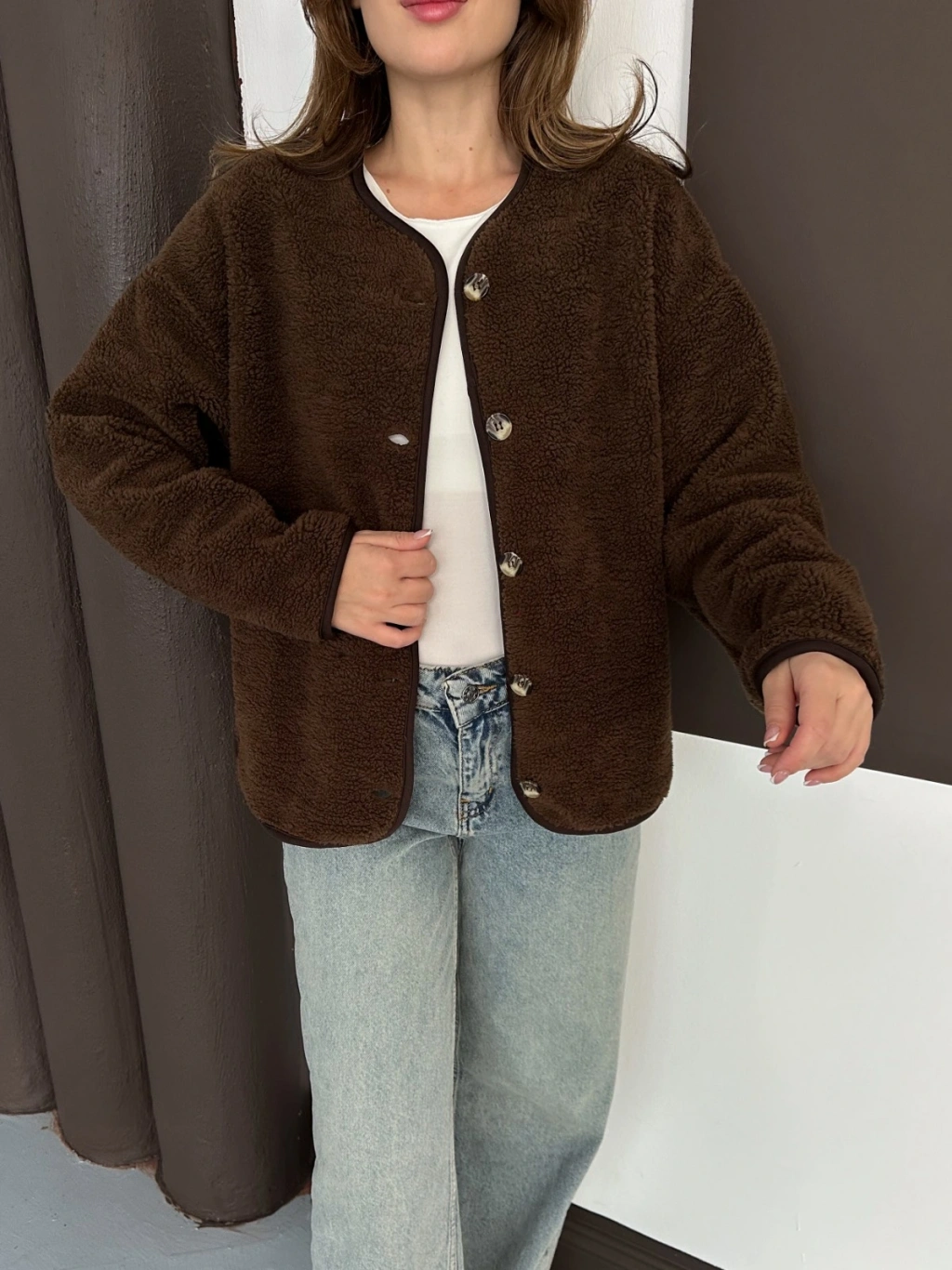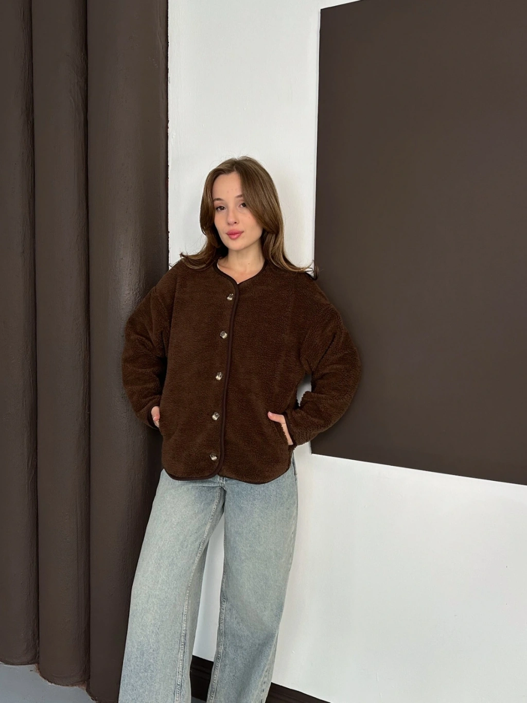 Peluş Düğme Detaylı İçi Astarlı Cepli Ceket Acı Kahve