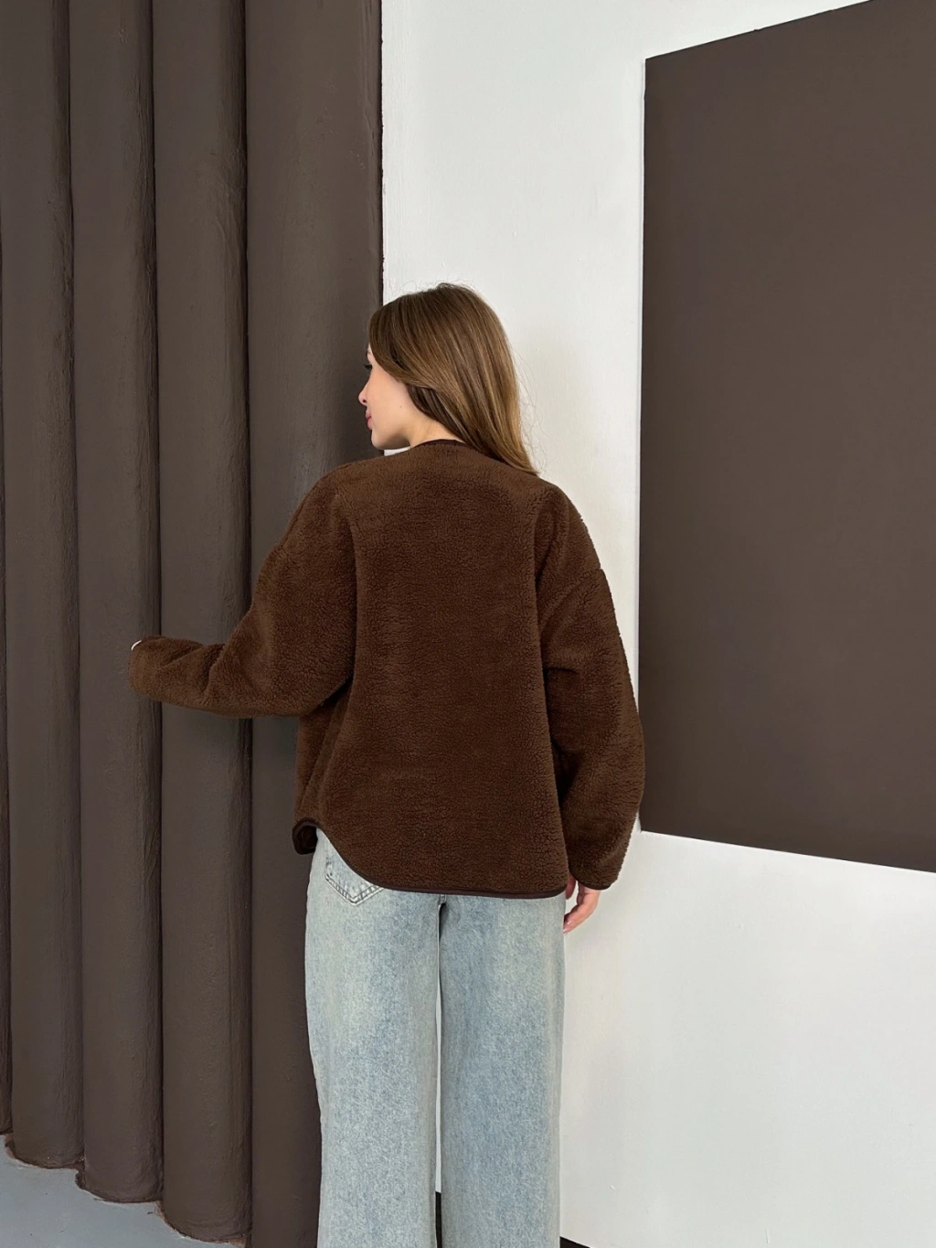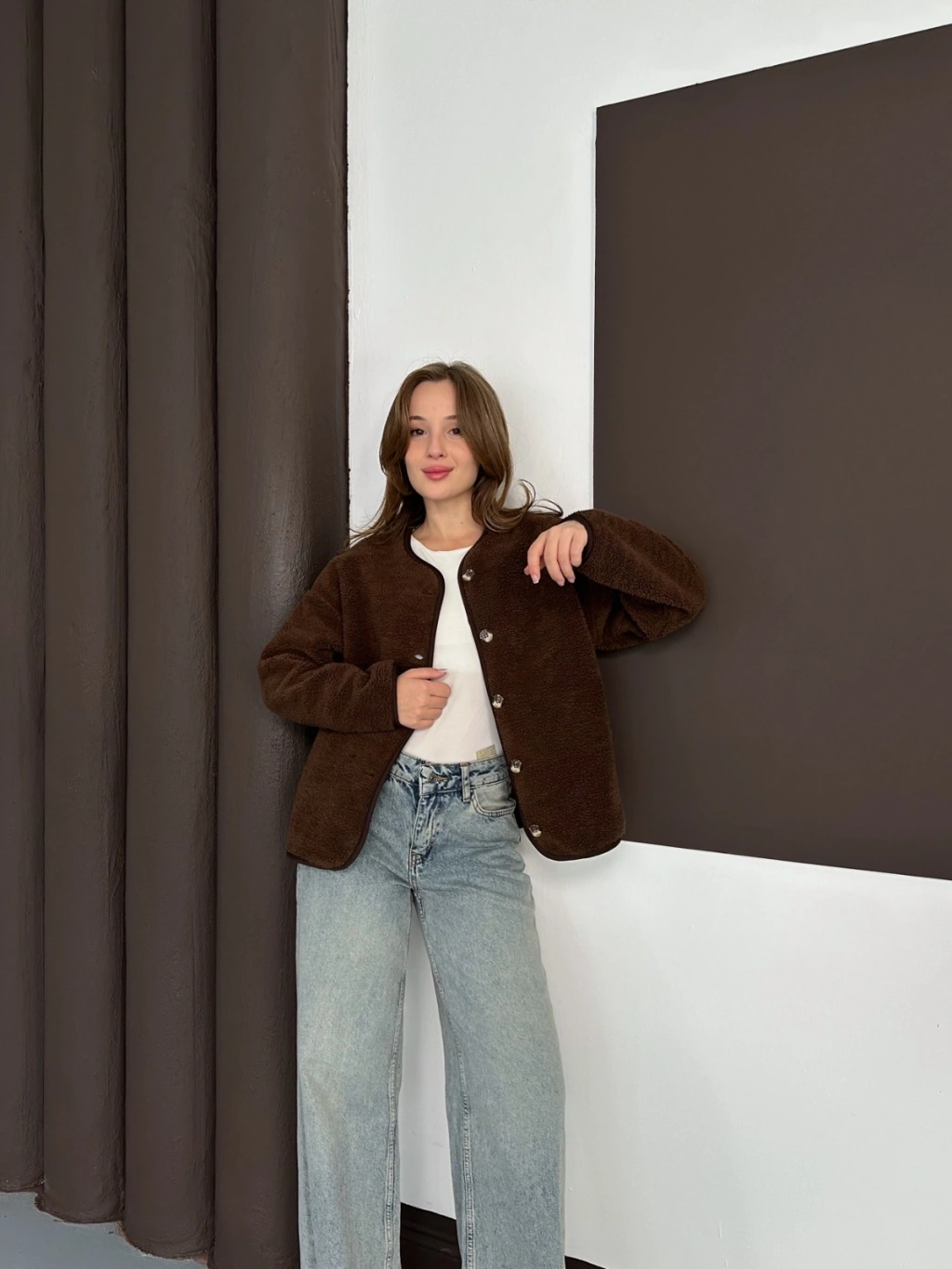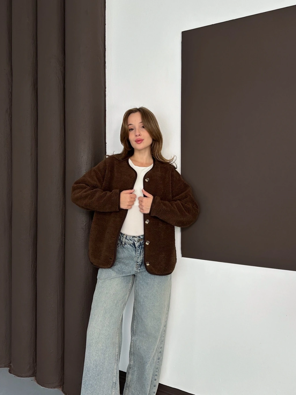 Peluş Düğme Detaylı İçi Astarlı Cepli Ceket Acı Kahve