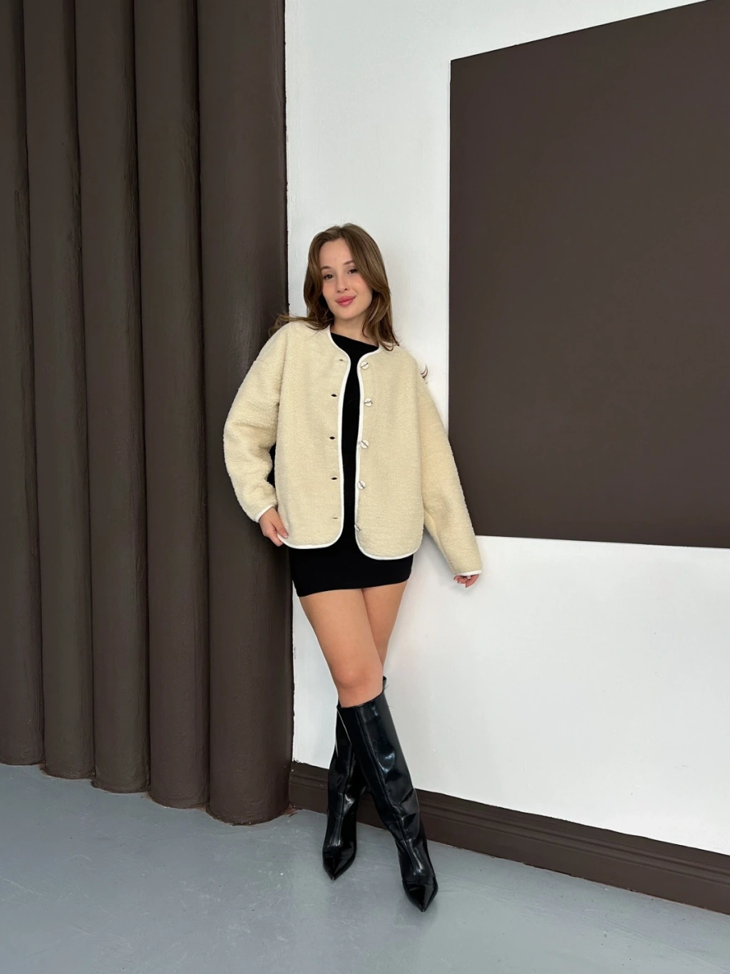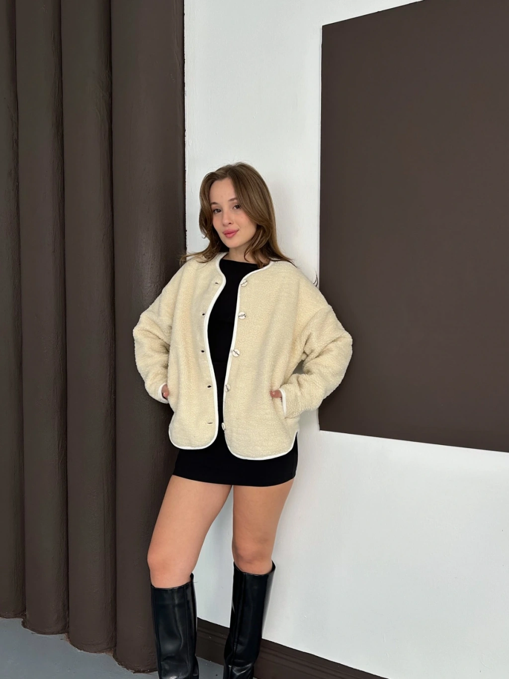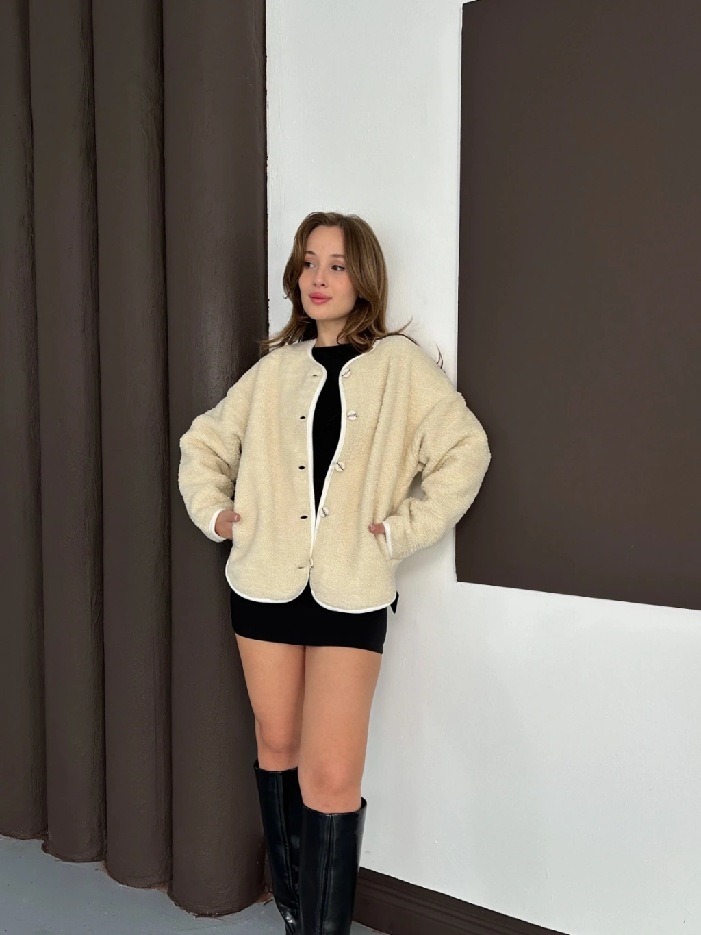 Peluş Düğme Detaylı İçi Astarlı Cepli Ceket Bej