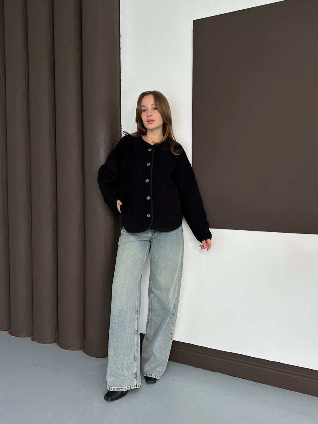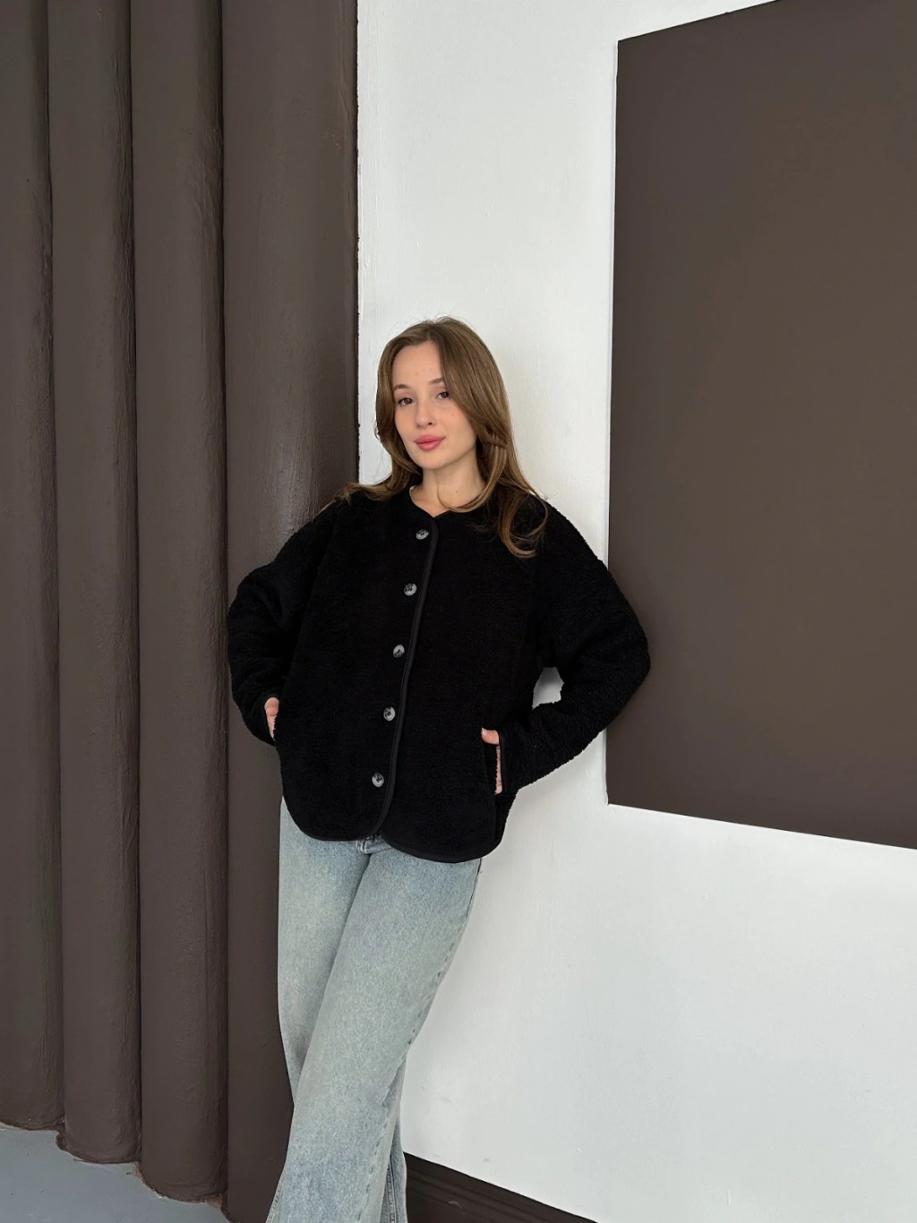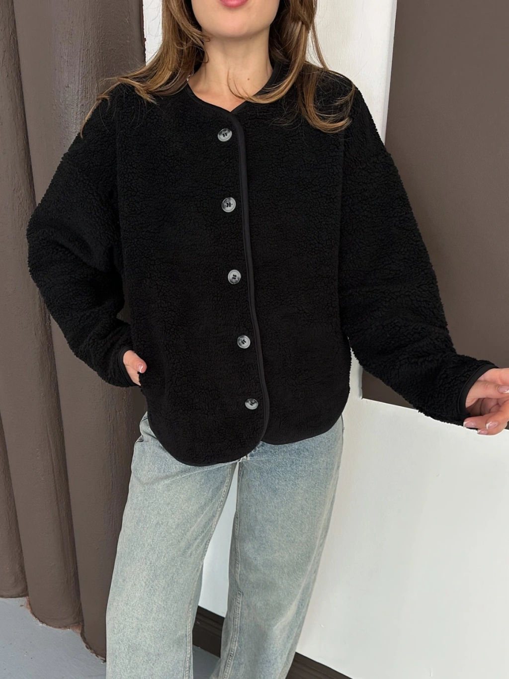 Peluş Düğme Detaylı İçi Astarlı Cepli Ceket