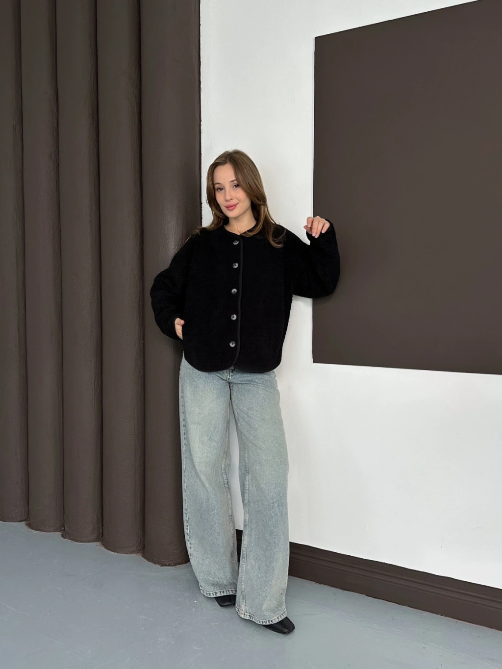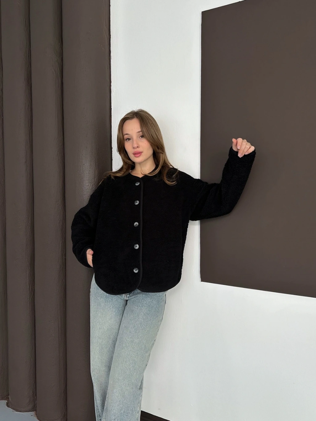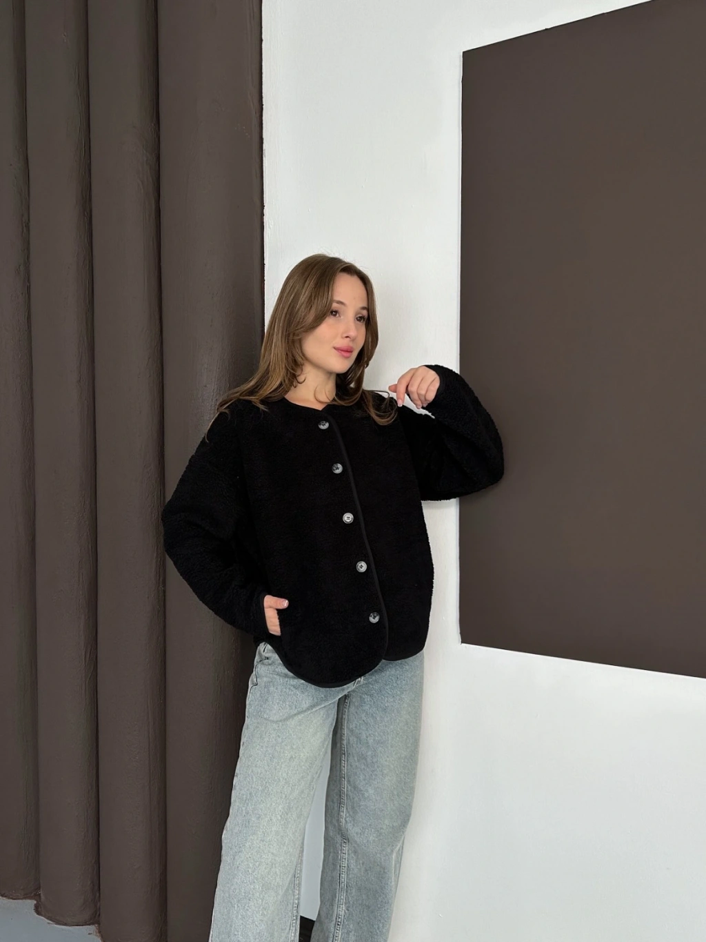 Peluş Düğme Detaylı İçi Astarlı Cepli Ceket