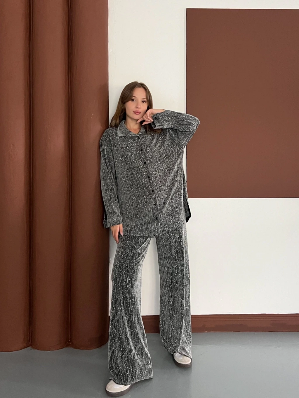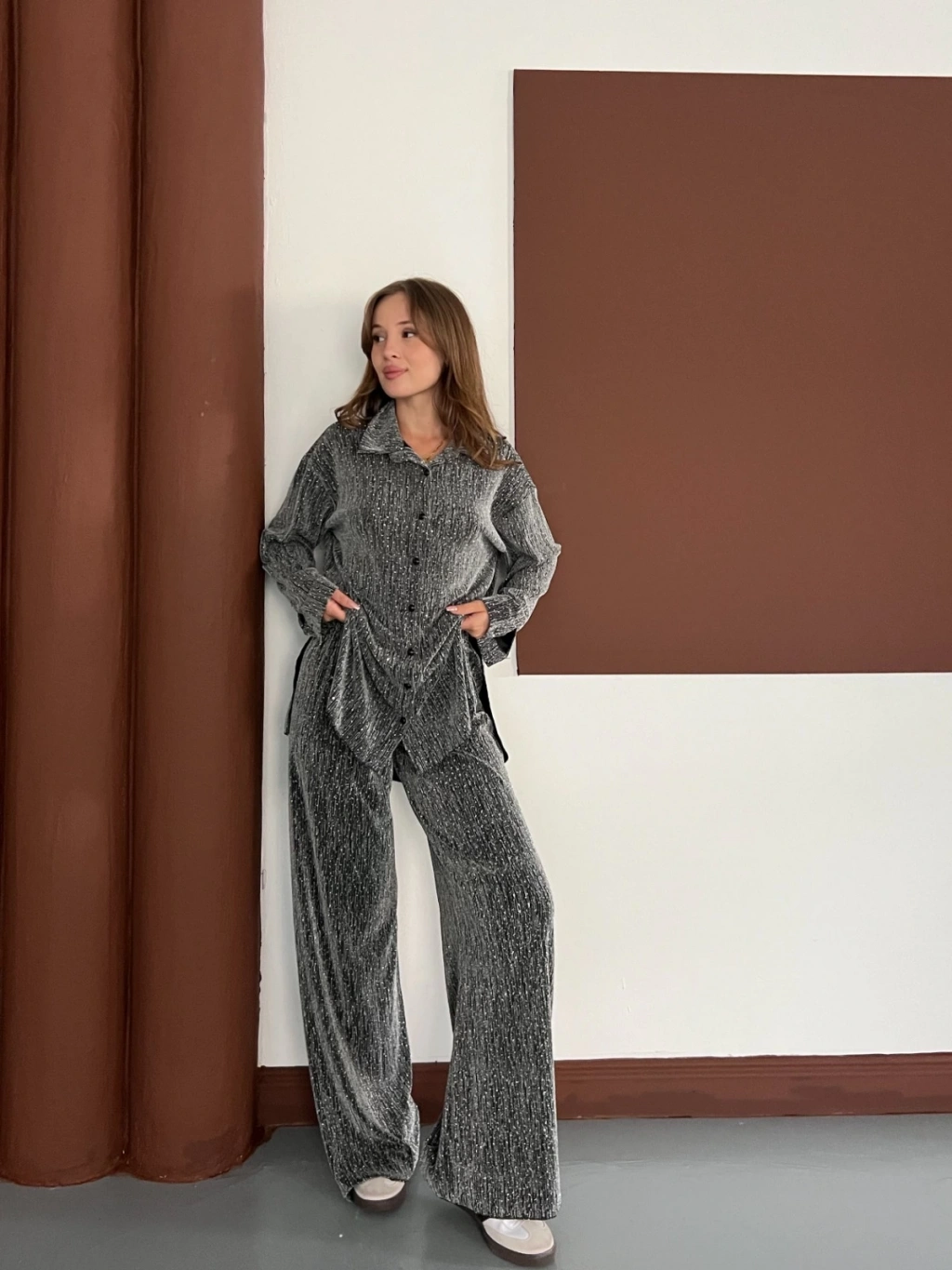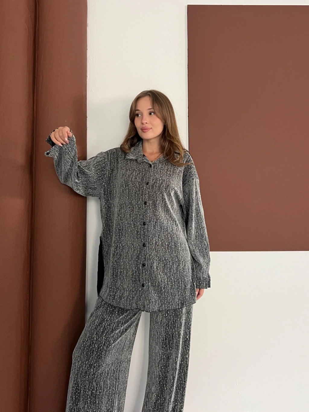 Taş Detaylı Gömlek-Pantolon Takım Gri