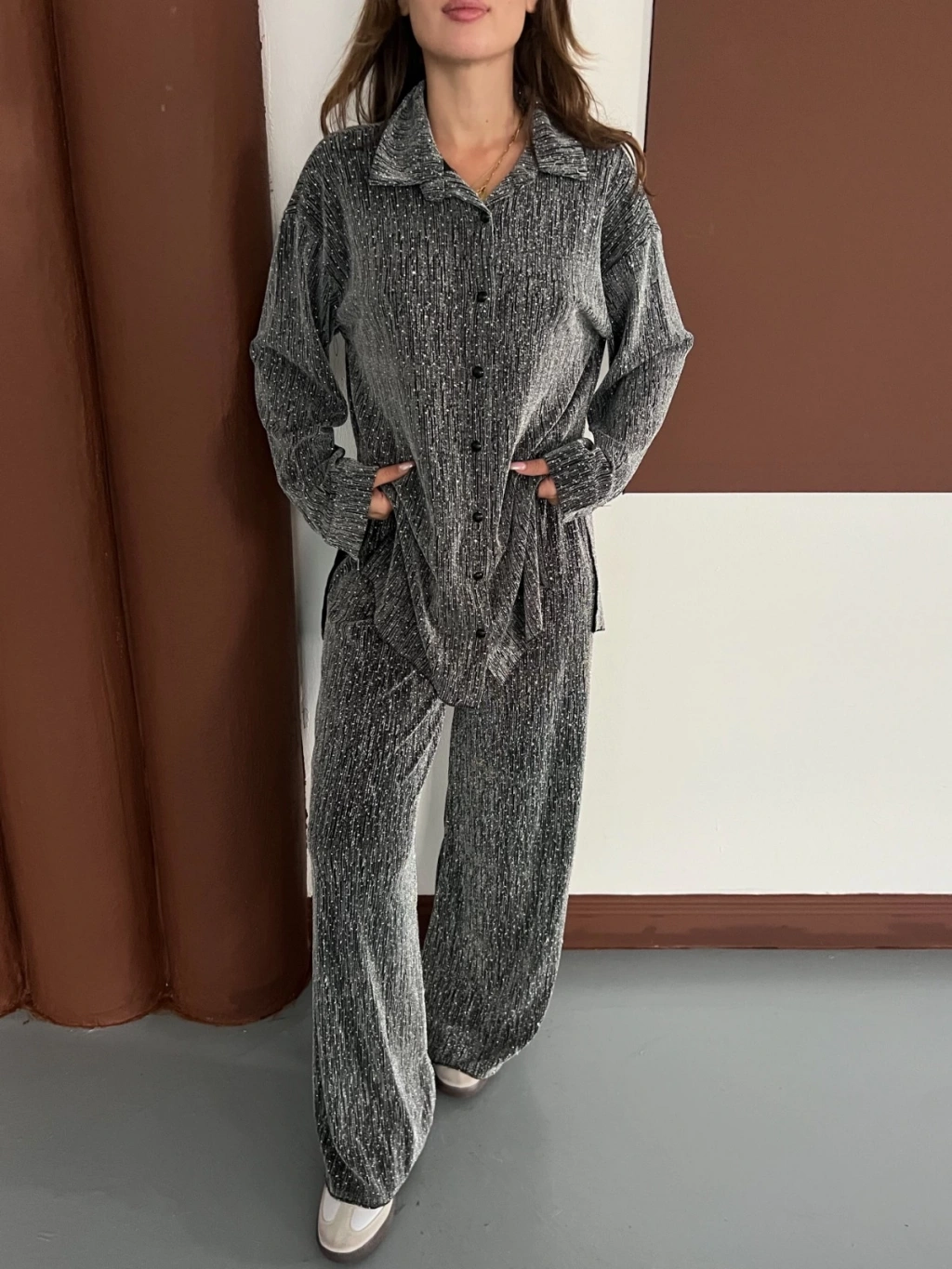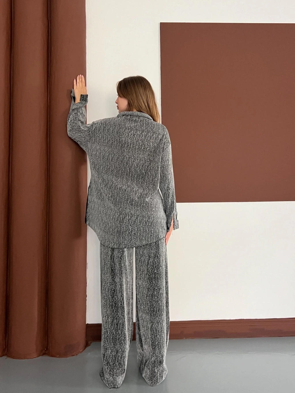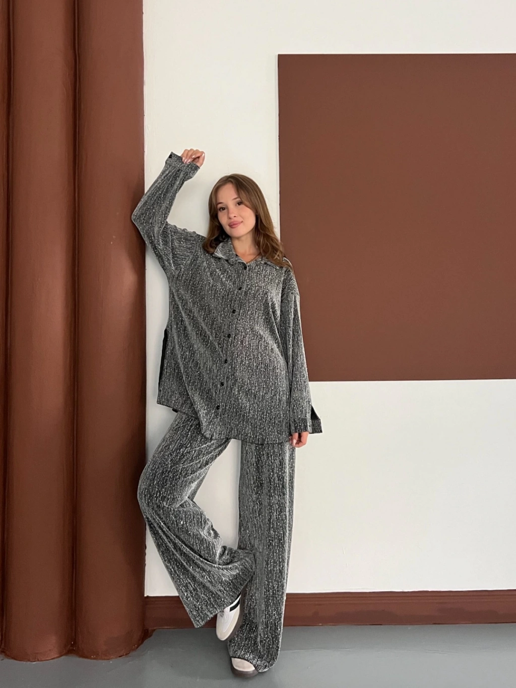 Taş Detaylı Gömlek-Pantolon Takım Gri