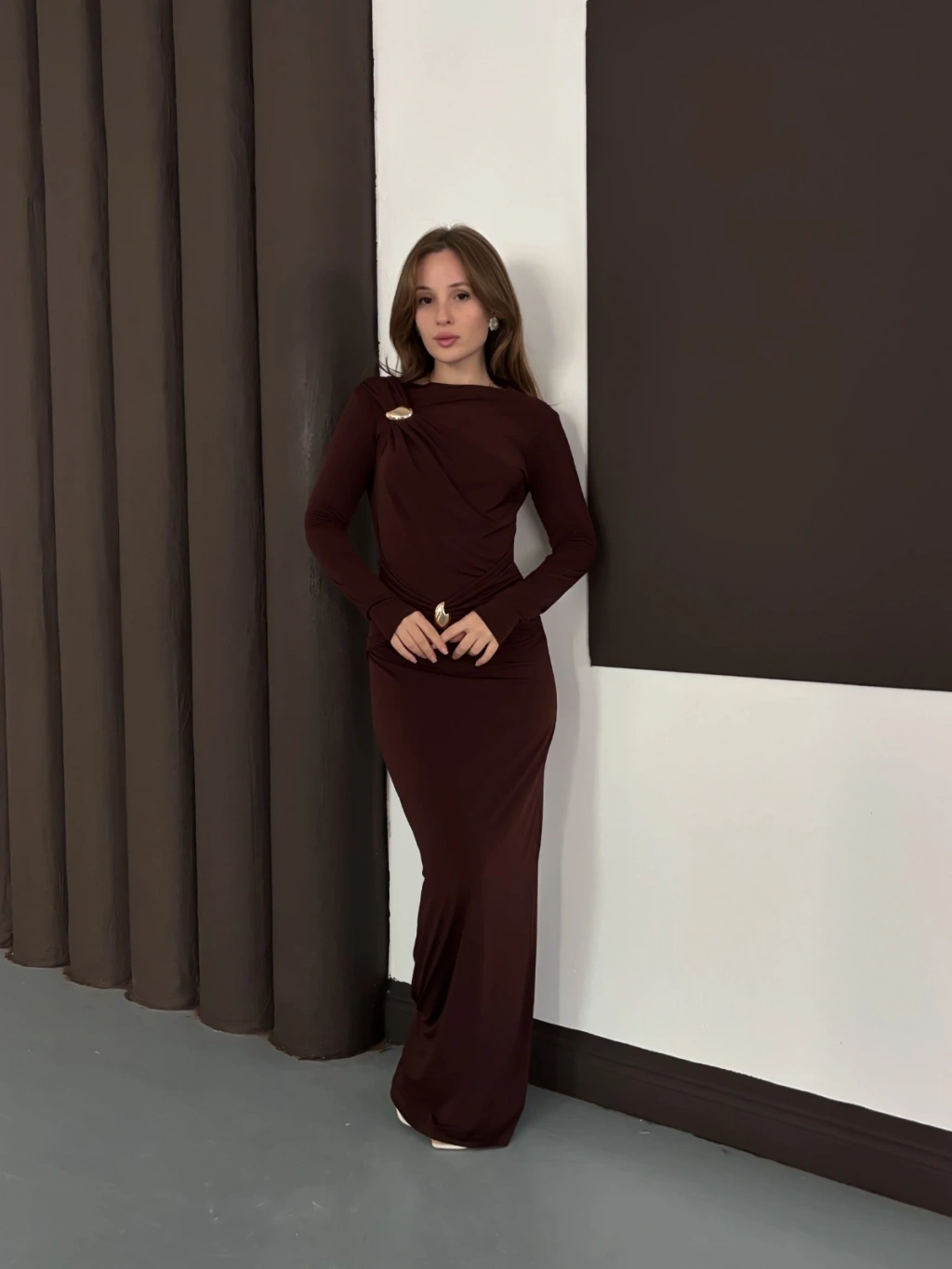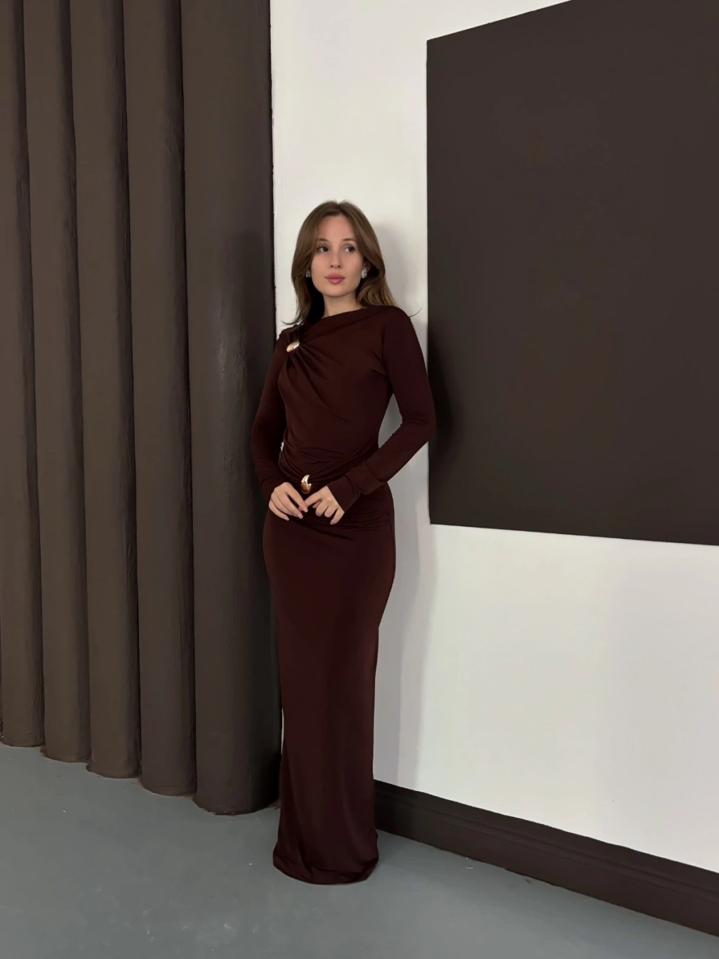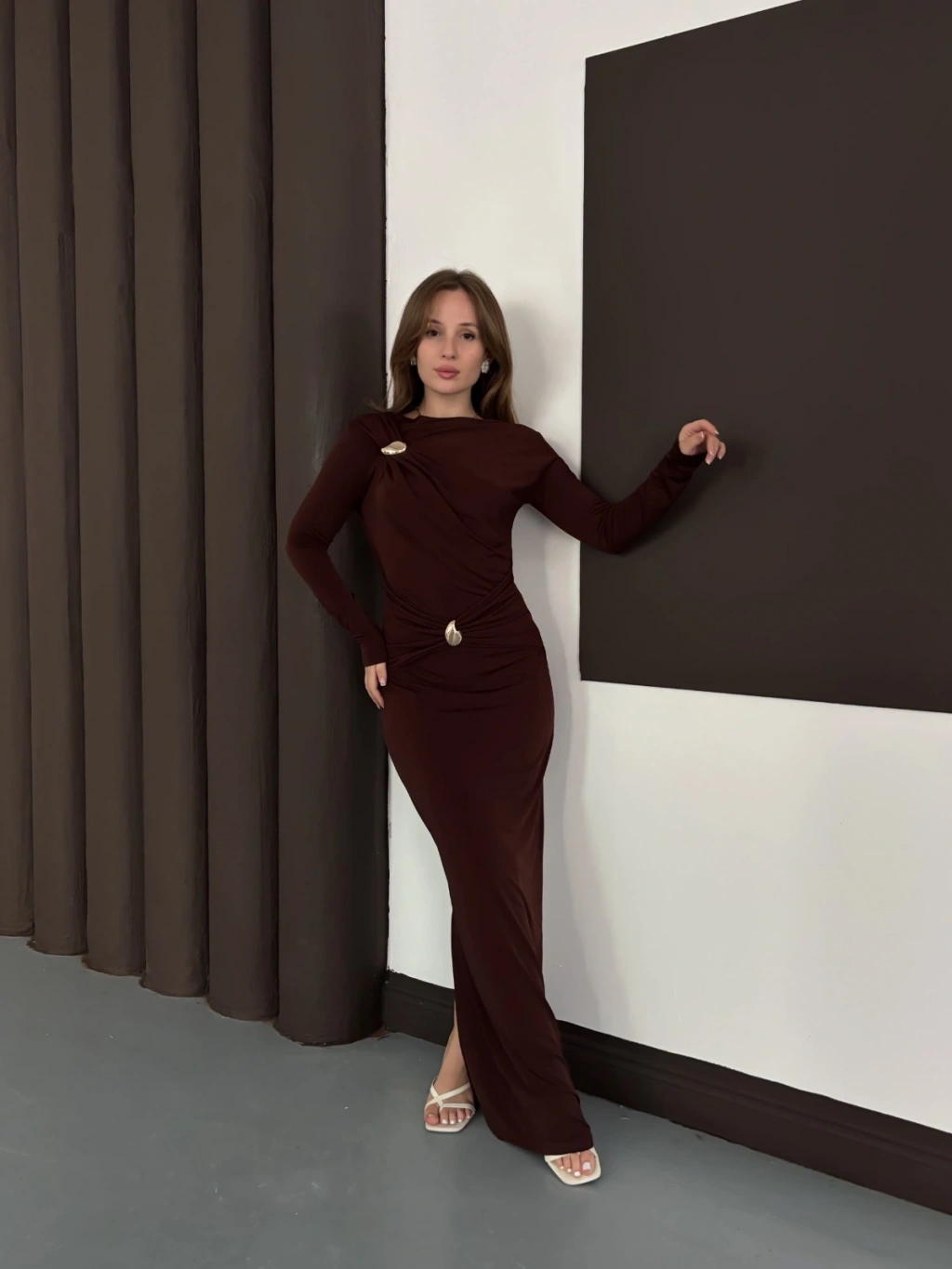 Toka Detaylı Sandy Uzun Elbise Acı Kahve