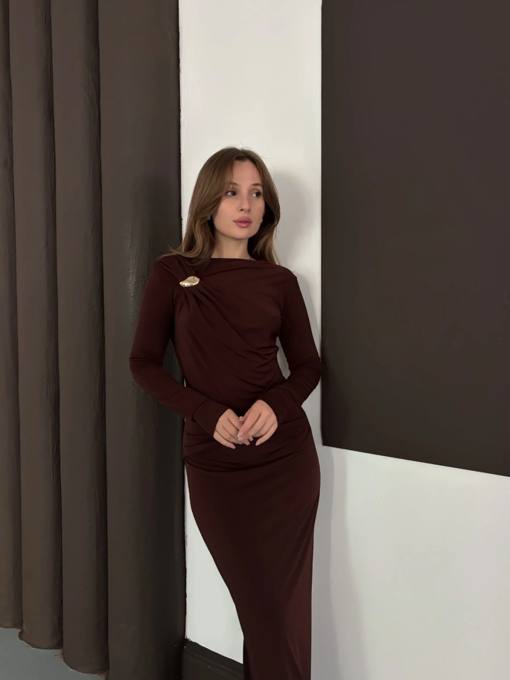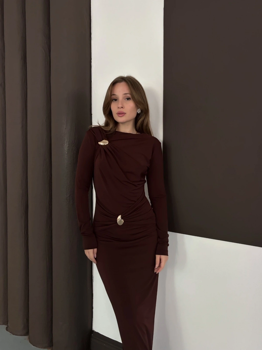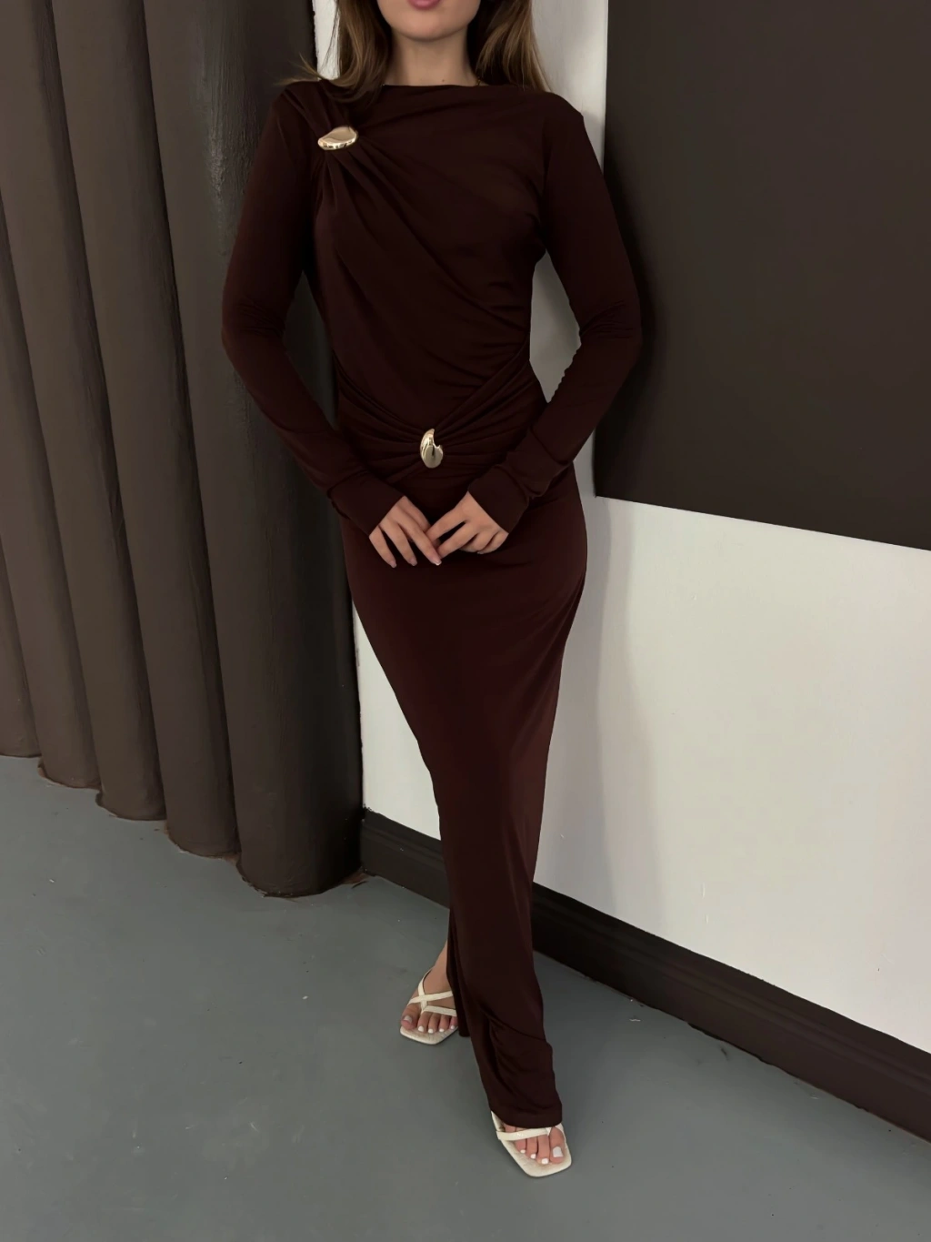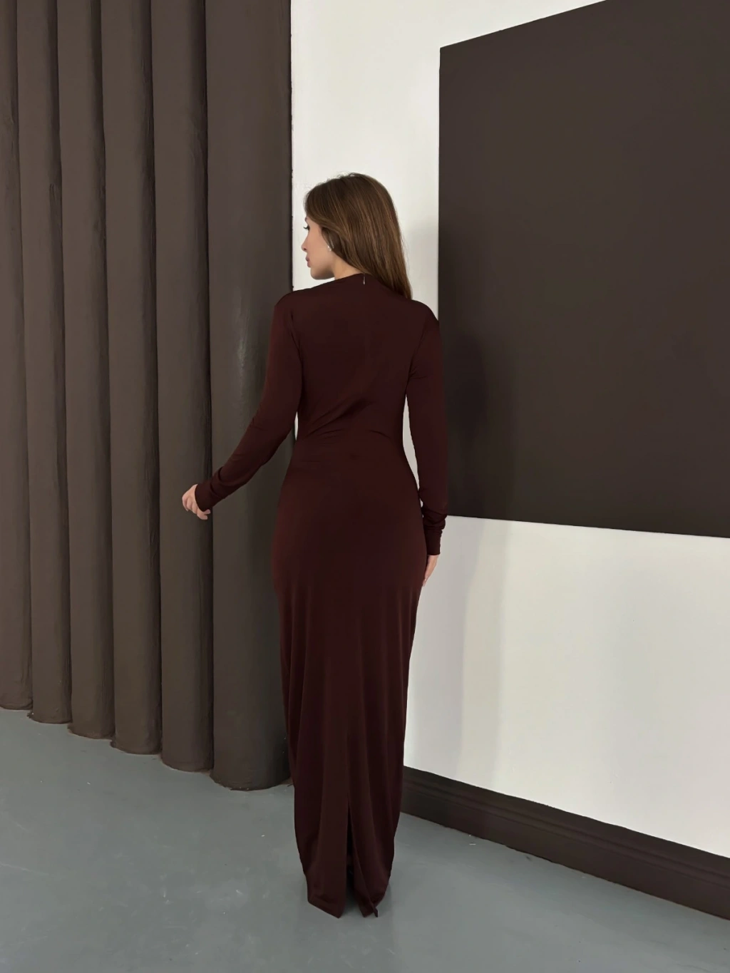 Toka Detaylı Sandy Uzun Elbise Acı Kahve