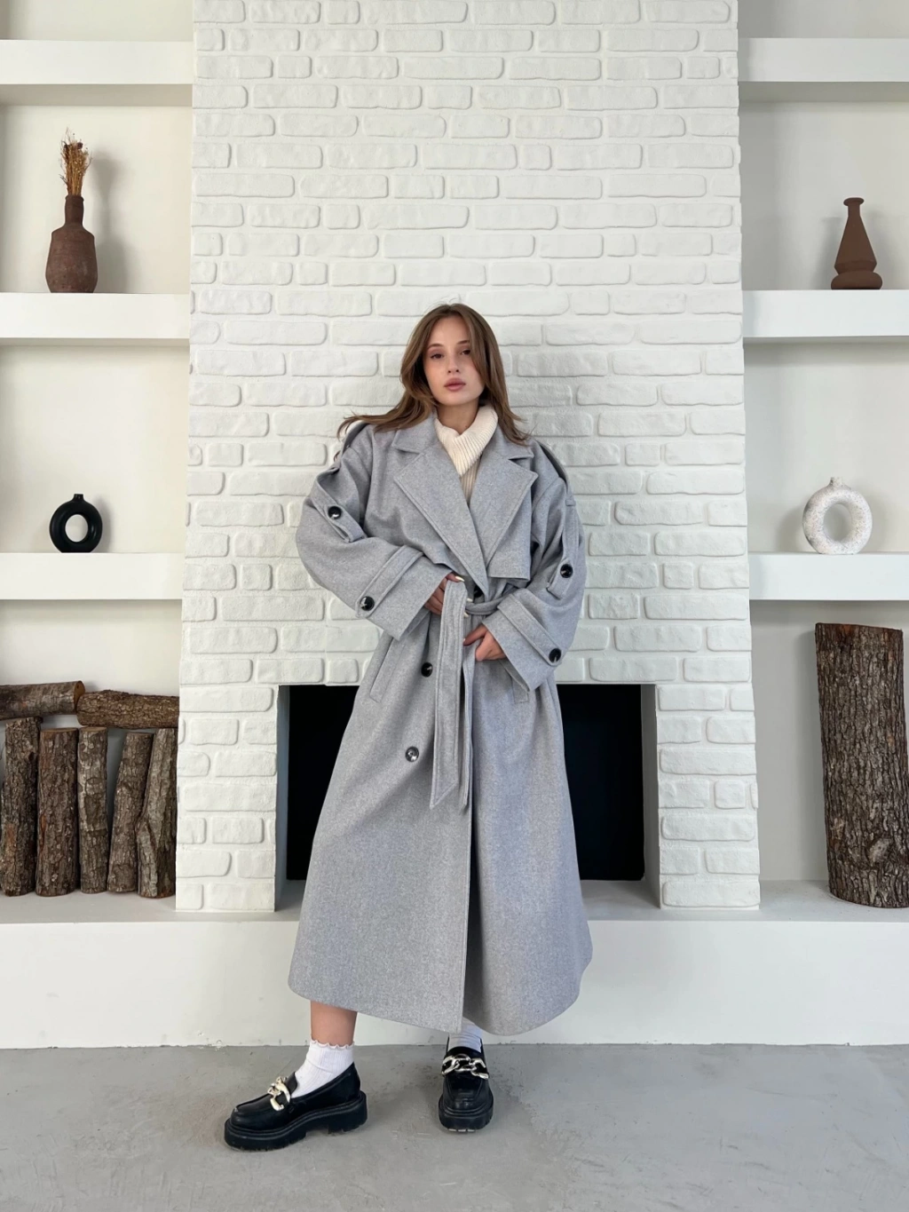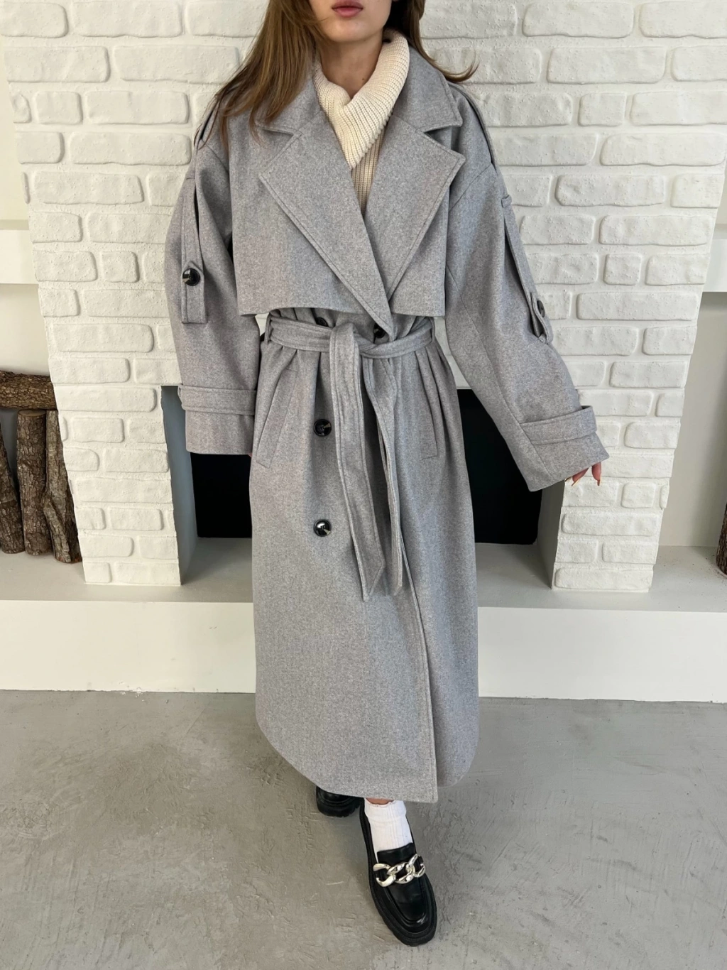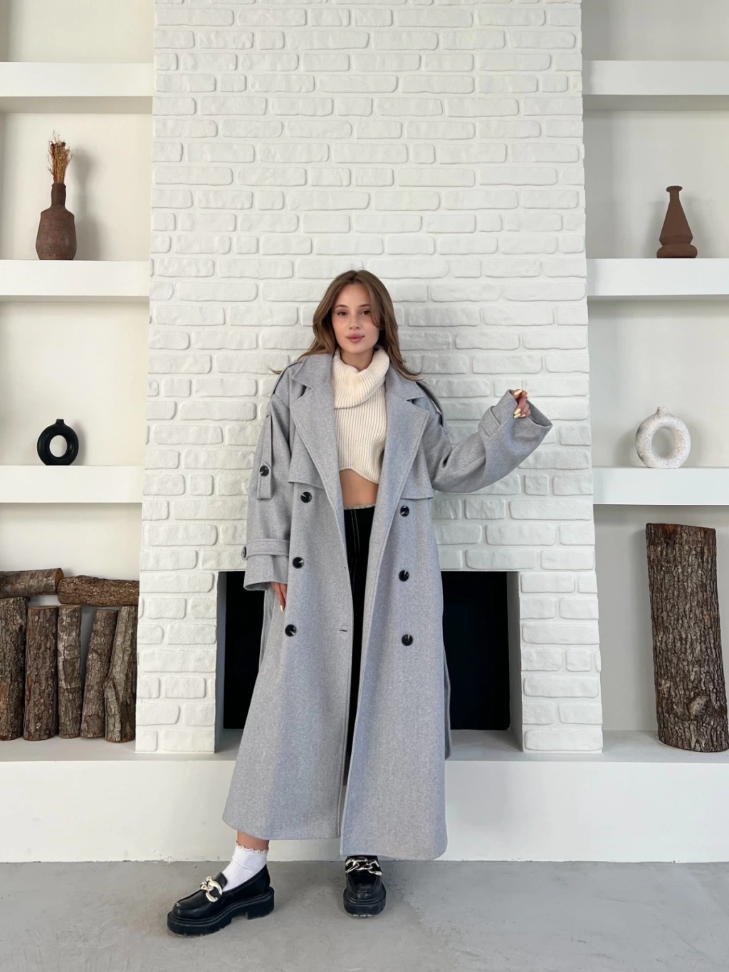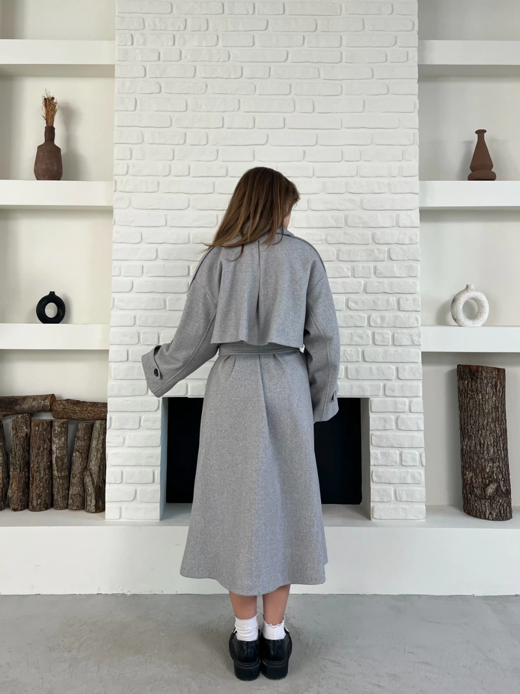 Uzun Boy Kuşak Detaylı Kaban Gri