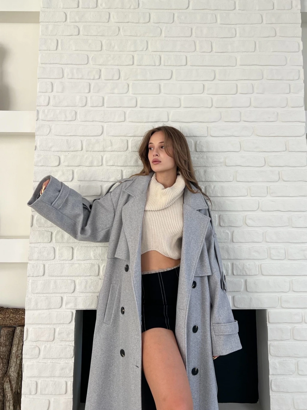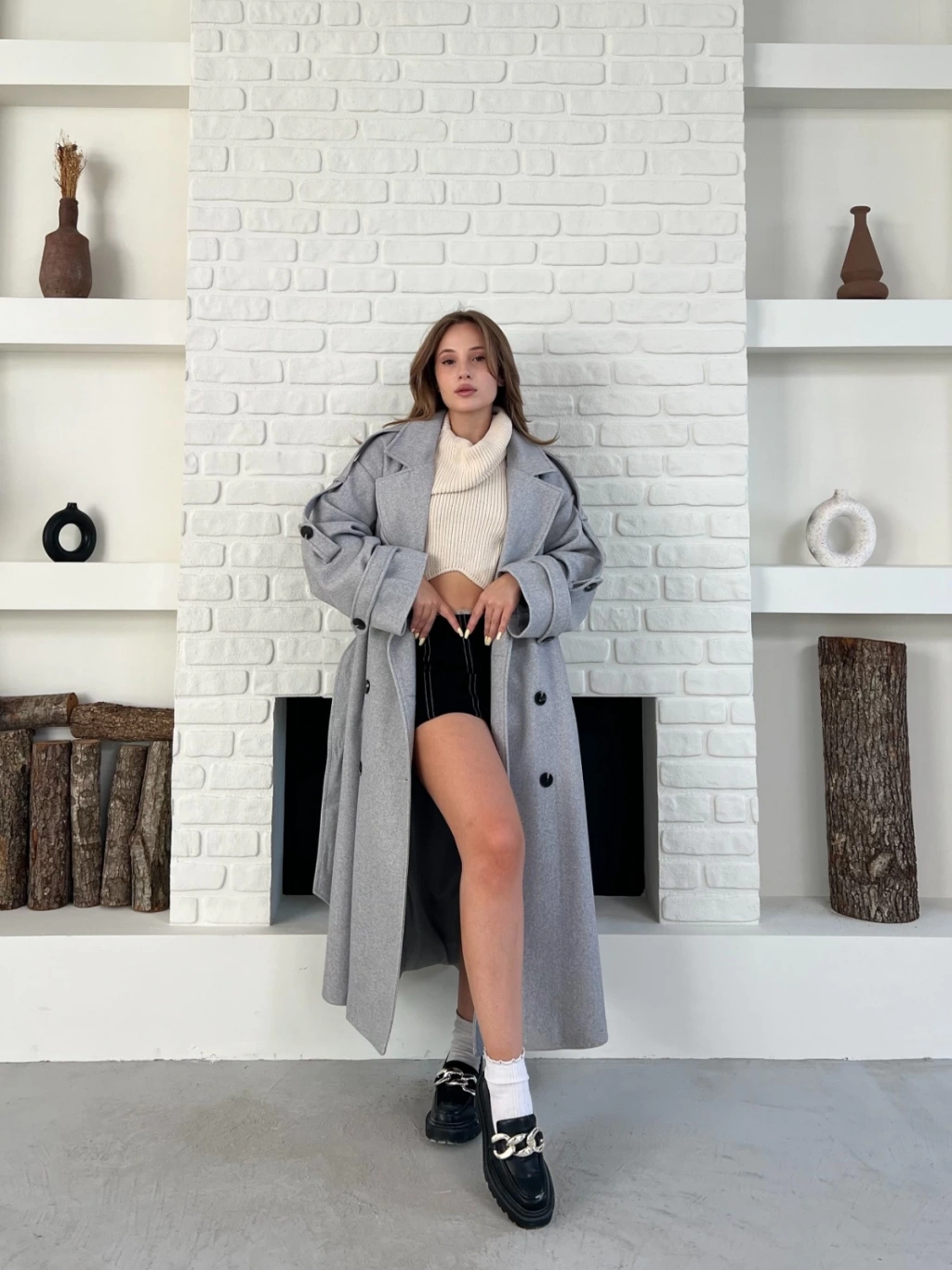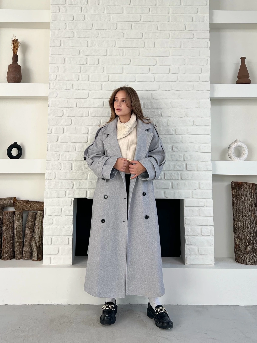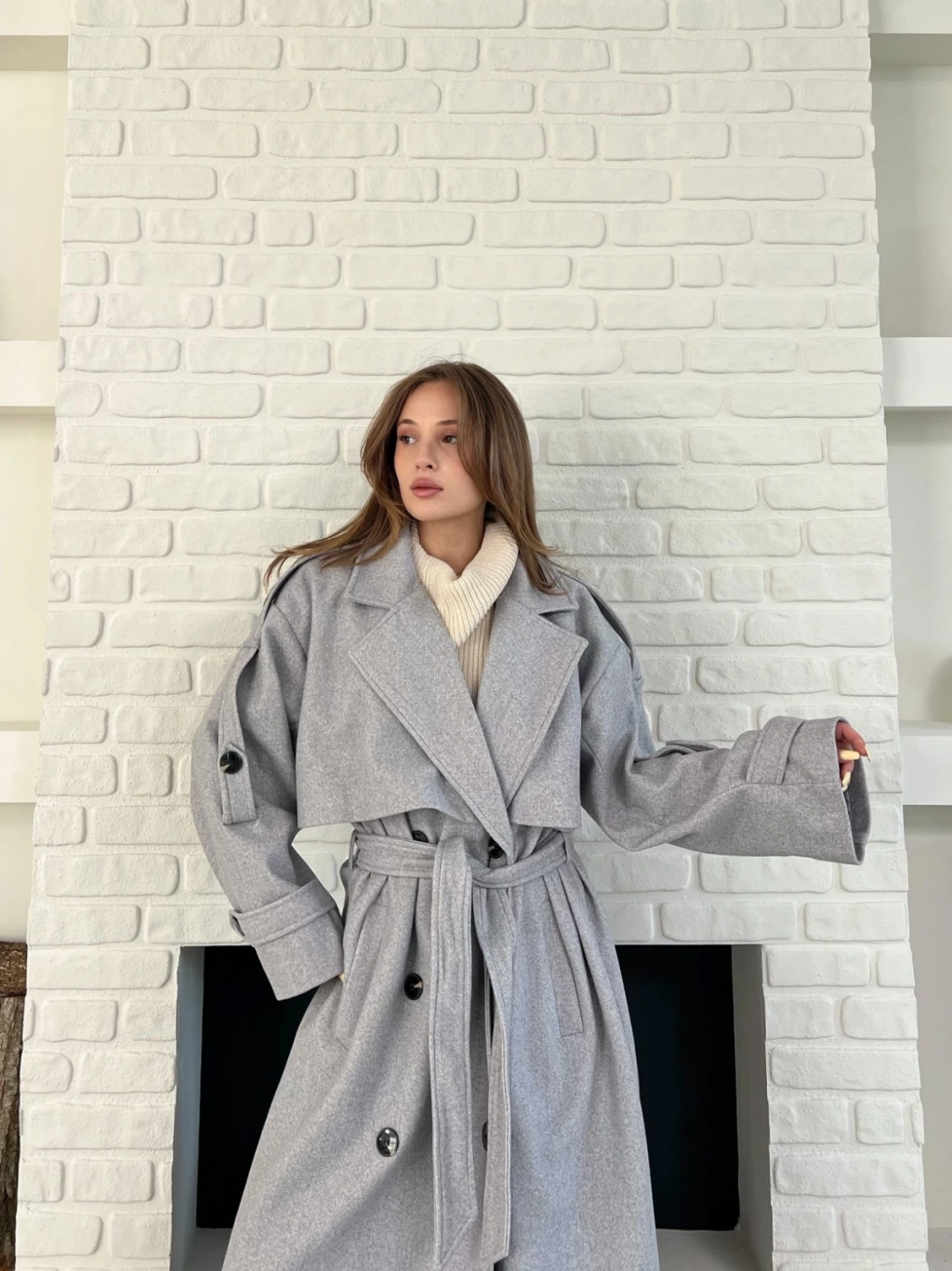 Uzun Boy Kuşak Detaylı Kaban Gri