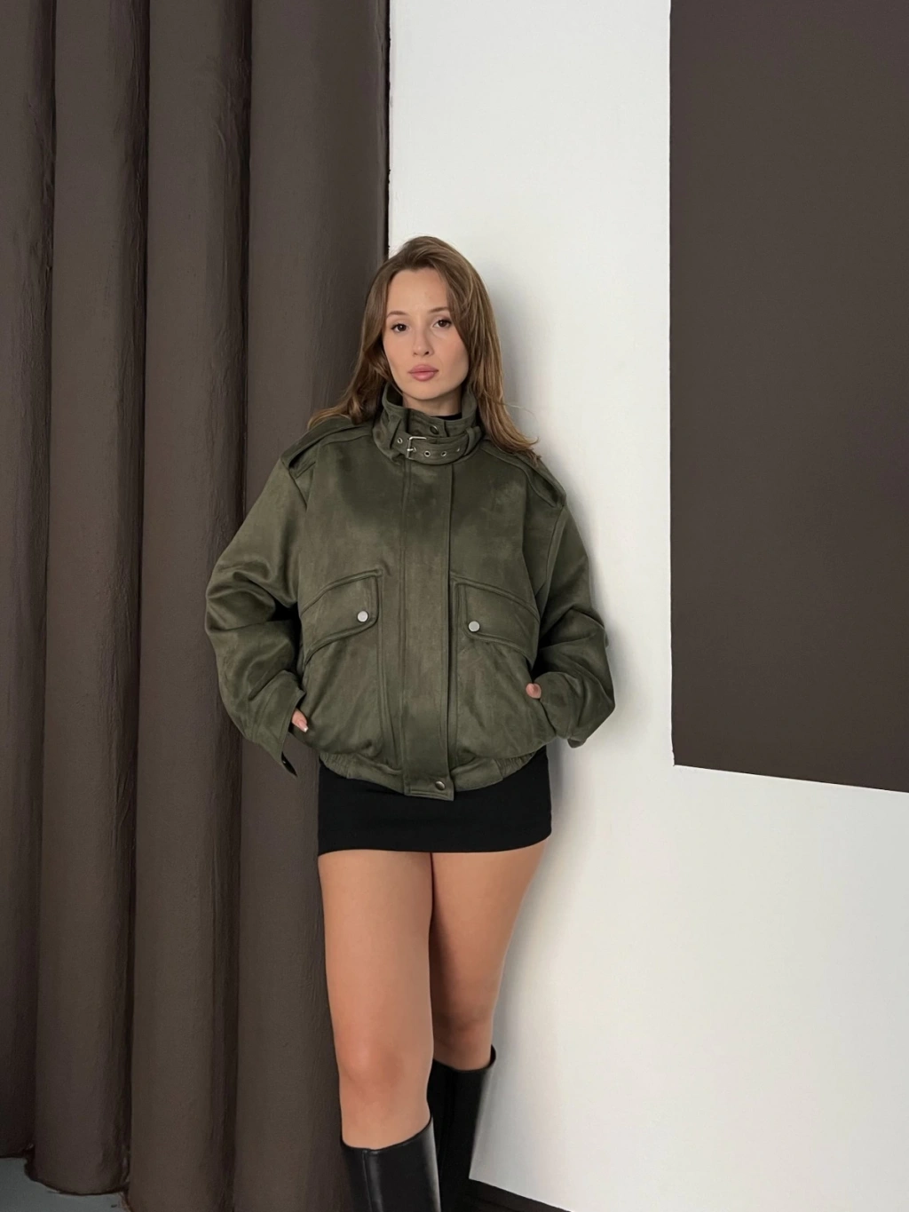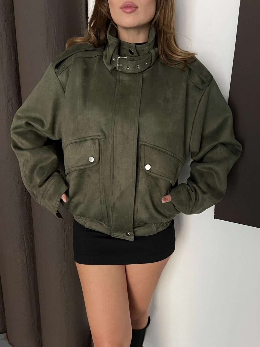 Yaka Kemer Detaylı Cepli Nubuk Ceket Haki