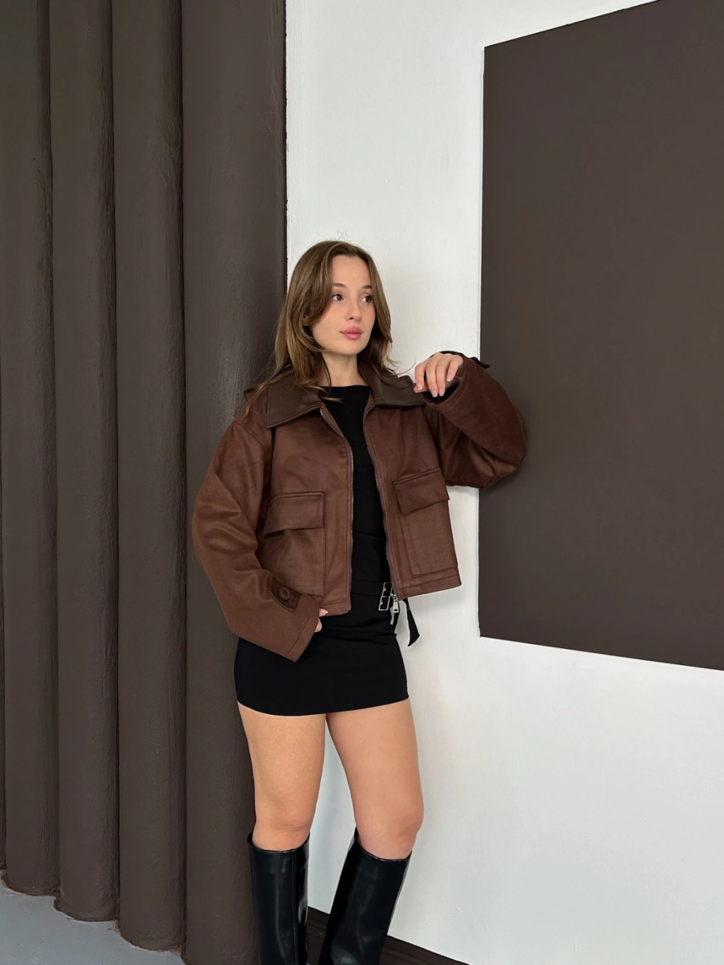 Kruvaze Yaka Cepli Kısa Kaşe Ceket Kahve